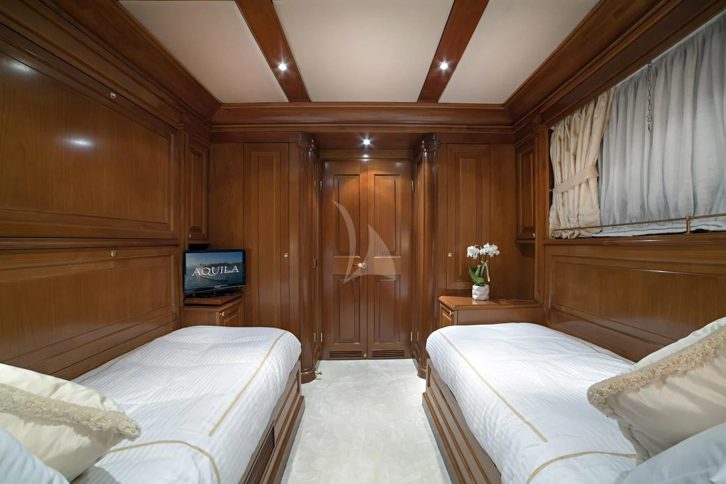 AQUILA boasts five beautifully appointed cabins capable of accommodating up to twelve guests in utmost comfort. Each cabin is designed as a private retreat offering serene views and sumptuous furnishings that encourage relaxation after a day filled with adventure on the high seas. The master stateroom stands out as an epitome of luxury living at sea – it’s spacious yet intimate layout provides not just comfort but also privacy for its esteemed occupants.