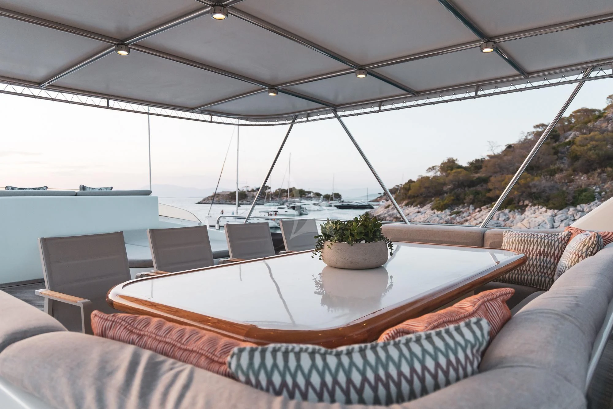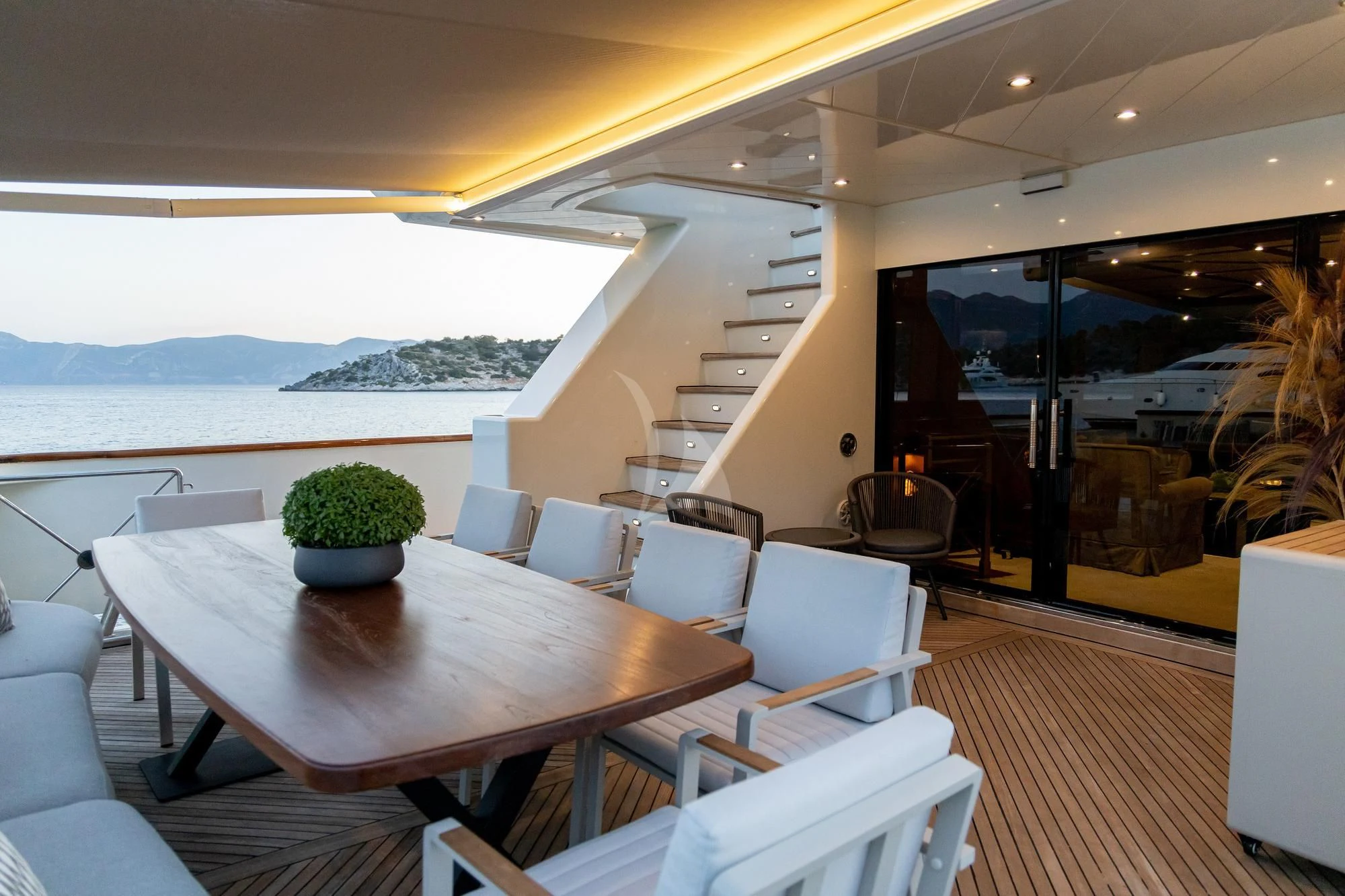 AQUILA's exterior design is nothing short of breathtaking, characterized by sleek lines that blend seamlessly with sophisticated curves for a strikingly elegant profile. Her expansive sundeck offers ample space for sunbathing or enjoying refreshing cocktails under the setting sun, while her alfresco dining areas provide the perfect setting for memorable meals against stunning oceanic backdrops. Notable exterior features include her spacious lounging areas where guests can indulge in tranquil moments amidst nature's grandeur.