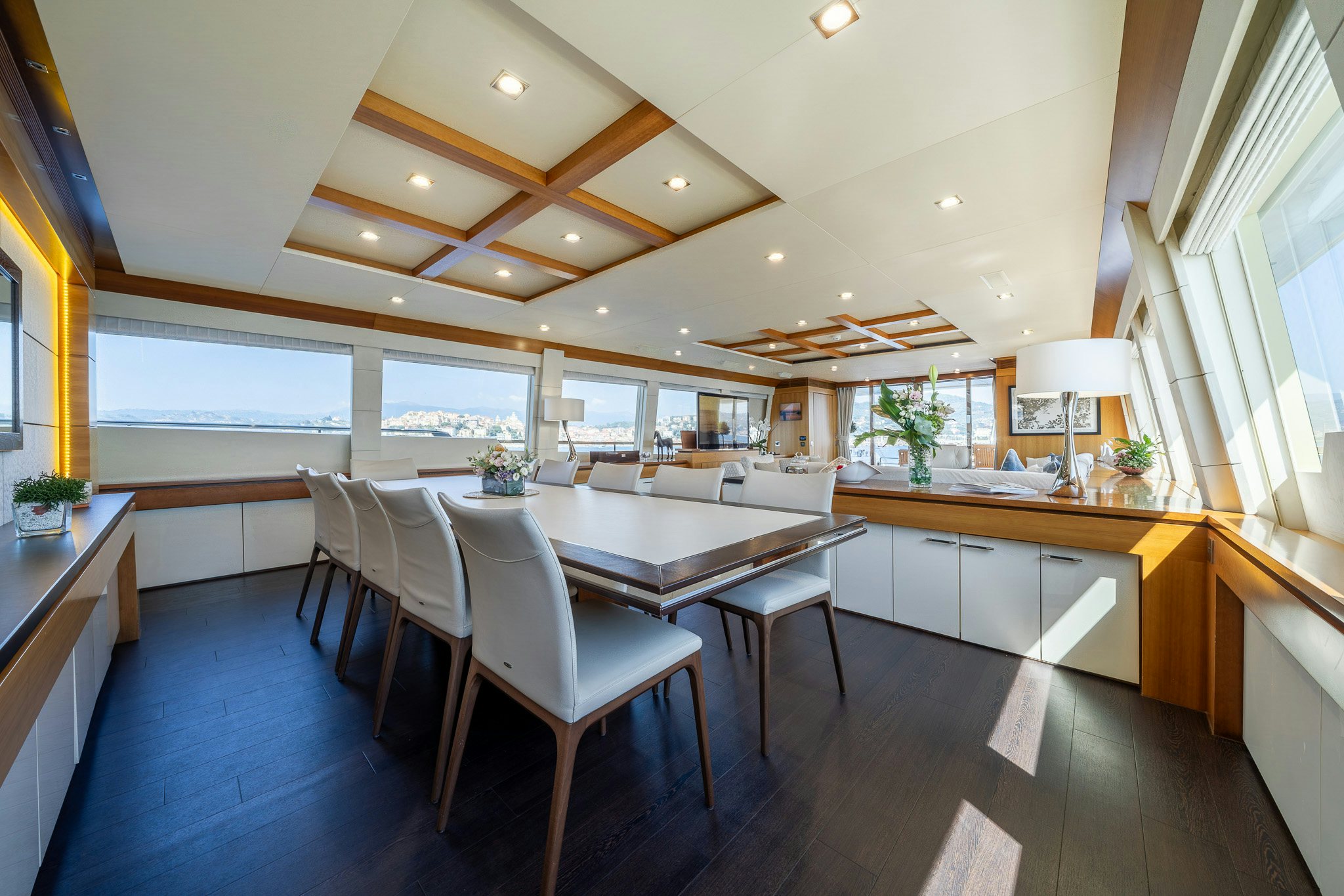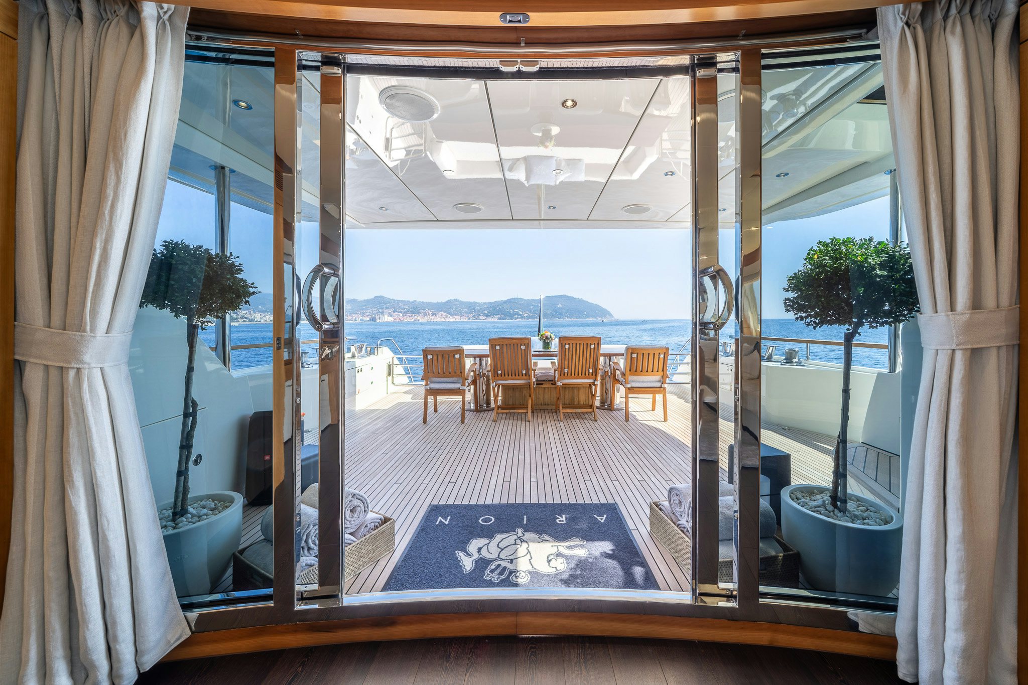 Inside, ARION’s contemporary interior was designed by award-winning Ken Freivokh. Large windows flood the main salon with natural light, highlighting the rich blend of cherry and wenge woods with soft, neutral furnishings. The open layout creates a welcoming atmosphere, equally suited to intimate family evenings or sophisticated entertaining. At the heart of the salon is a custom-made wenge dining table, seating 12 people, complemented by a matching mirror that adds depth and elegance to the space.