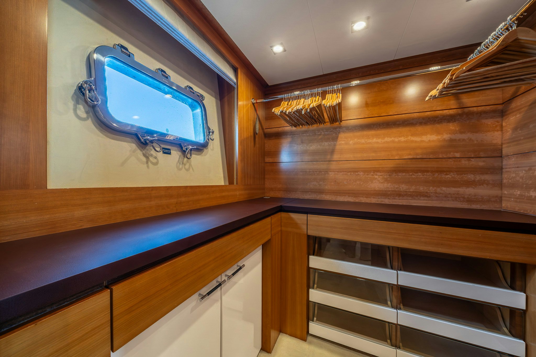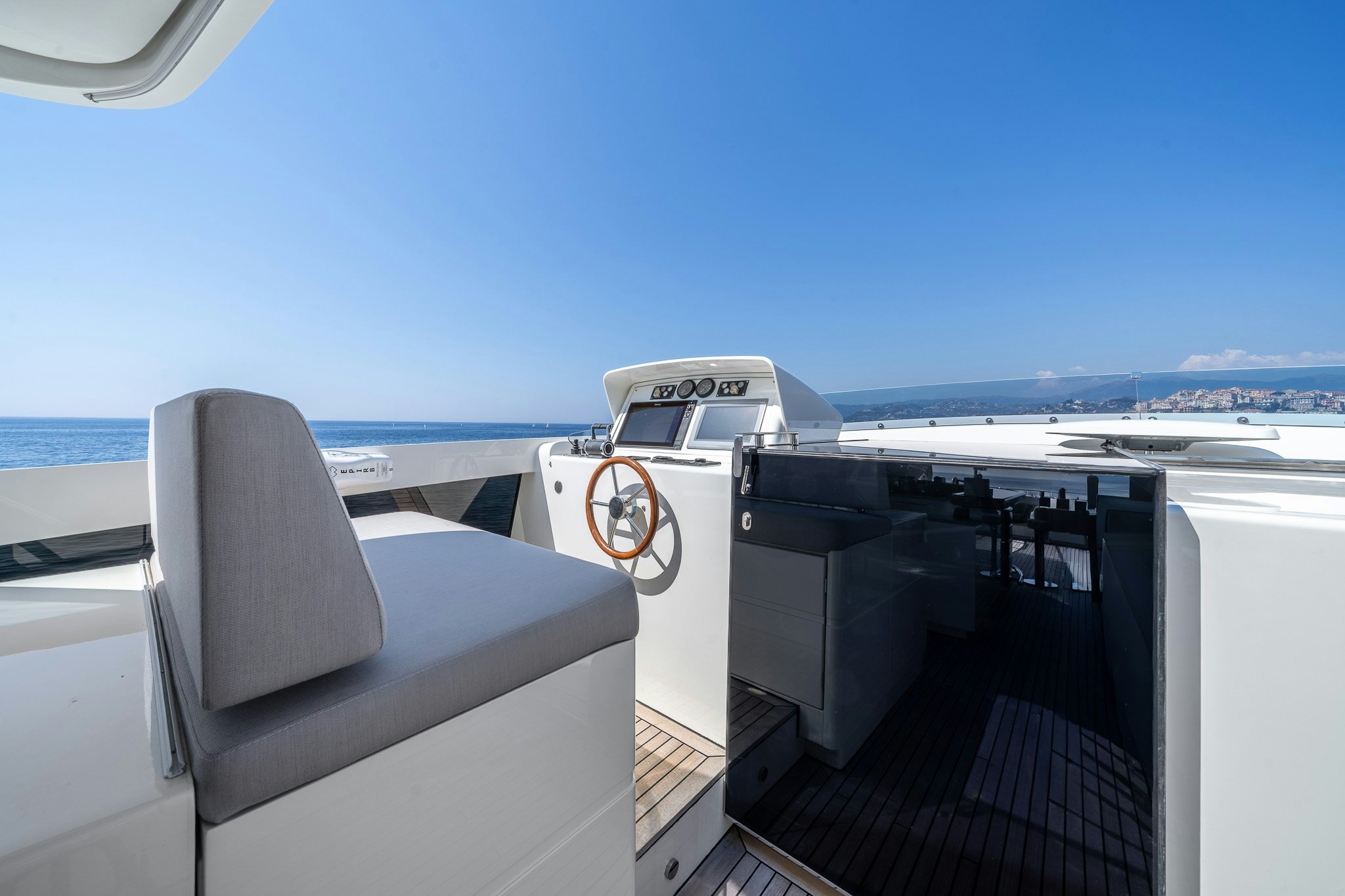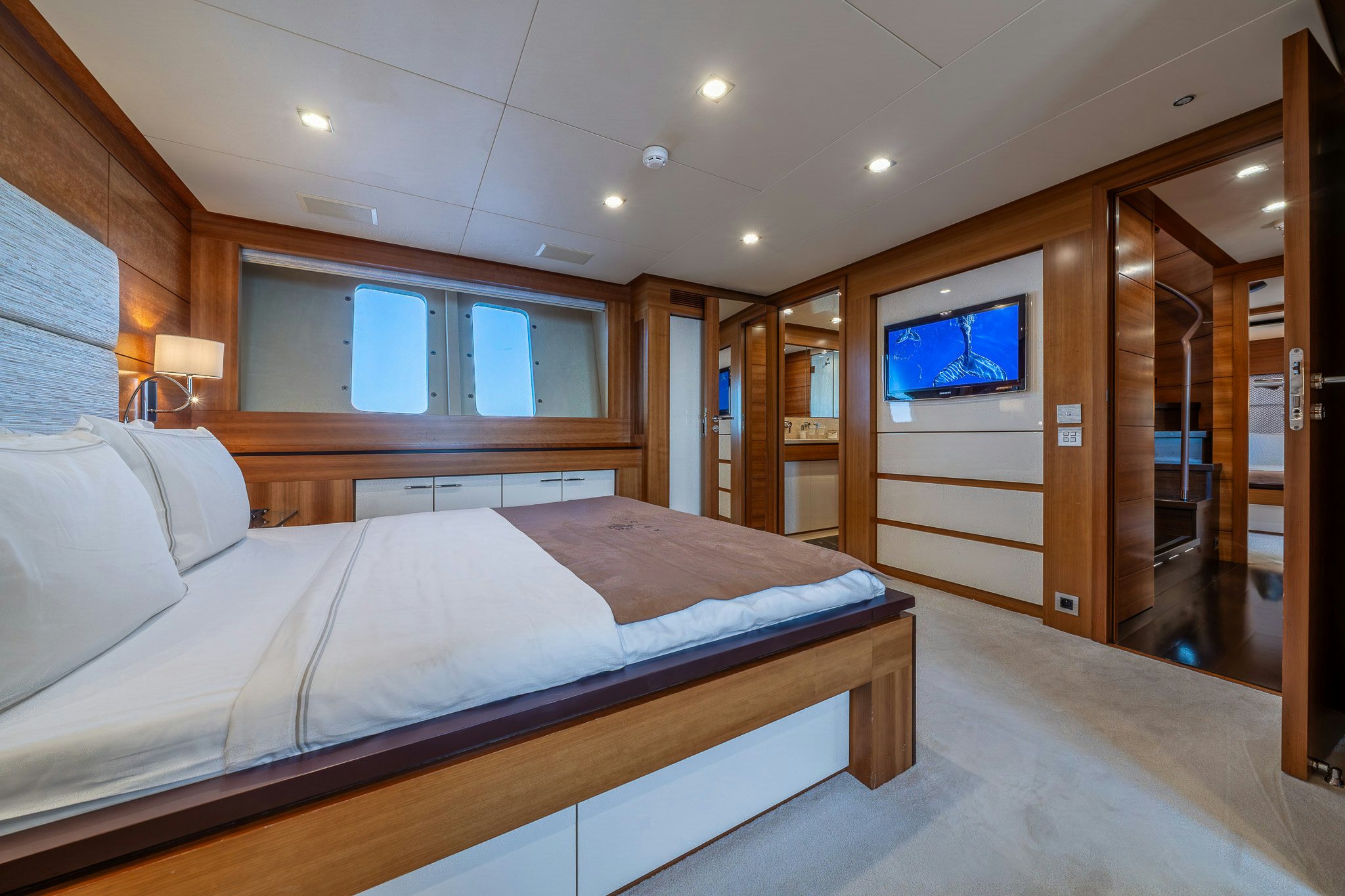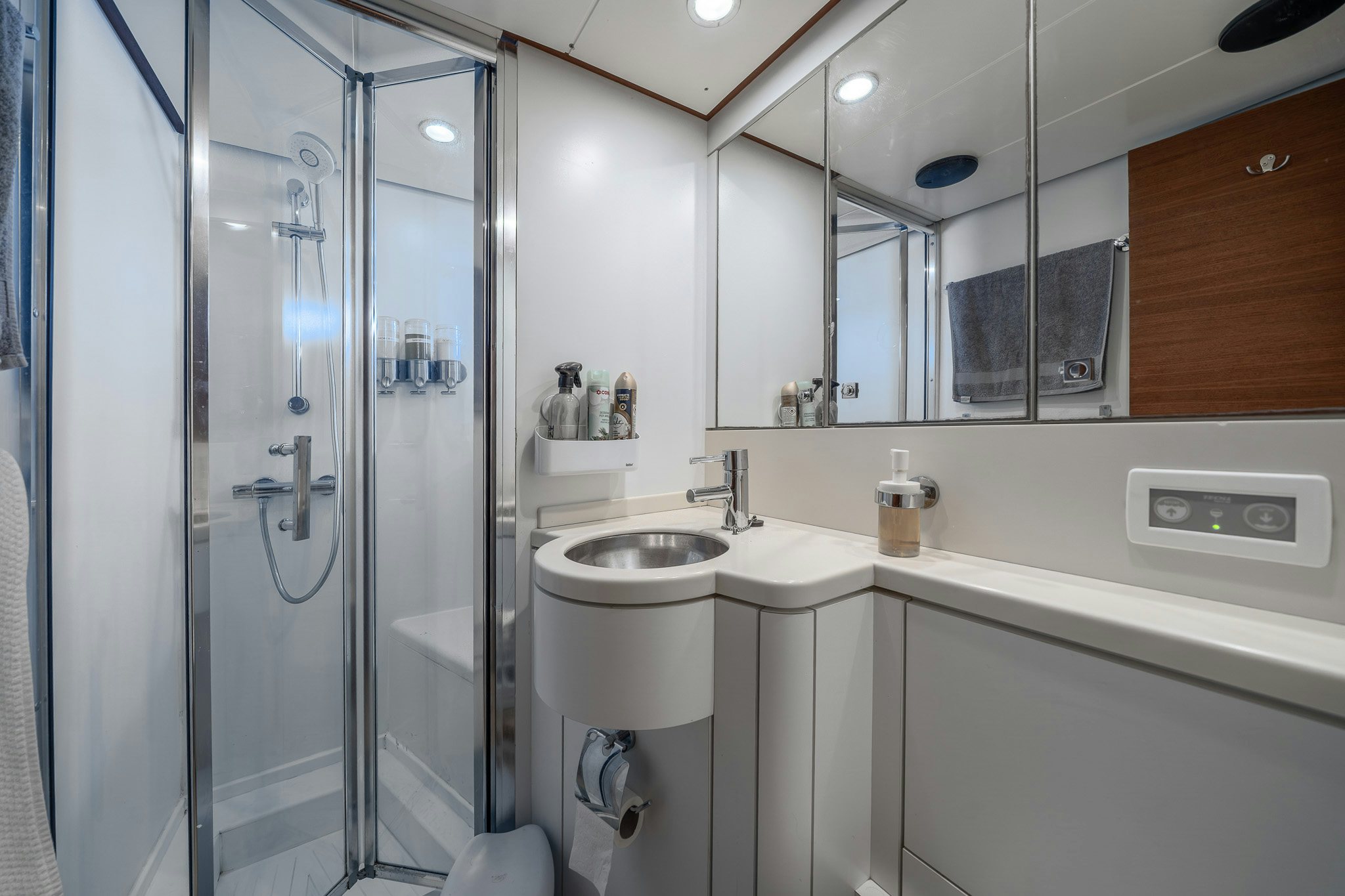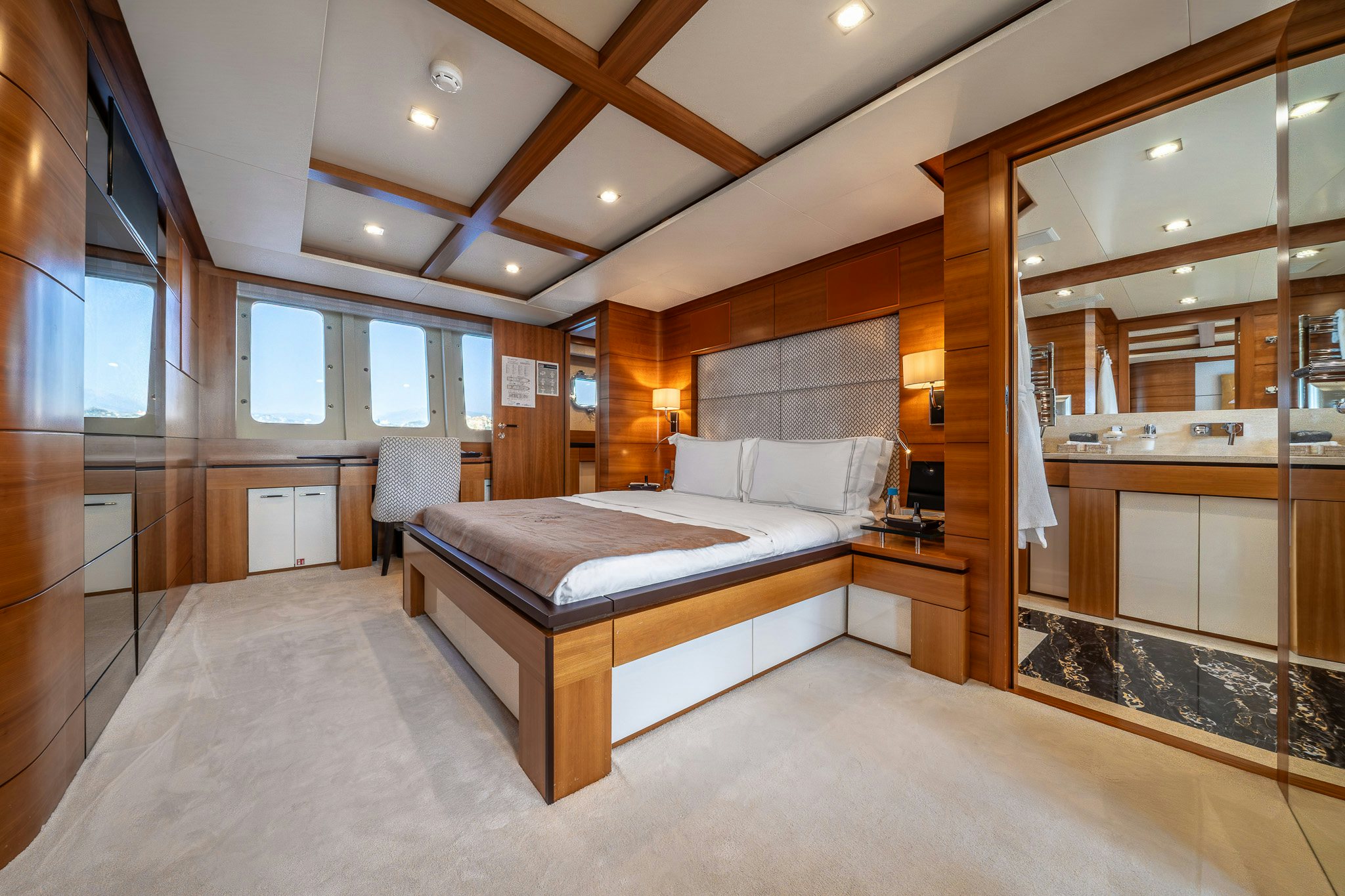 Guest accommodation is arranged across four spacious staterooms for up to nine guests. The full-beam master suite on the lower deck includes an Olympic queen-size bed, a private lounge area and a spacious ensuite bathroom. A VIP suite with its own ensuite is located on the main deck, offering excellent views and easy access. Another full-beam VIP is found aft on the lower deck, also featuring an Olympic queen-size bed, lounge area and ensuite. Completing the layout is a twin cabin on the port side with a pullman.