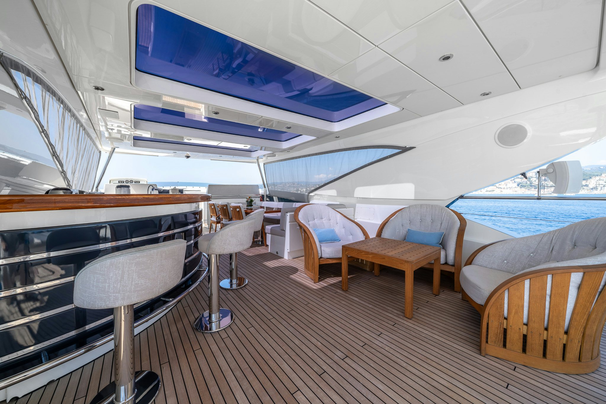 The aft deck provides another dining area, while the foredeck adds a more private retreat with additional sunbeds. A generous swim platform connects directly to the sea and her garage, which is equipped with a Williams 505 Diesel jet tender, a Yamaha Jetski Cruiser and a Fliteboard e-foil for guests who enjoy staying active.