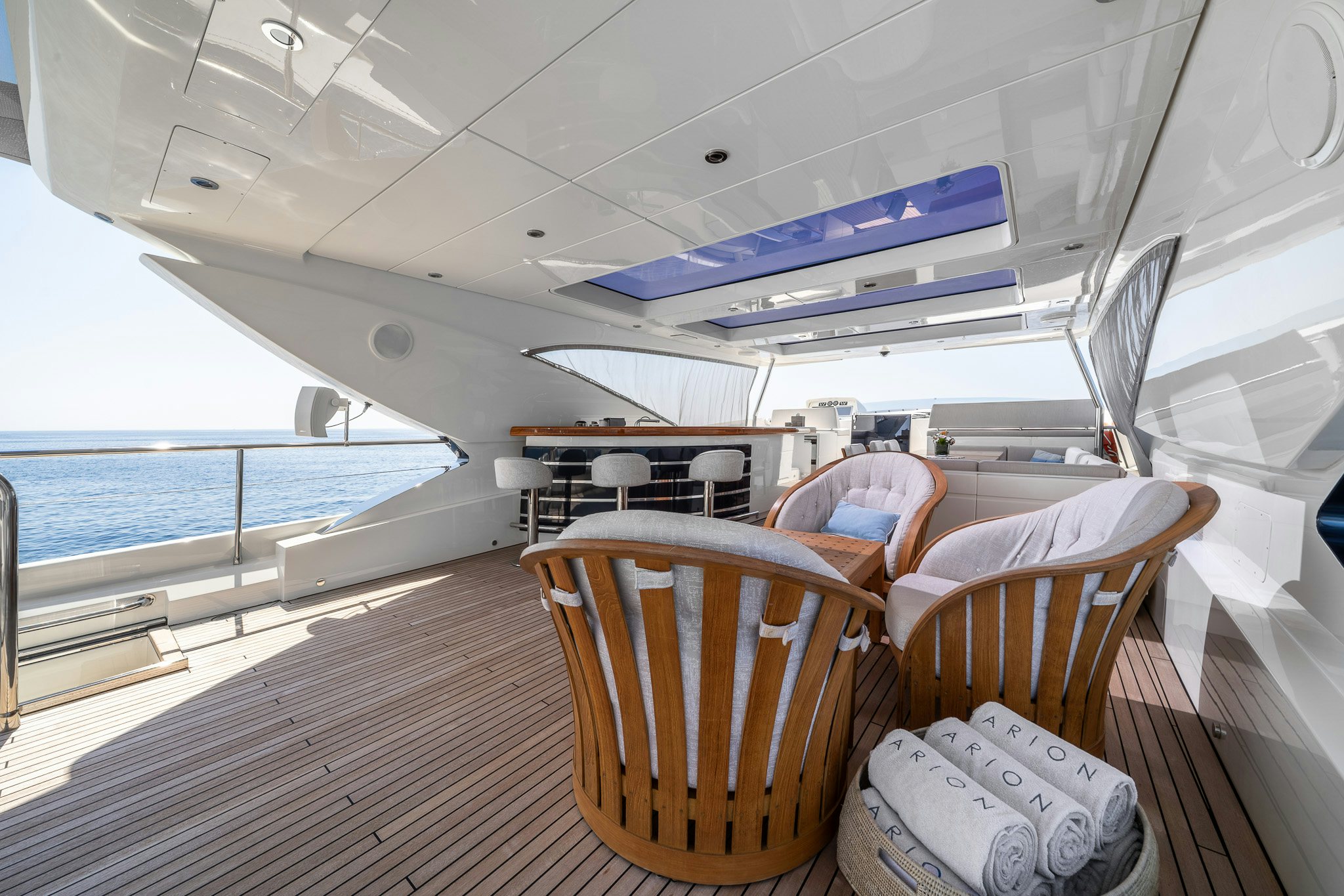The sundeck is where ARION truly comes to life. A sturdy hardtop with skylights filters the sunlight, creating a bright yet shaded retreat that’s inviting from morning through evening. Guests can enjoy alfresco dining for ten, a large bar and expansive sunpads perfect for soaking in the sun. The layout is versatile enough for quiet family time, lively gatherings with friends, or elegant evening meals under the stars.