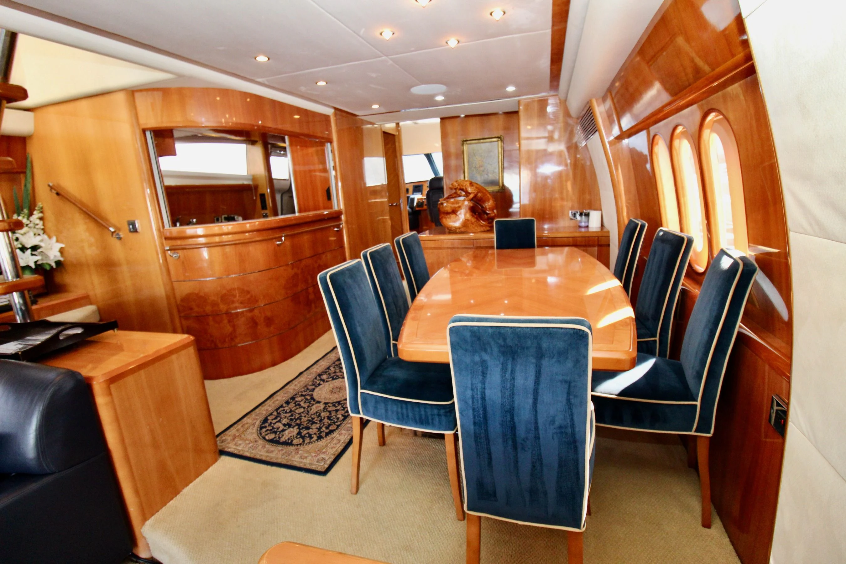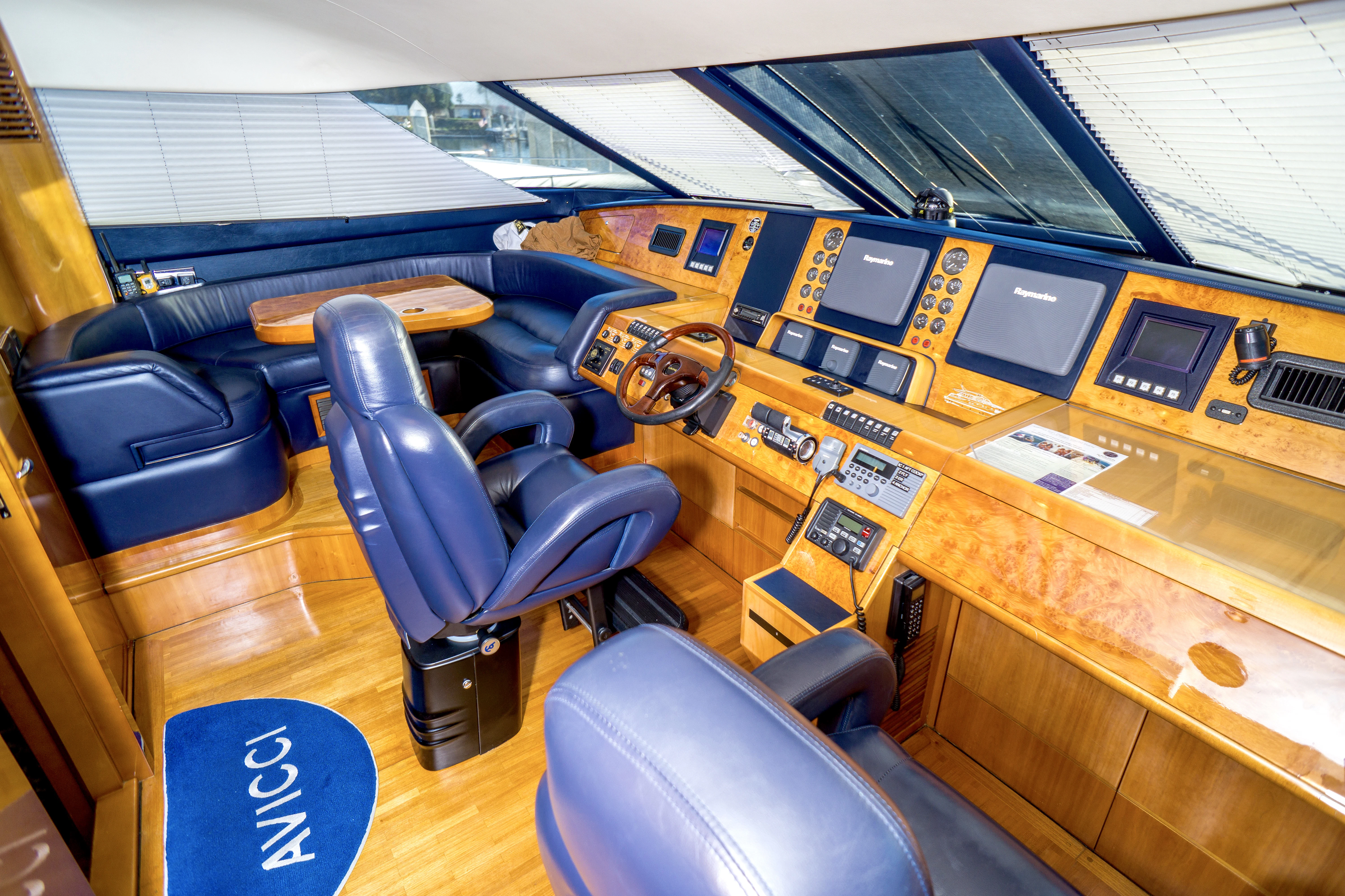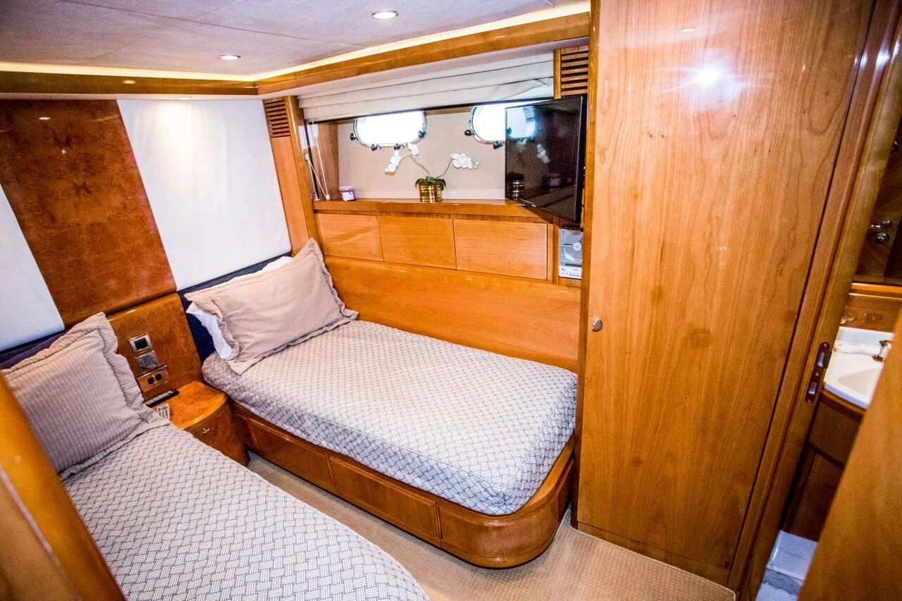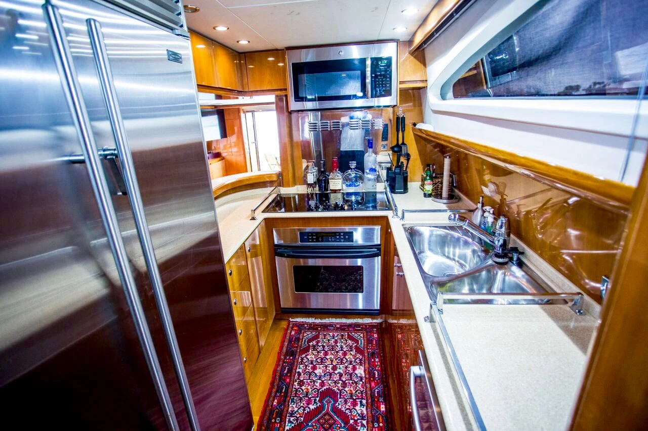The exterior design of AVICCI is nothing short of breathtaking - her GRP hull material reflecting the shimmering azure waters she gracefully glides through. Her flybridge subcategory suggests a generous deck area that offers panoramic views of the surroundings. On this sun-drenched space, guests can unwind in plush seating areas or soak up the sun's rays on comfortable loungers. The pièce de résistance is undoubtedly the inviting Jacuzzi - an oasis of relaxation that adds an undeniable touch of luxury to your yachting experience.
