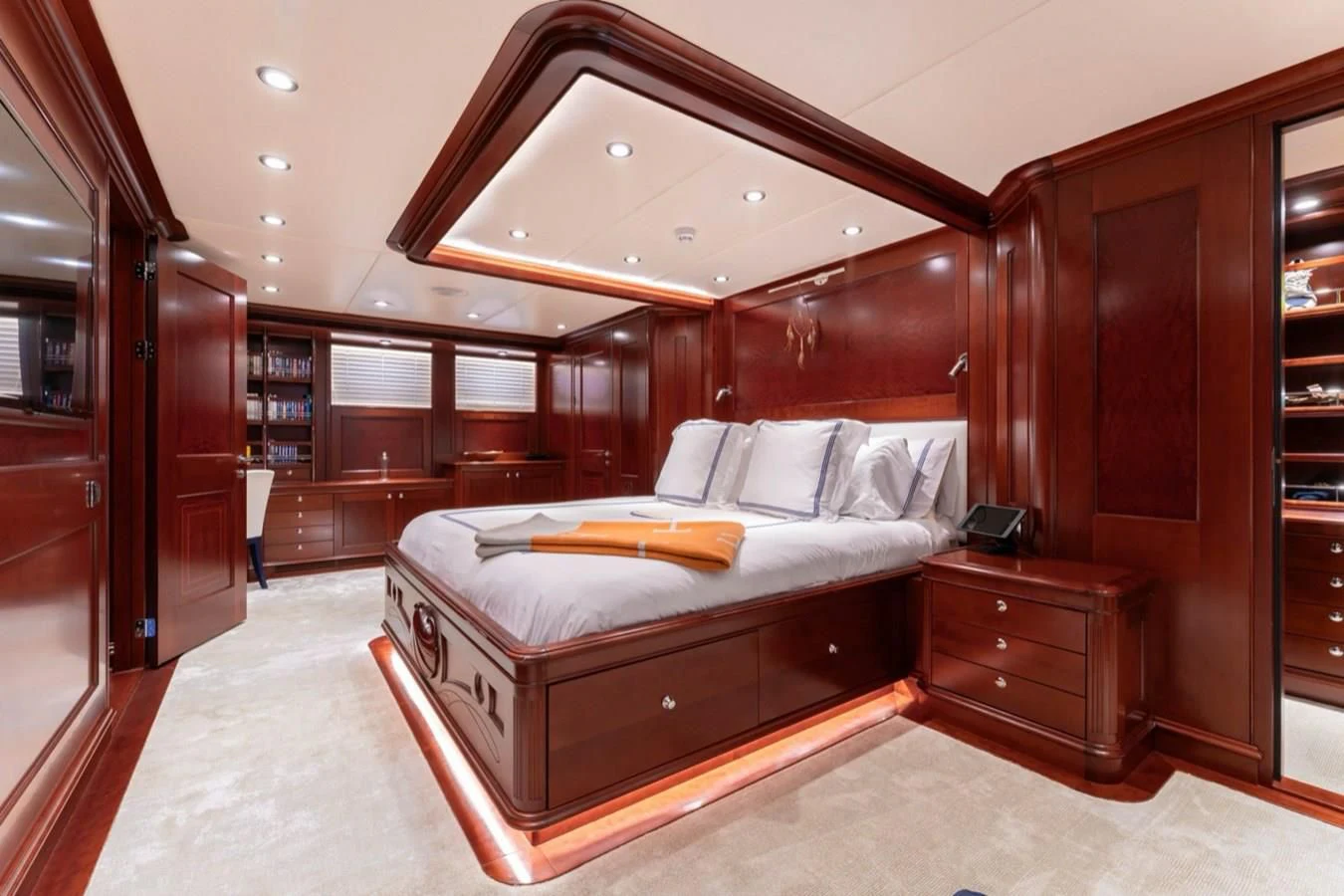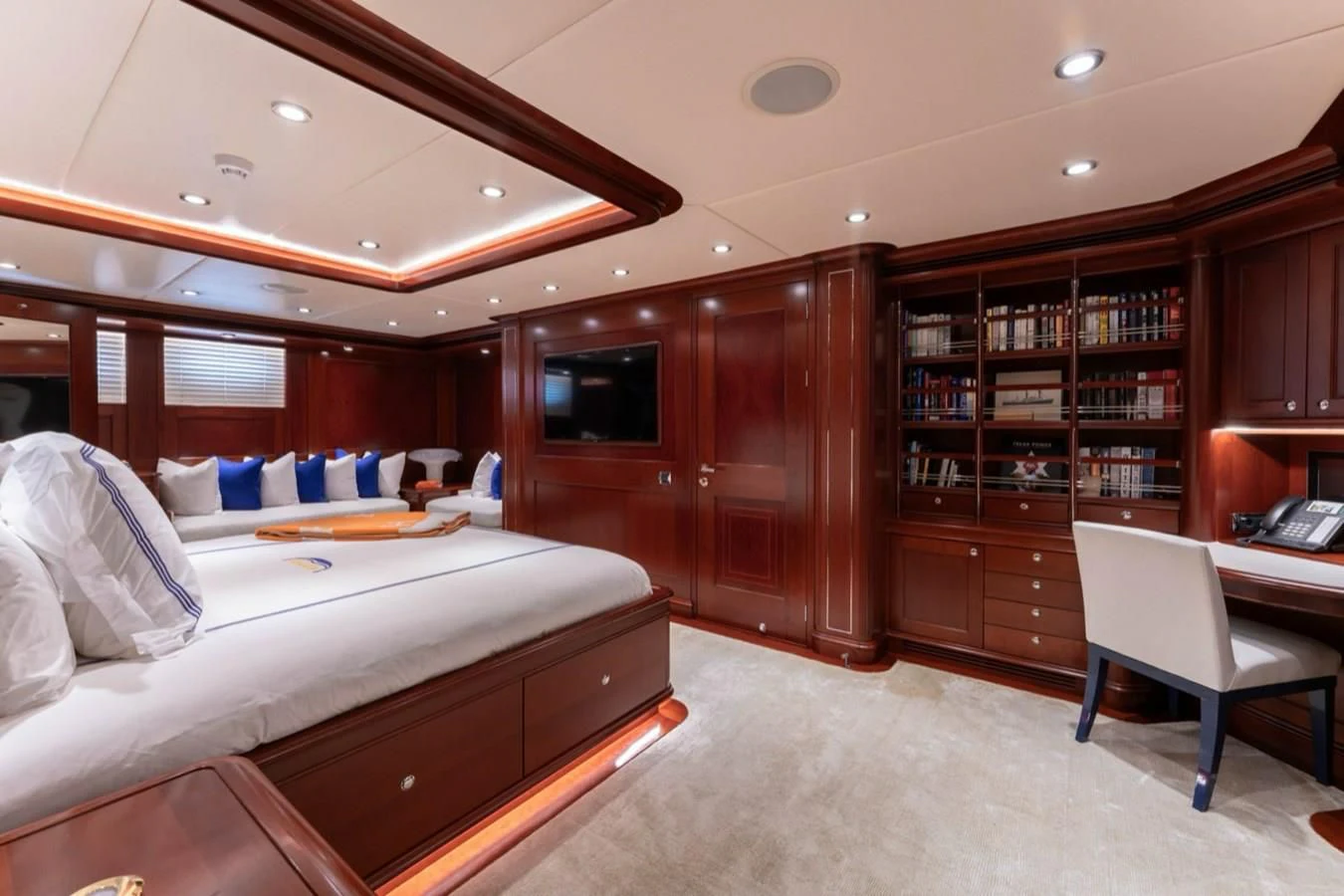 As you step inside BEOTHUK, you are welcomed into an interior that exudes elegance and warmth. The color palette subtly mirrors the hues of the sea with shades of blue accentuating neutral tones. Each room boasts unique design elements that create a serene ambiance for guests to unwind after a day full of adventure. This stunning yacht can accommodate up to six guests across three cabins including a lavish master stateroom equipped with state-of-the-art amenities for unrivaled comfort.