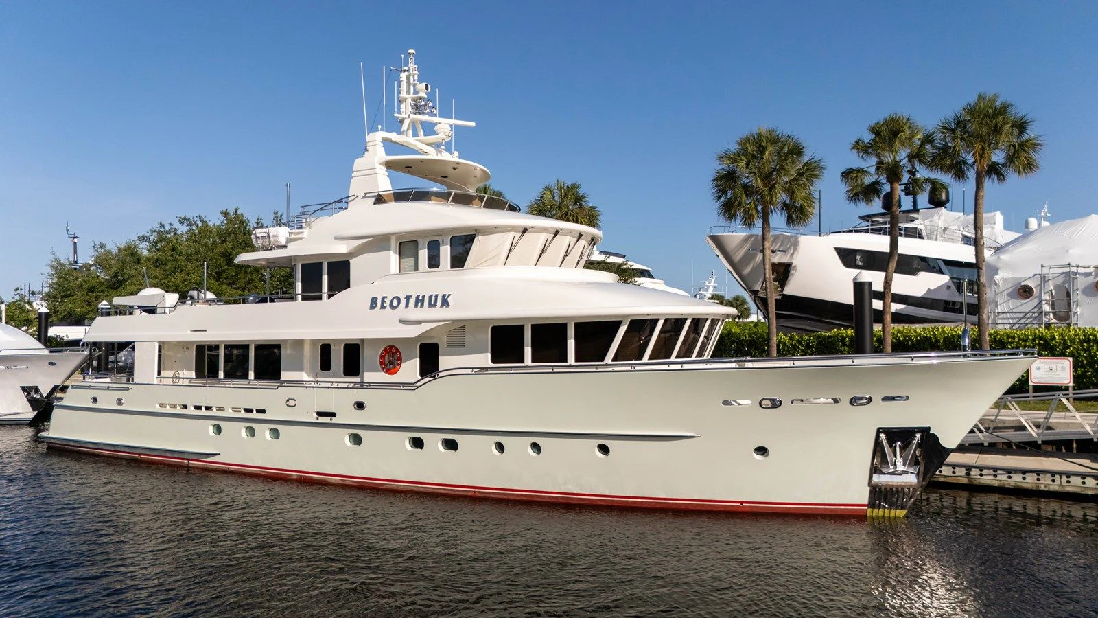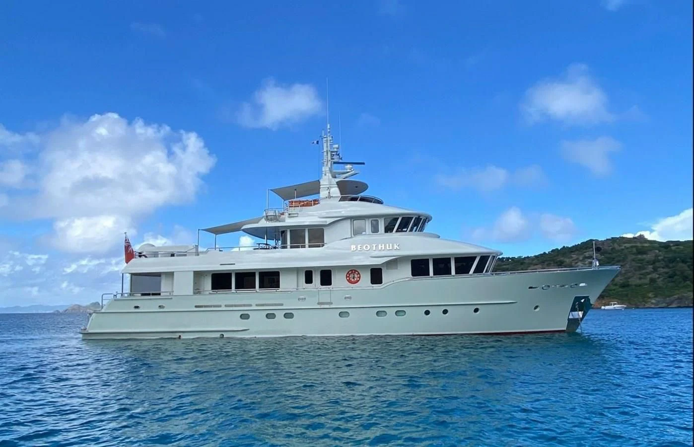 Introducing the grandeur of BEOTHUK, a 101-foot custom-built expedition yacht that epitomizes luxury and adventure at sea. Launched in 2008 by renowned Dutch shipyard Kuipers Woudsend, this remarkable vessel is an exquisite blend of superior craftsmanship and innovative design. Her exterior design, characterized by sleek lines and robust steel hull construction, is a testament to her expedition yacht pedigree.