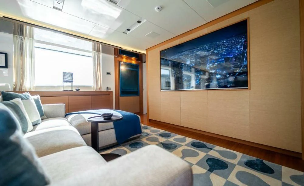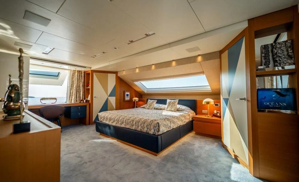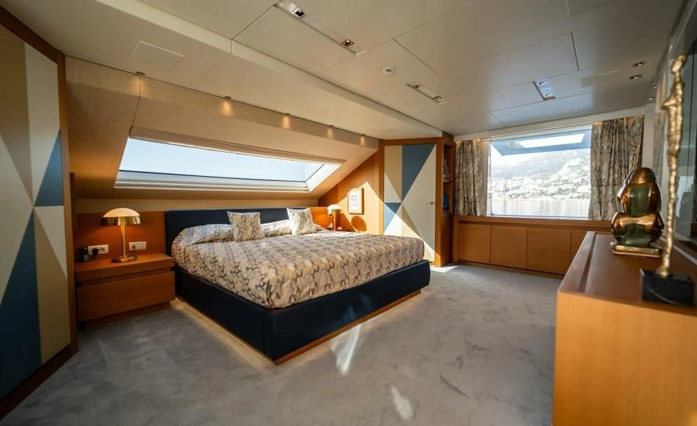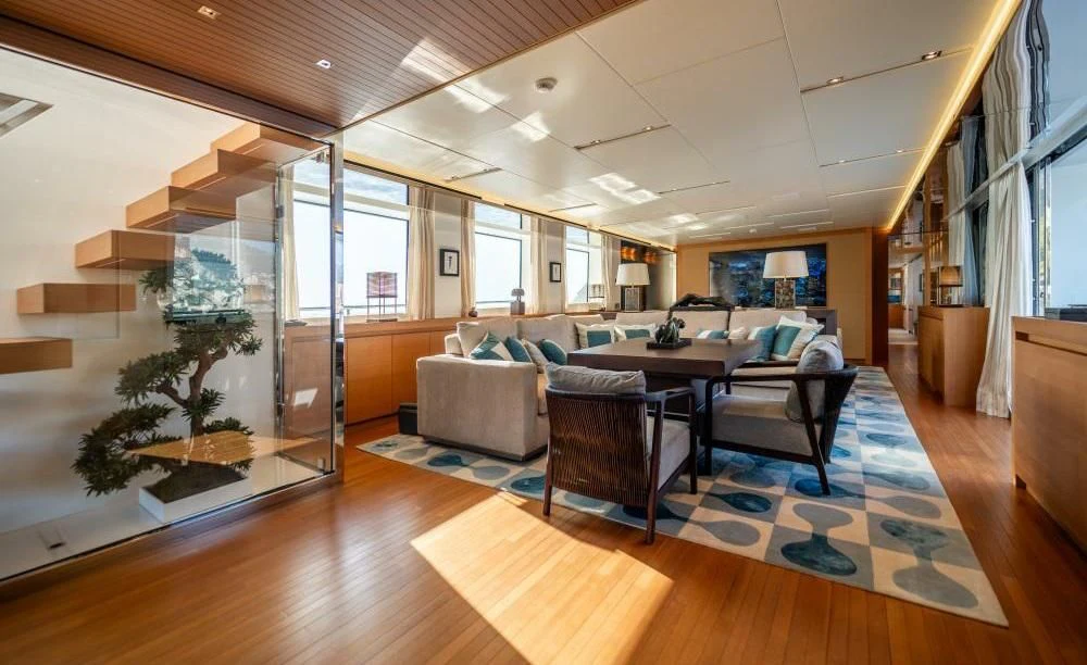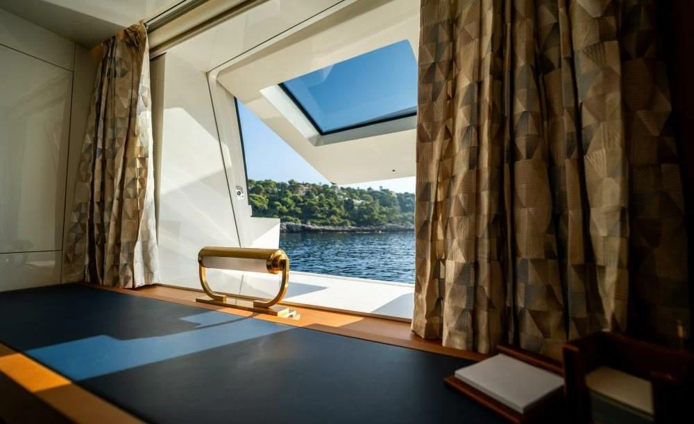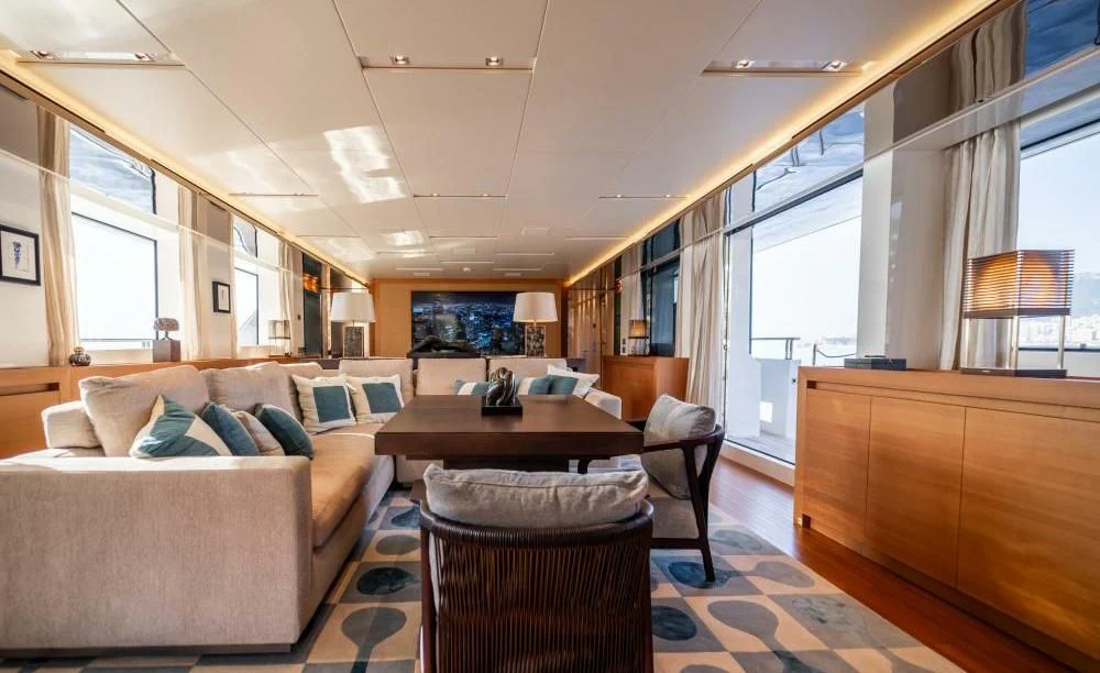 Step inside BLUES and be prepared to be enthralled by its luxurious interiors that exude warmth and opulence. Designed meticulously with keen attention paid to every minute detail, the interior style seamlessly blends contemporary design elements with timeless elegance. A soothing color palette dominated by shades of cream and beige interspersed with touches of BLUES creates an inviting ambiance throughout this floating paradise. Accommodating up to 10 guests in utmost comfort, BLUES features five beautifully appointed cabins including a lavish master stateroom boasting floor-to-ceiling windows offering breathtaking views along with four additional staterooms each reflecting unique charm.