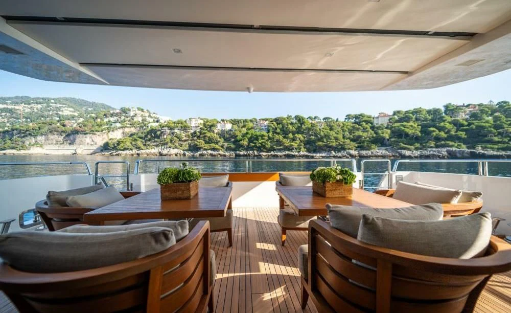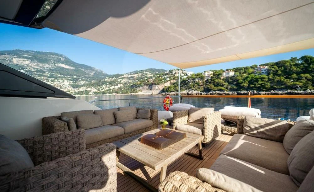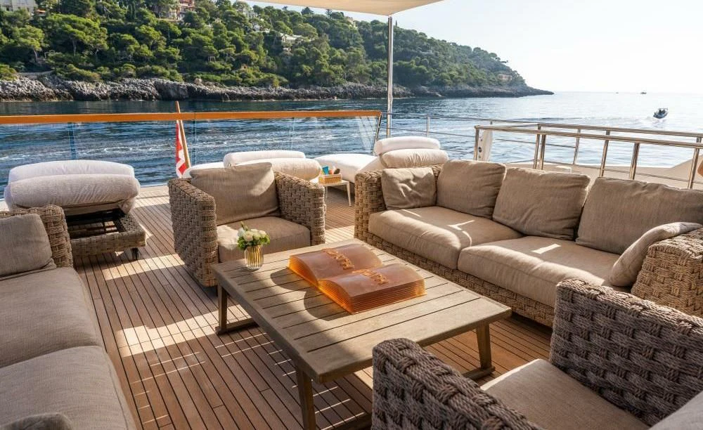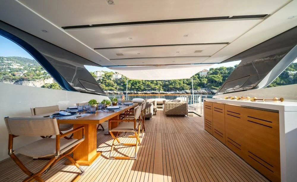 The expansive exterior spaces on BLUES are designed to offer unparalleled experiences at sea. The sundeck serves as an ideal spot for sun worshipers looking to soak up some rays or for those who simply wish to enjoy the panoramic views from the top deck jacuzzi. Alfresco dining areas are thoughtfully spread across the decks allowing guests to dine under the stars amidst gentle ocean breezes. The lounging areas provide perfect settings for relaxation or social gatherings with plush seating arrangements complemented by state-of-the-art entertainment systems.