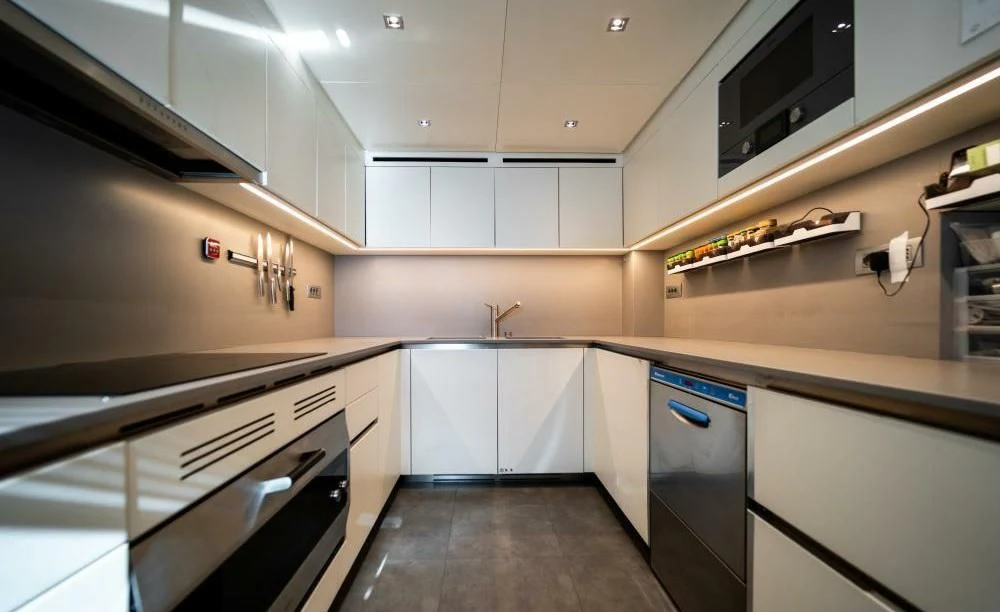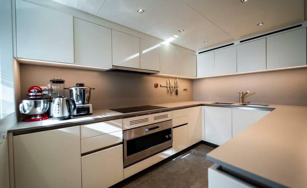BLUES offers more than just luxurious accommodations; it's about experiencing life at sea in its most glamorous form. The main salon adorned with plush furnishings serves as an ideal setting for socializing or unwinding after a day full of adventures at sea while savoring your favorite cocktail from the well-stocked bar onboard. A formal dining area provides an intimate setting where guests can indulge in culinary delights prepared by our expert chef onboard.