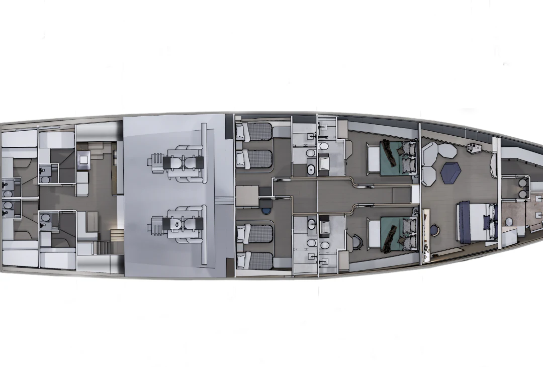 The yacht is equipped with advanced multimedia systems, allowing guests to enjoy personalized entertainment throughout the vessel.