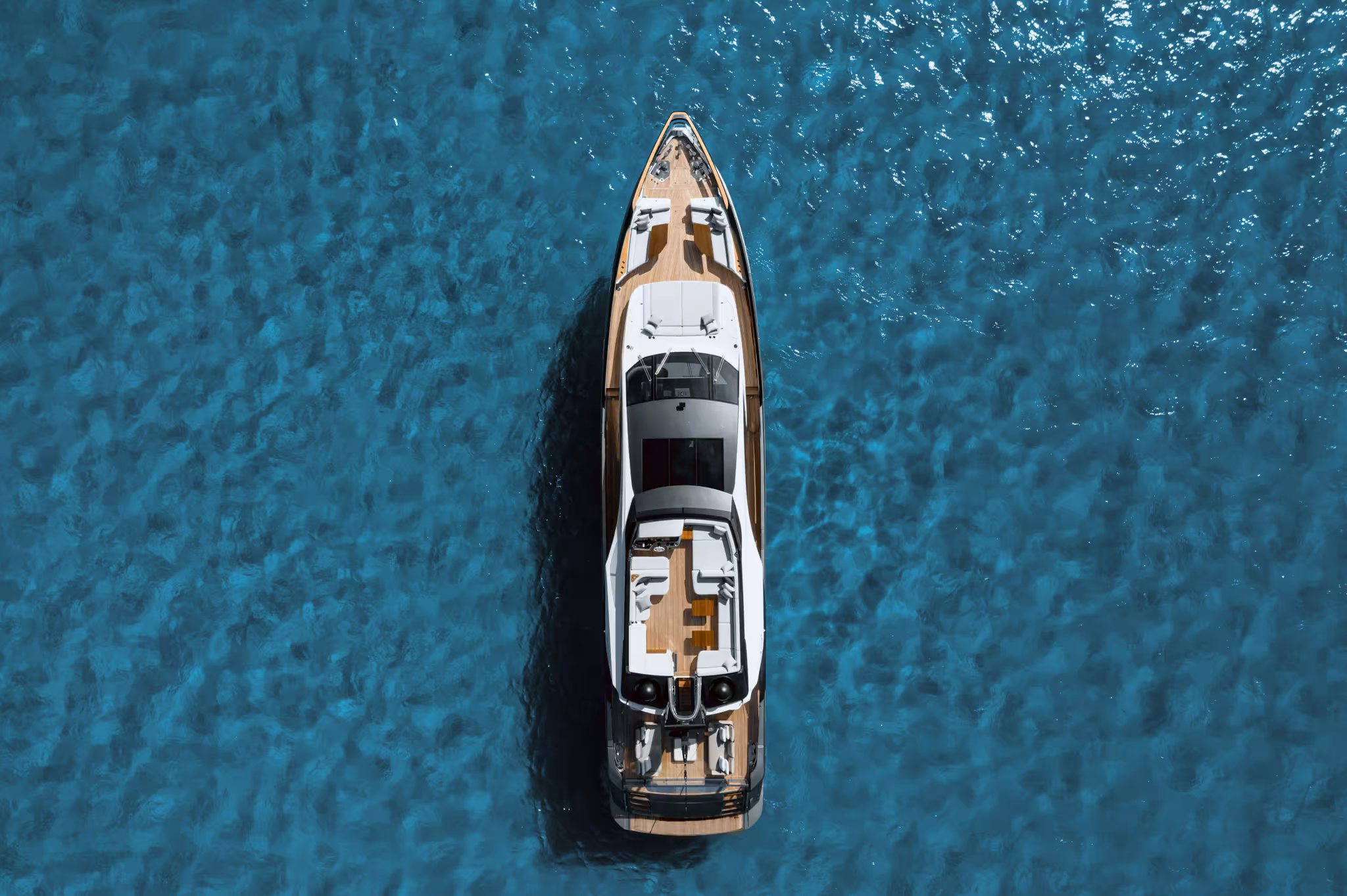 • A considered layout with teak, steel, and exposed carbon that recalls the modern and high-end performance style of the yacht