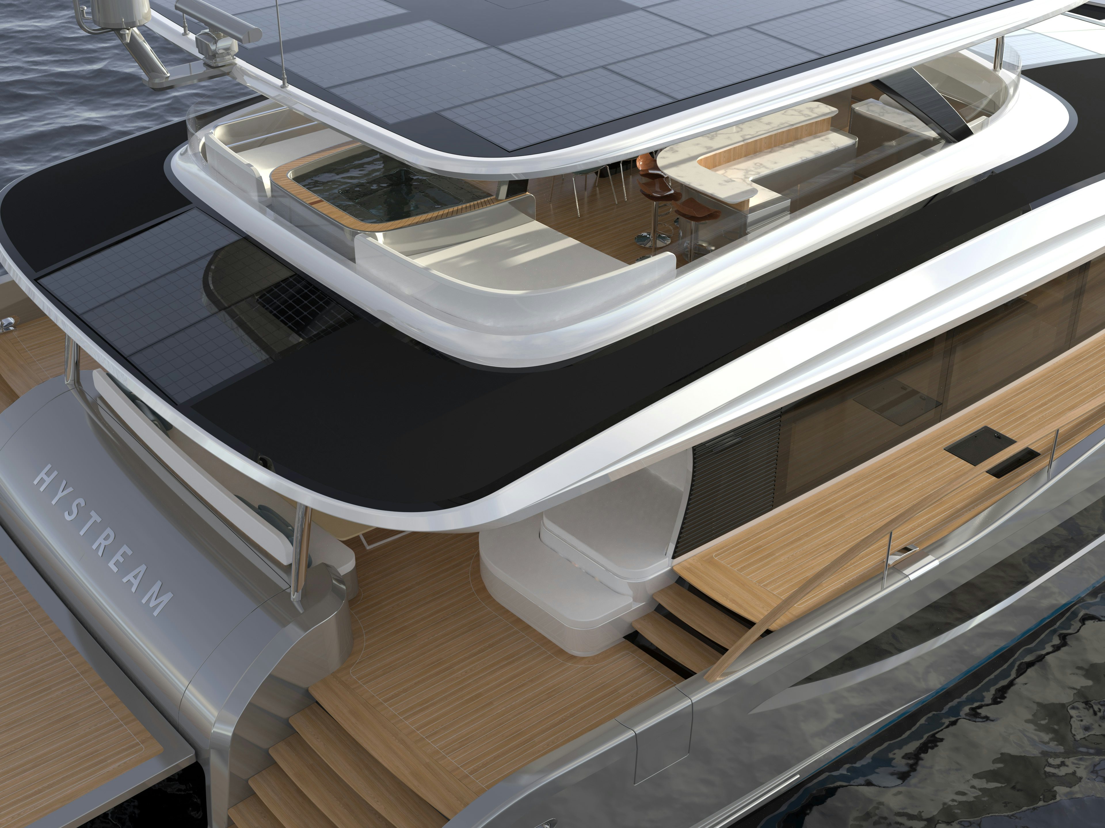The Hystream 80 is an 80-foot hydrogen-electric catamaran that offers zero-emission, silent cruising with high-energy efficiency, bifacial solar panel integration, smart energy management and autonomous navigation in a sleek, performance-driven design.