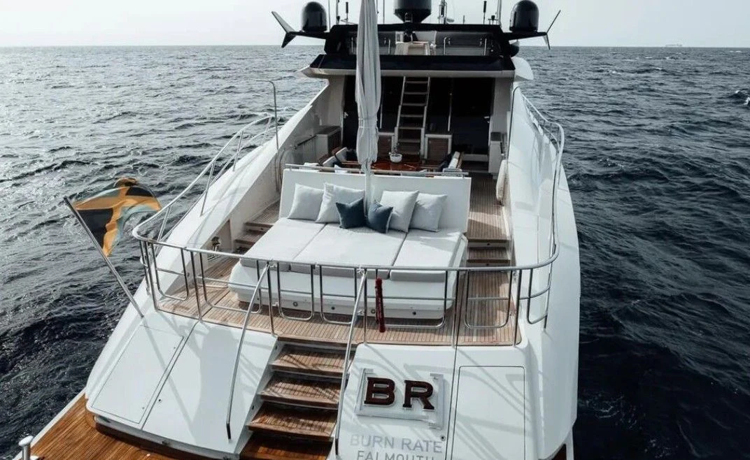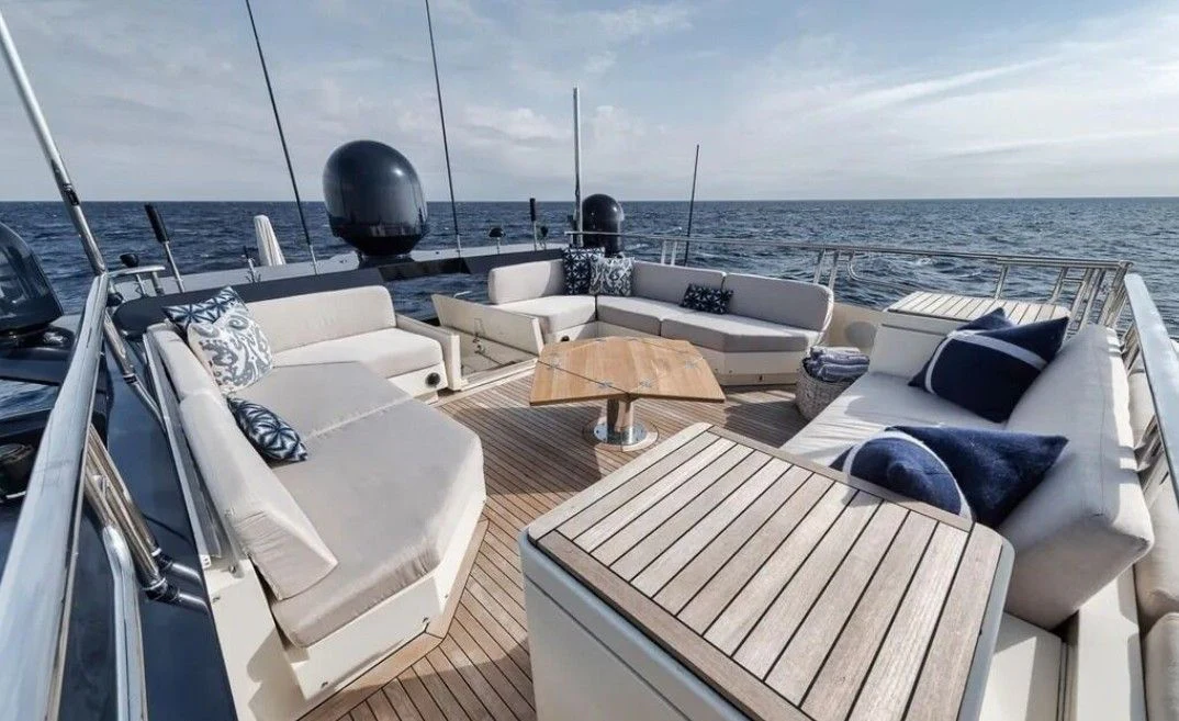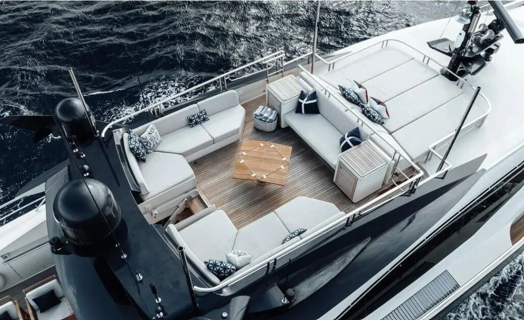 The exterior design of VANTAGE is a testament to timeless elegance fused with modern sensibilities. The aluminum hull gleams under the sun, reflecting her surroundings like a mirror on water while promising swift speeds up to 28 knots, powered by twin MTU engines boasting a combined horsepower of 5500hp/4102kW. The sundeck beckons with its promise of unadulterated relaxation, whether lounging under the sky or dining alfresco amidst panoramic sea views.