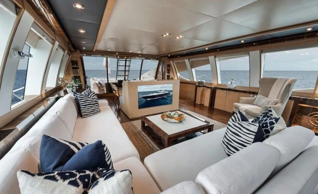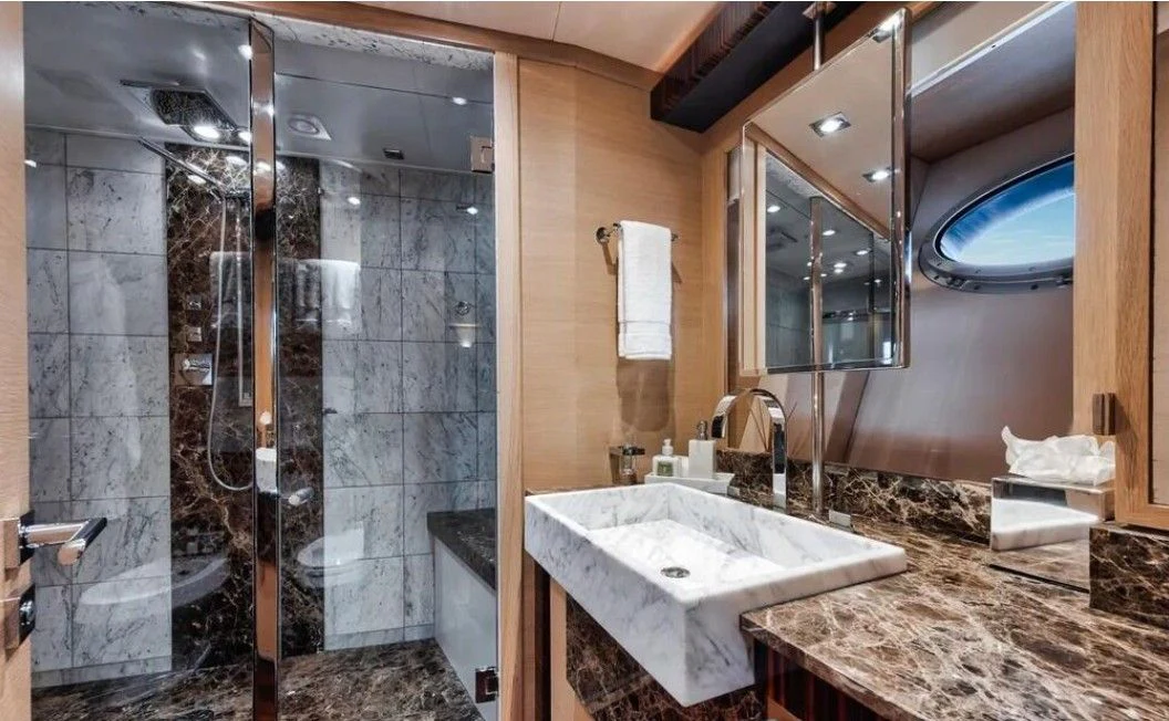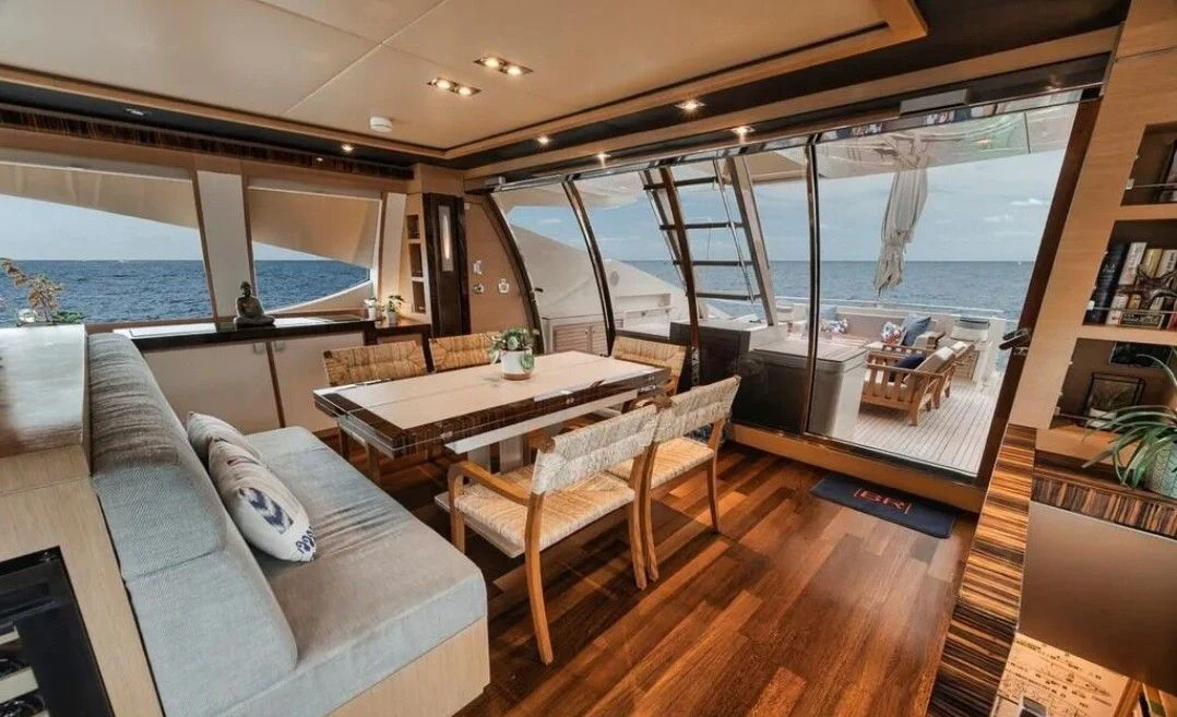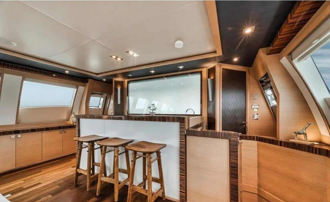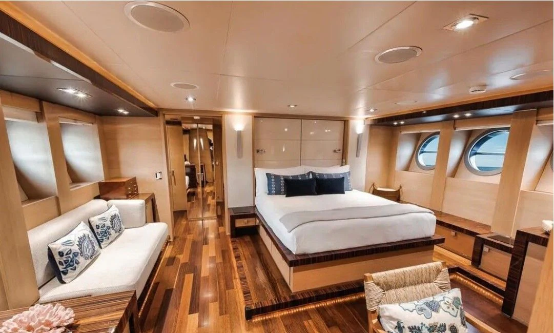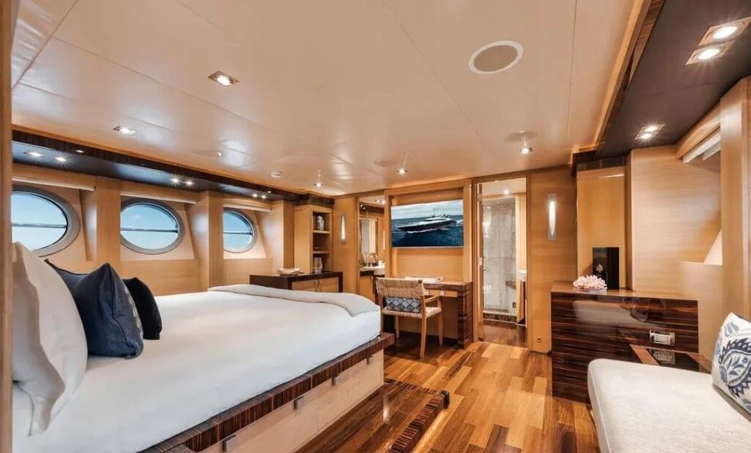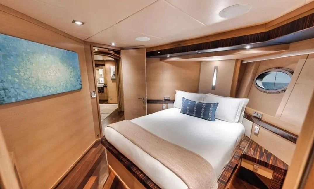 Inside VANTAGE, opulence takes center stage with an interior designed to impress even the most discerning eye. Four luxurious cabins accommodate eight guests in unrivaled comfort; each room exudes warmth and tranquility through carefully chosen color palettes and bespoke furnishings. The master stateroom stands apart as a haven of serenity with its plush bedding, expansive windows offering breathtaking views, and an en-suite bathroom that rivals any five-star hotel suite.