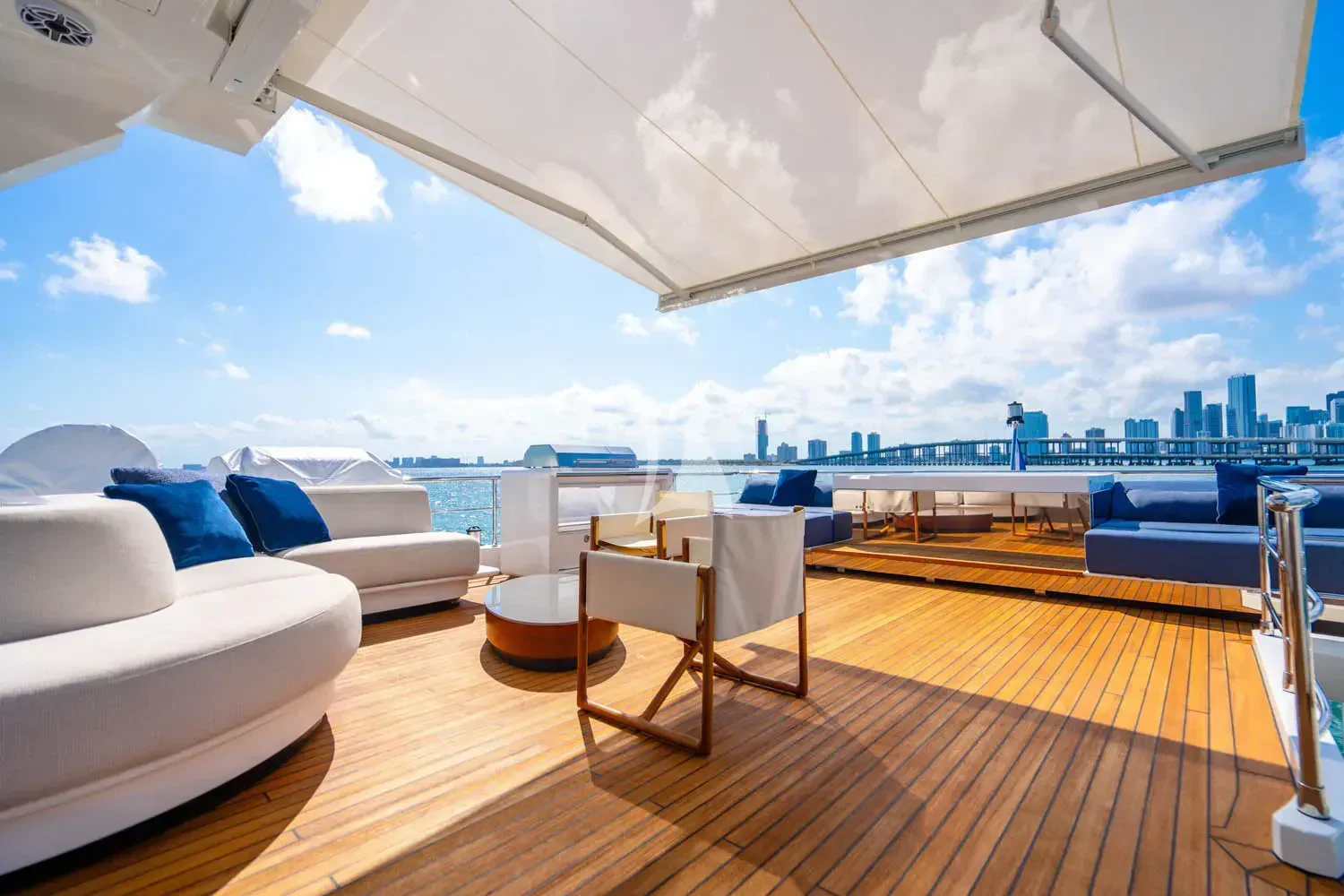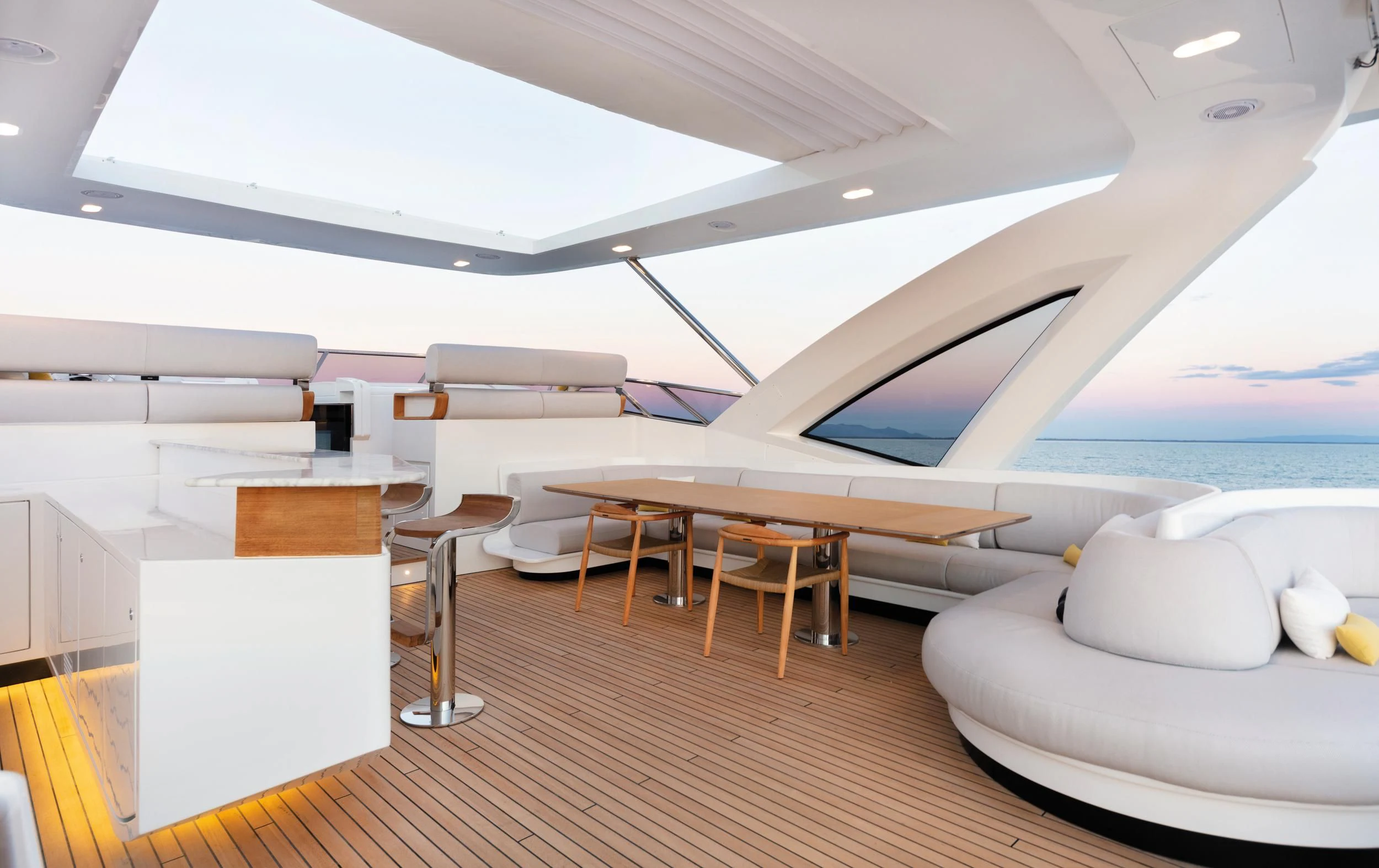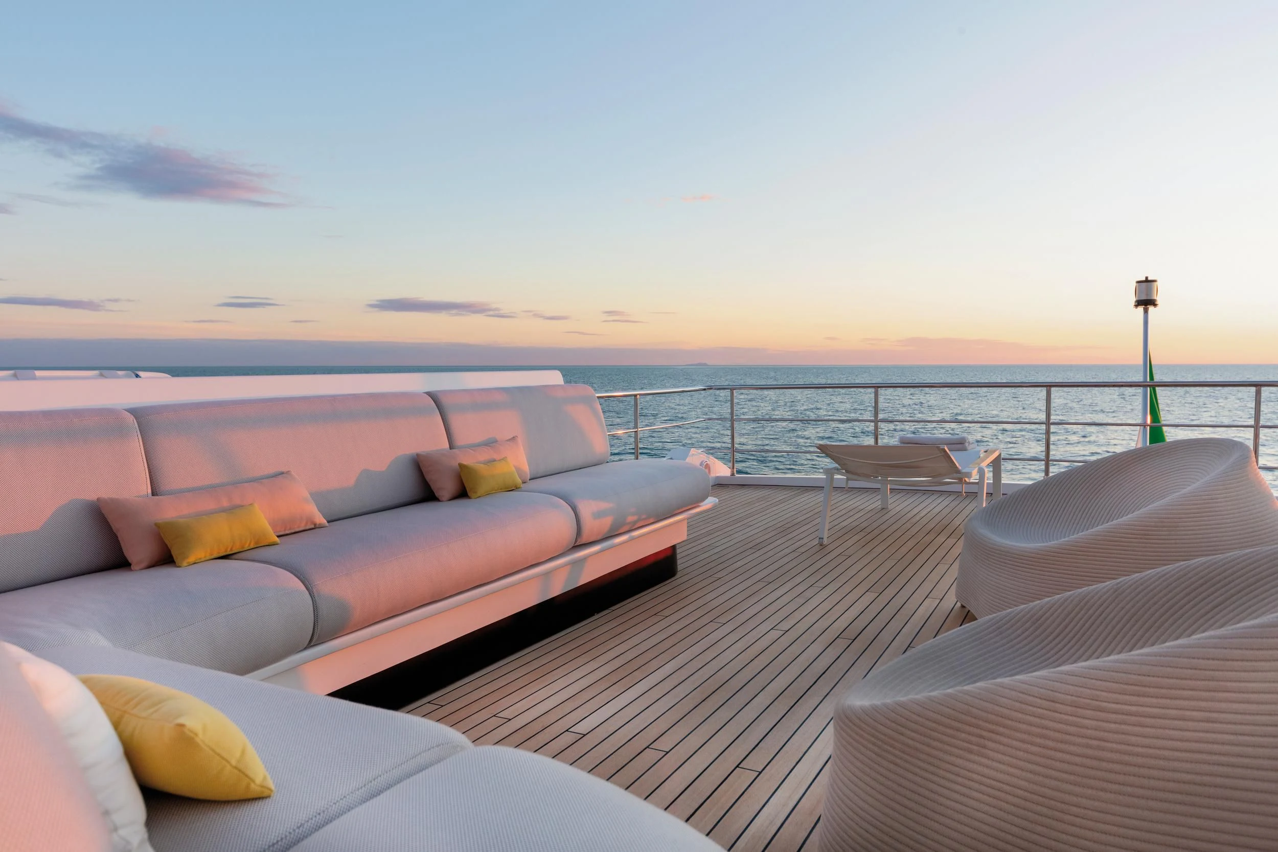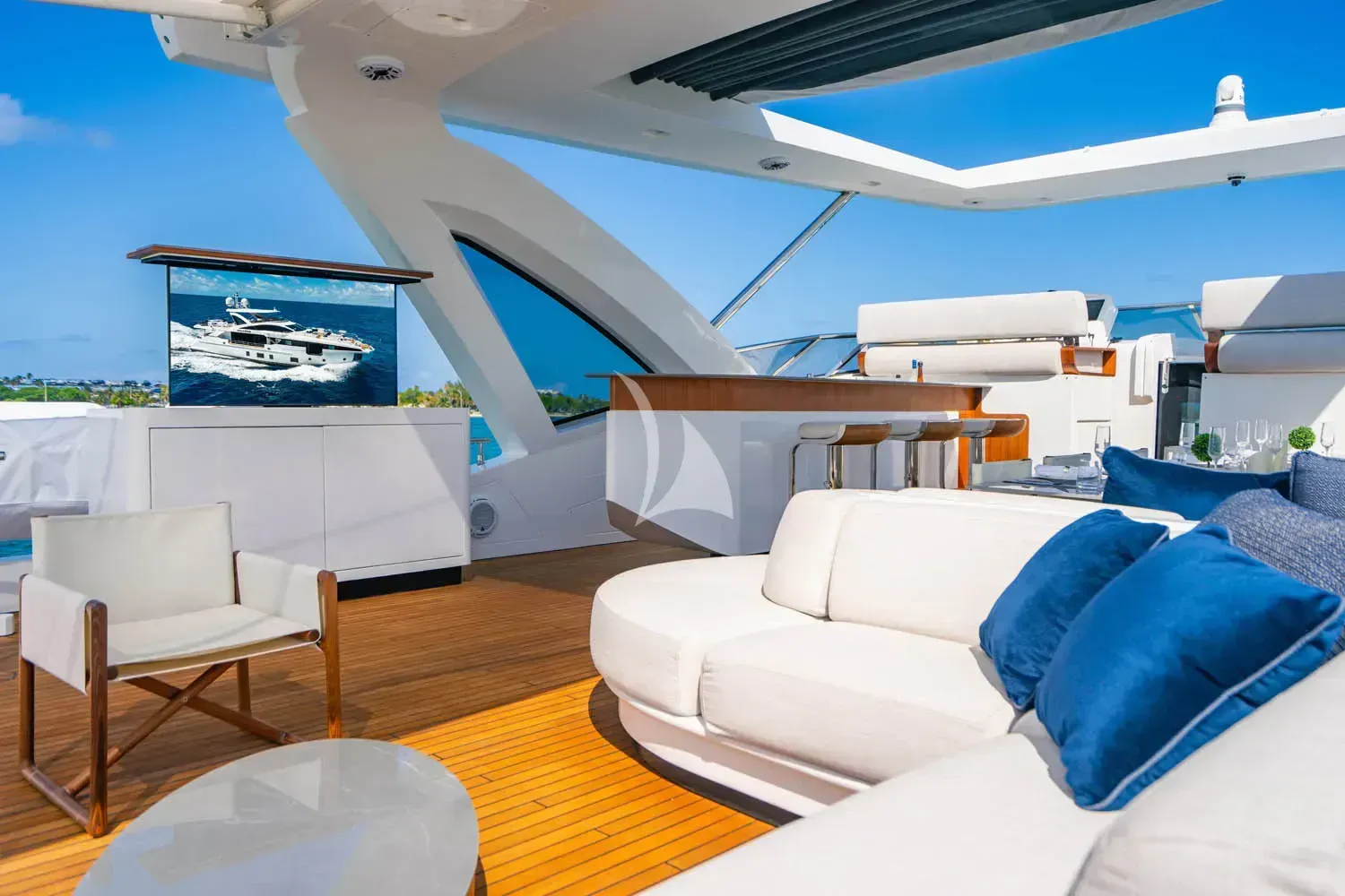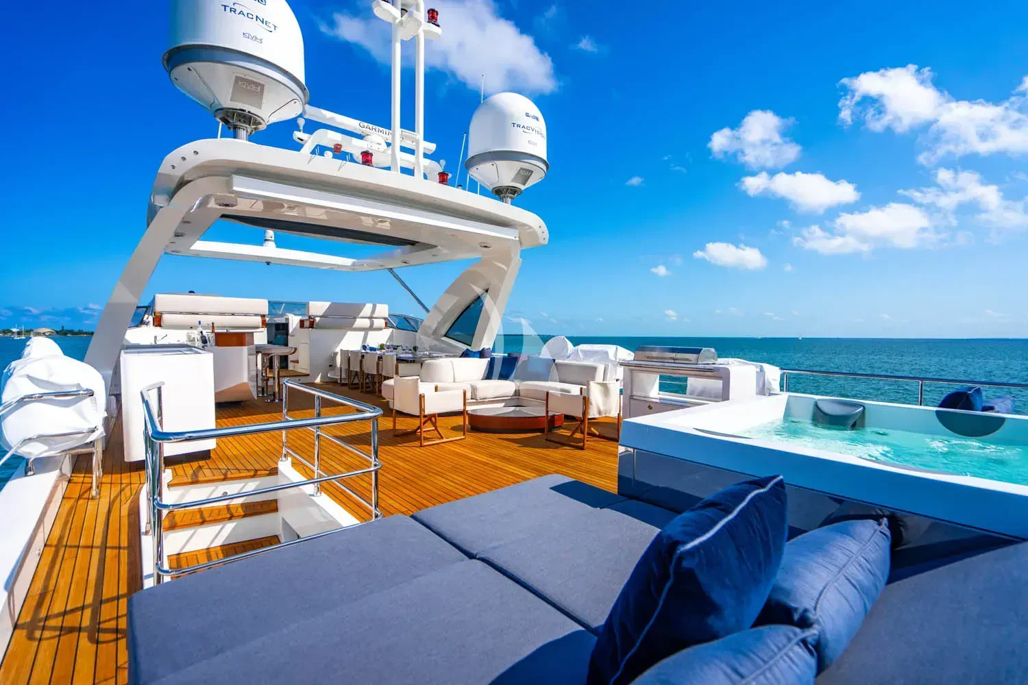 CARPE DIEM's exterior spaces are designed to provide an unrivaled outdoor living experience. The flybridge is home to expansive sundecks, perfect for soaking up the sun while cruising at a comfortable speed of 21 knots or reaching its maximum speed of 26.5 knots. The beam measures an impressive 22 feet and 12 inches, offering ample space for alfresco dining areas where guests can savor gourmet meals under the stars. Notable exterior features include state-of-the-art navigation systems and robust twin MTU engines (16V 2000 M86) each delivering a powerful output of 2200 hp /1641 kW.