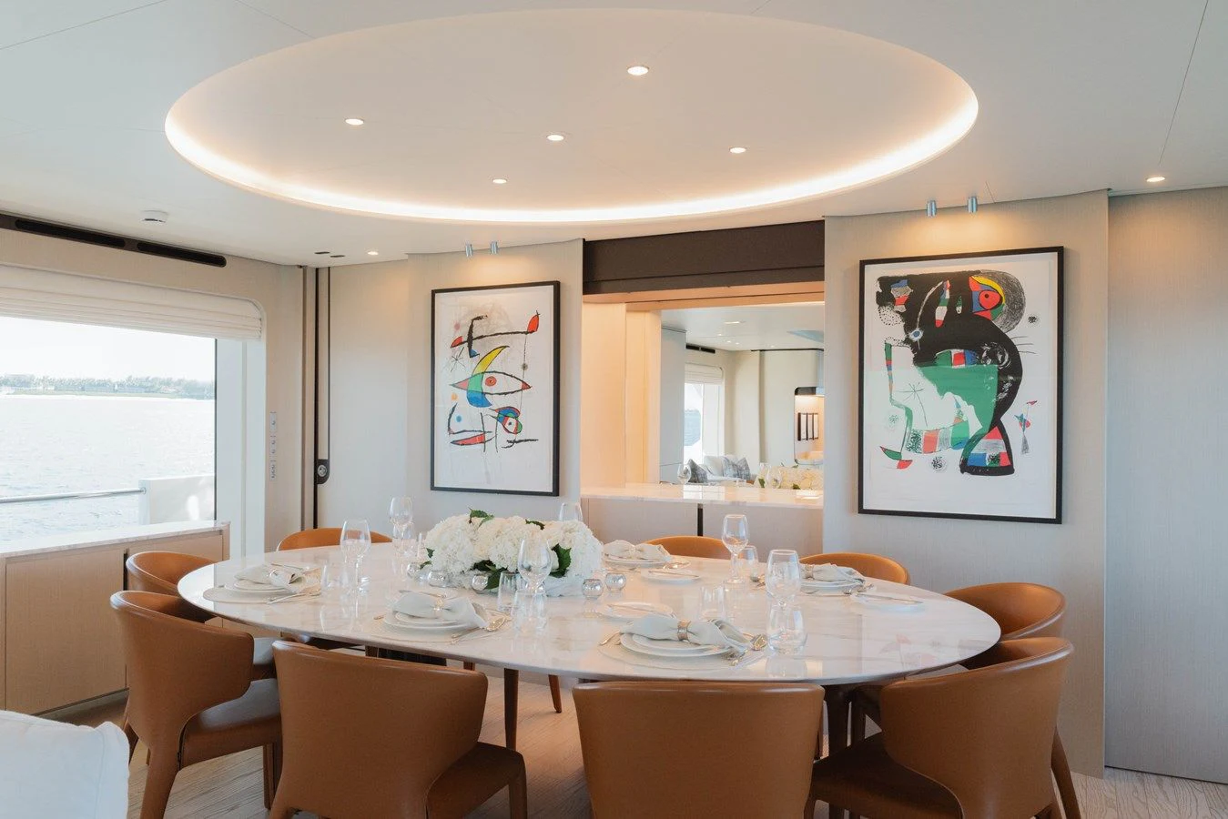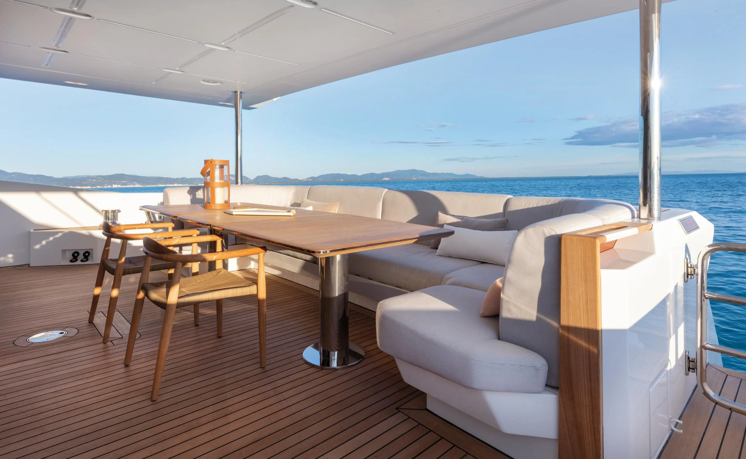 The main salon offers plush seating areas perfect for socializing or simply relaxing after a day filled with activities. Adjacent to it lies the formal dining area which can comfortably seat all ten guests onboard in one sitting – making it ideal for celebratory dinners or intimate gatherings.