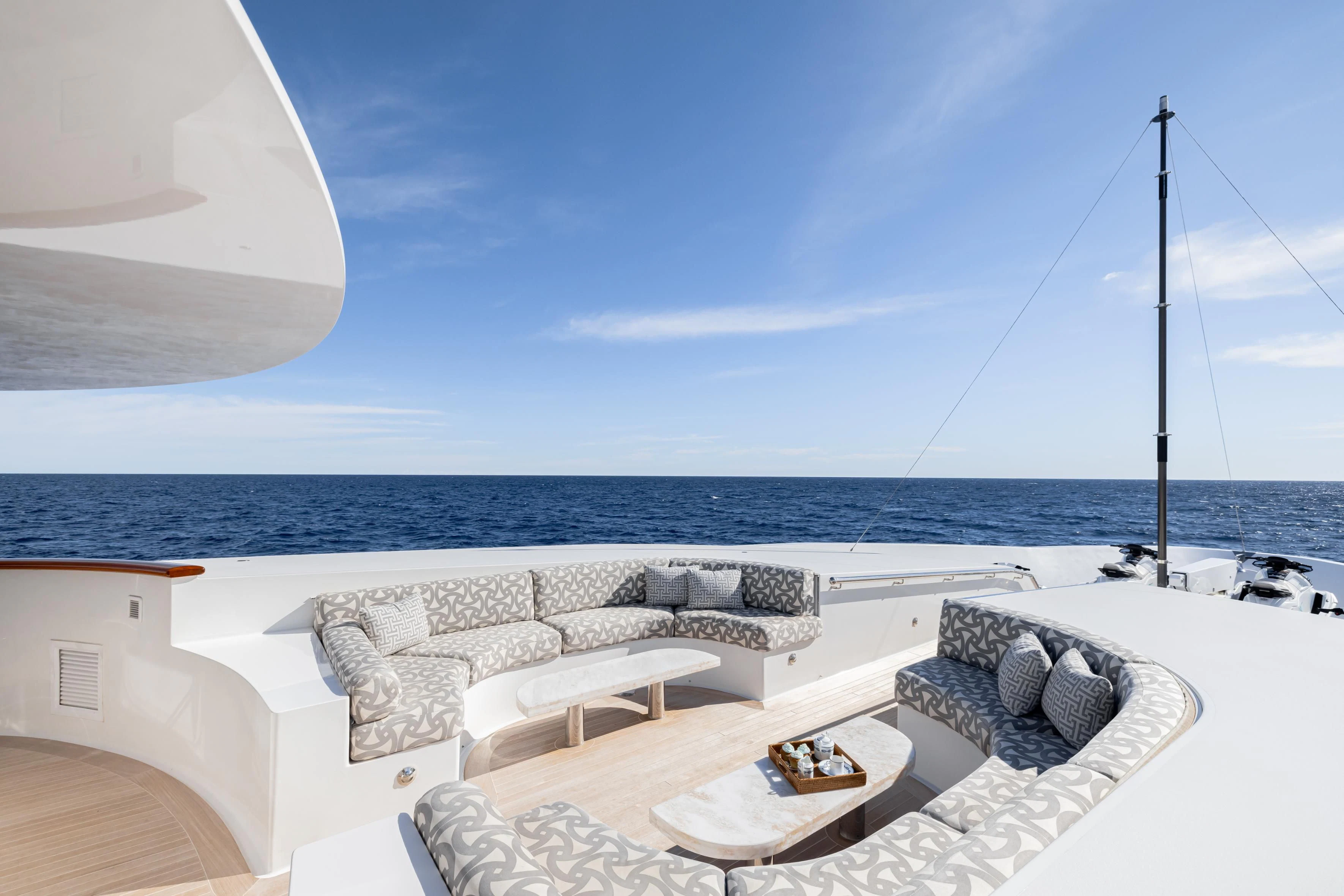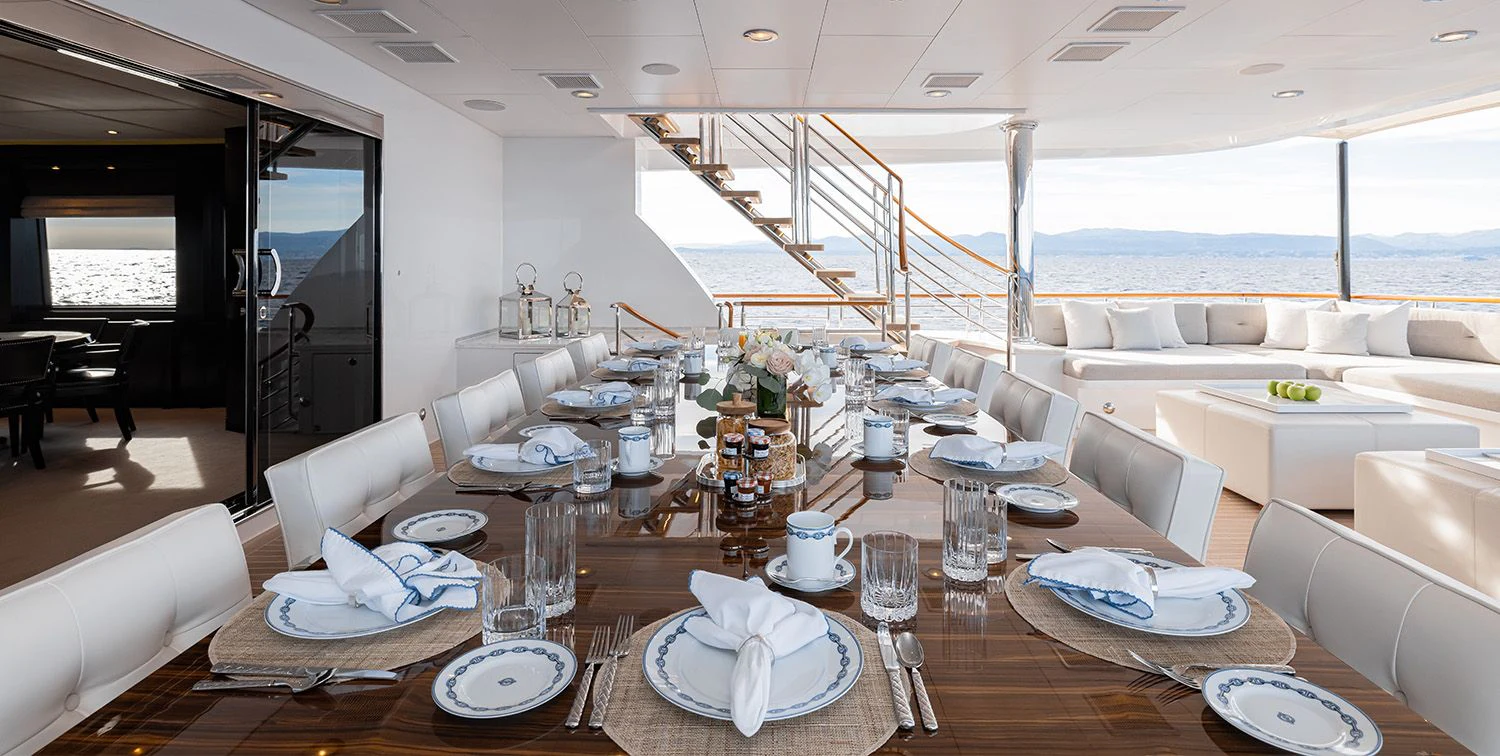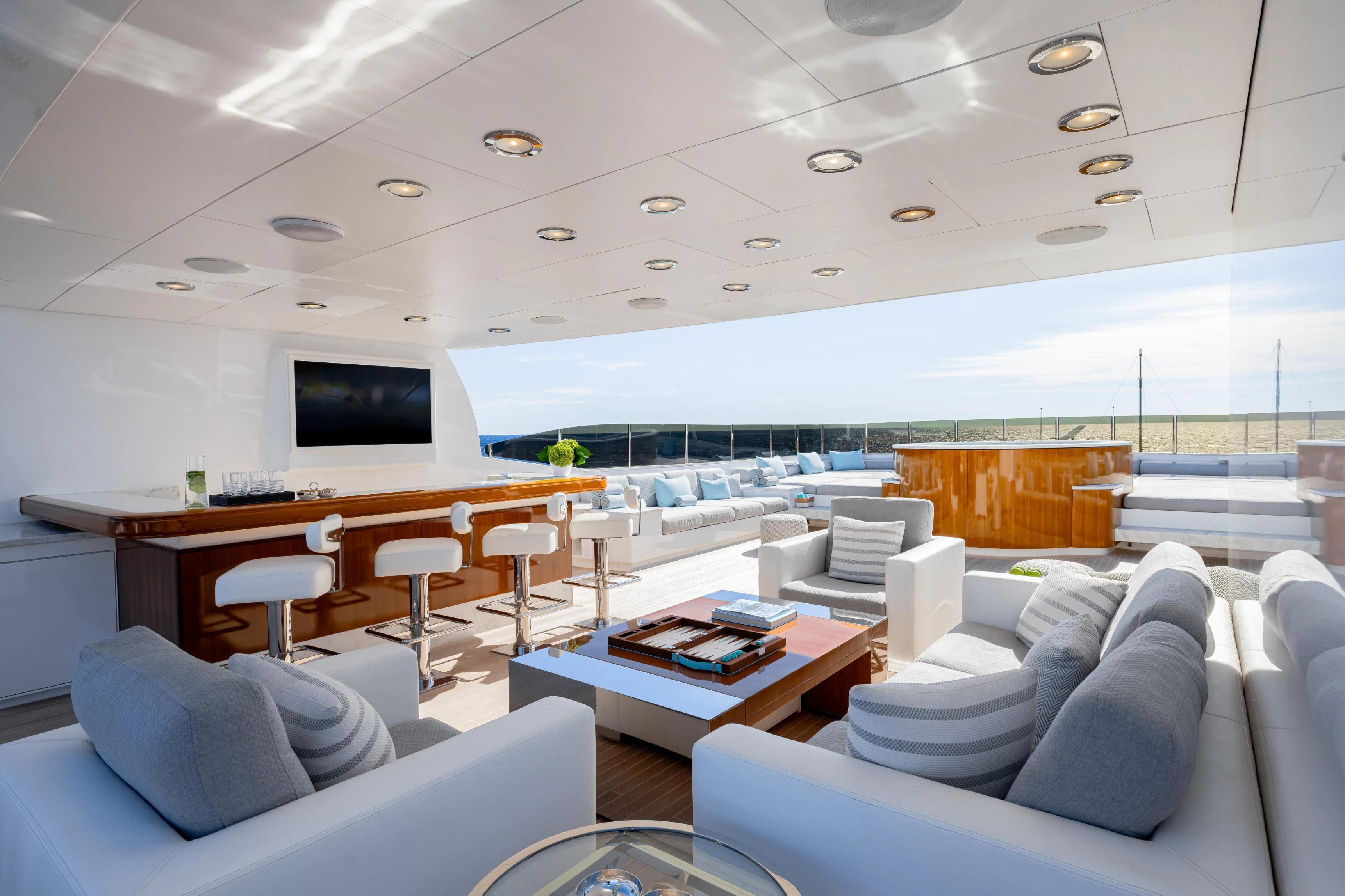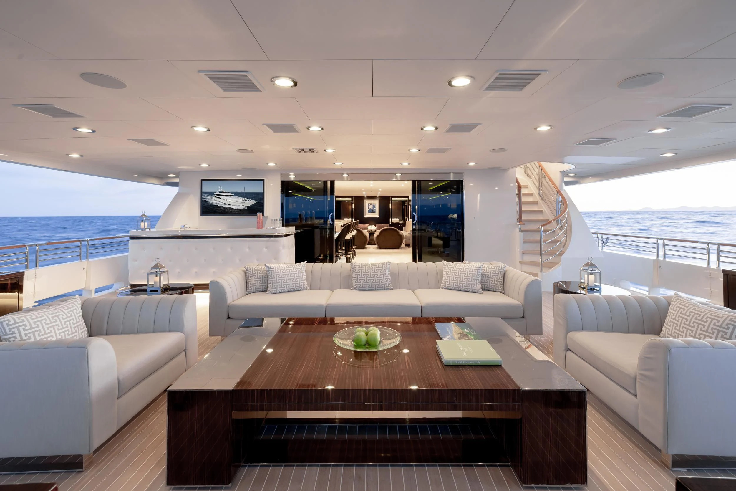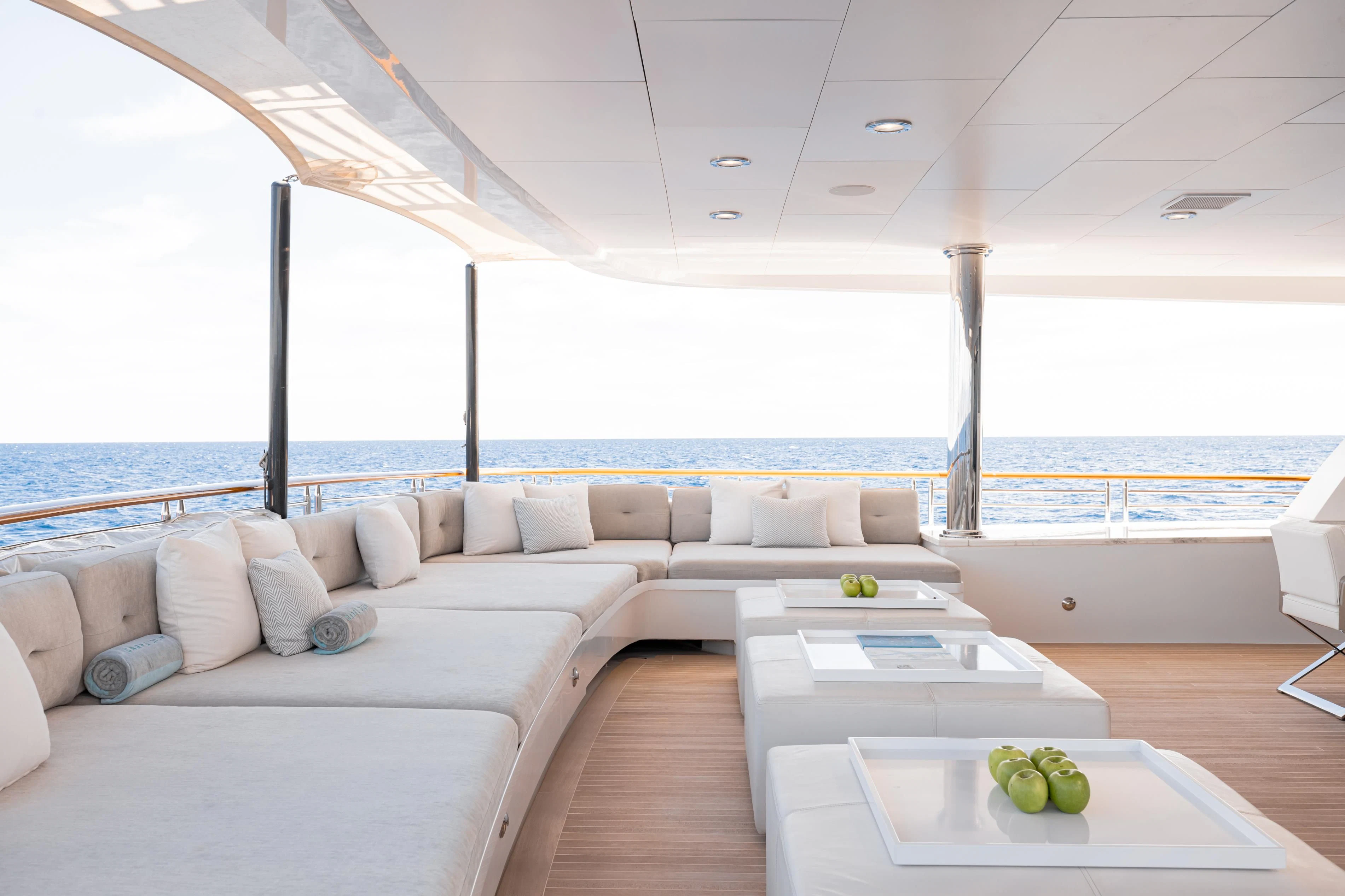 Outdoors, expansive deck spaces are both inviting and practical, with generous seating areas designed for entertaining and relaxation. Removable awnings on all three aft decks provide adaptable shade, enhancing comfort in any climate.