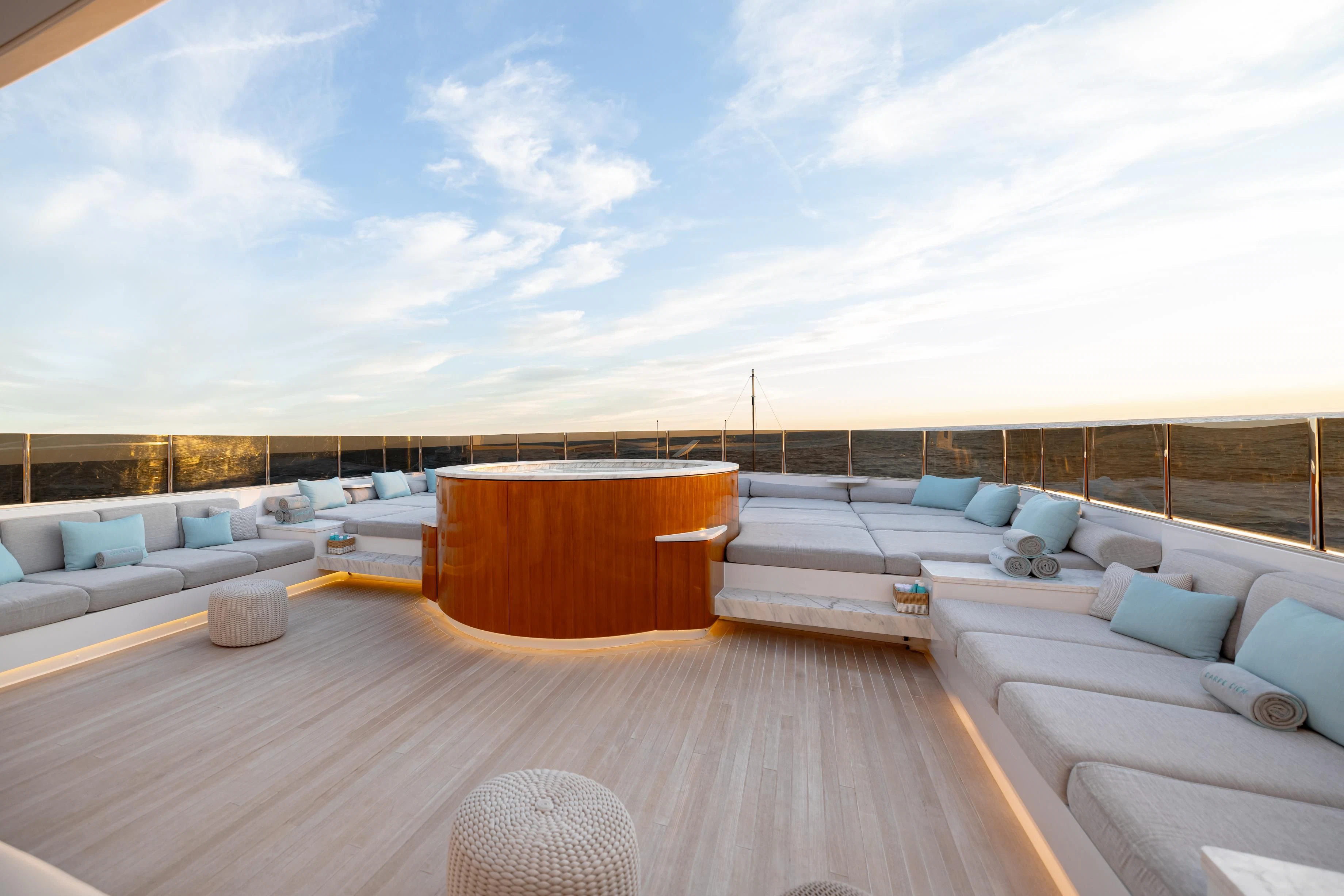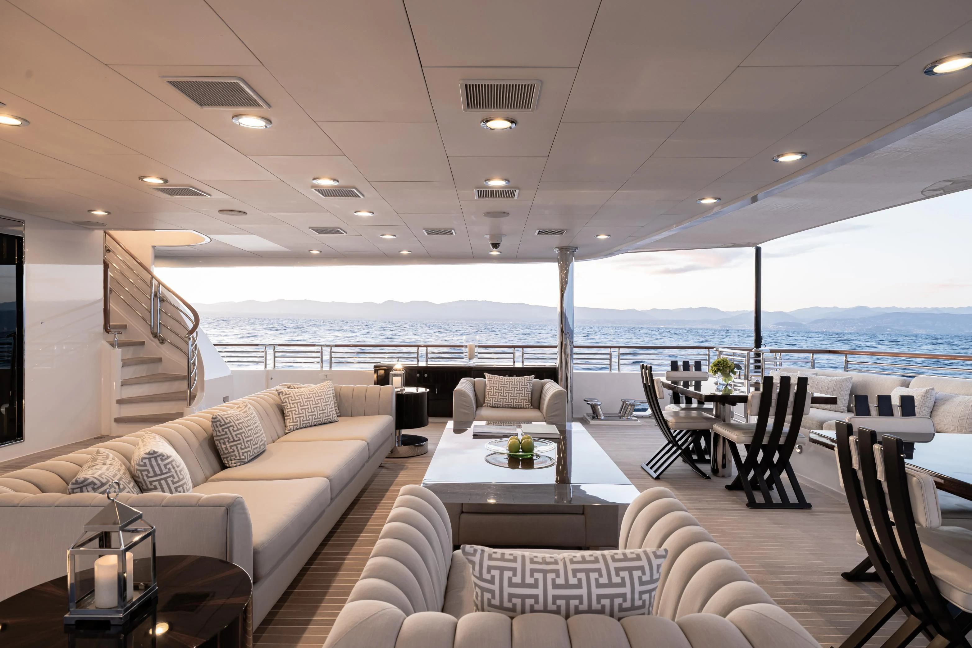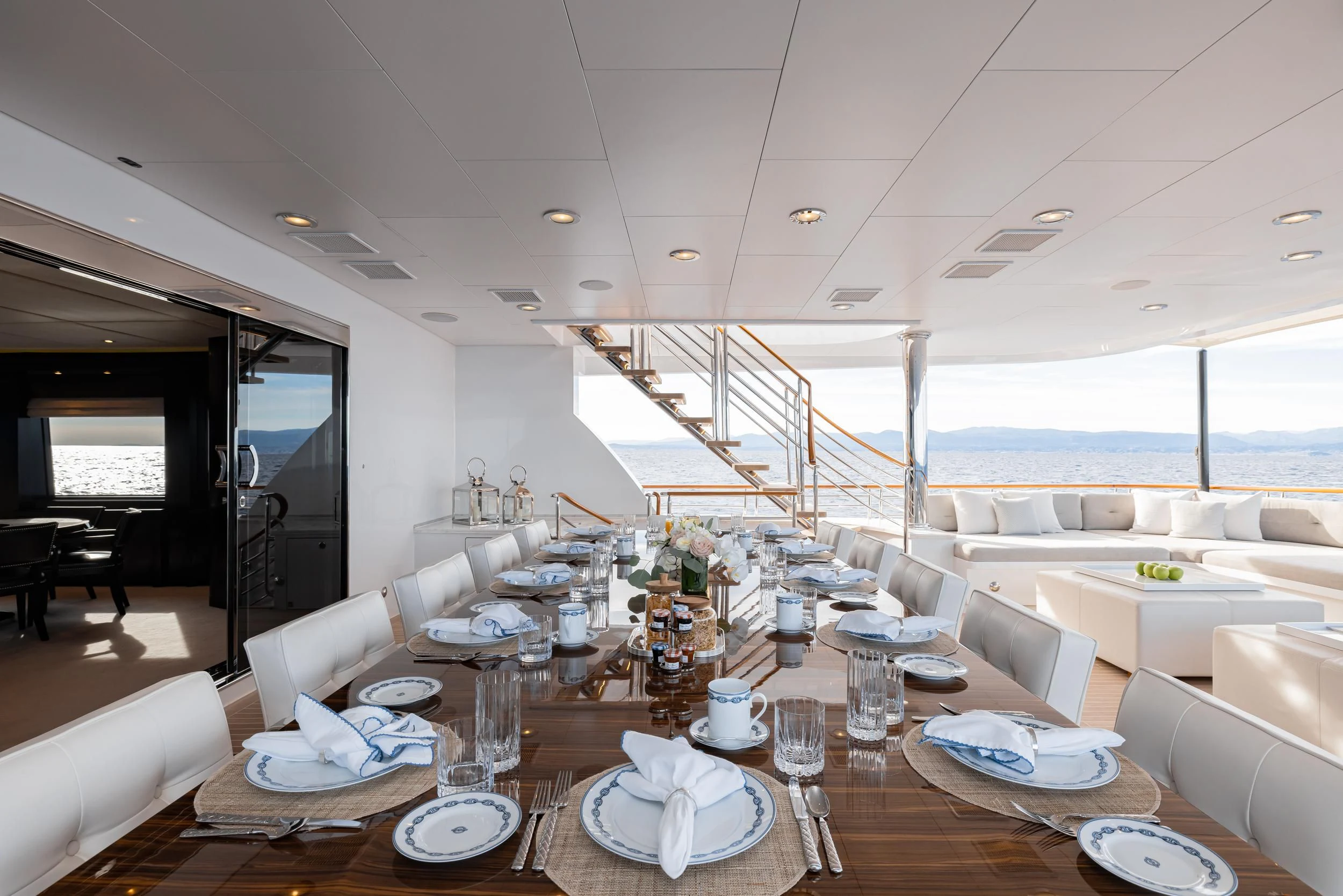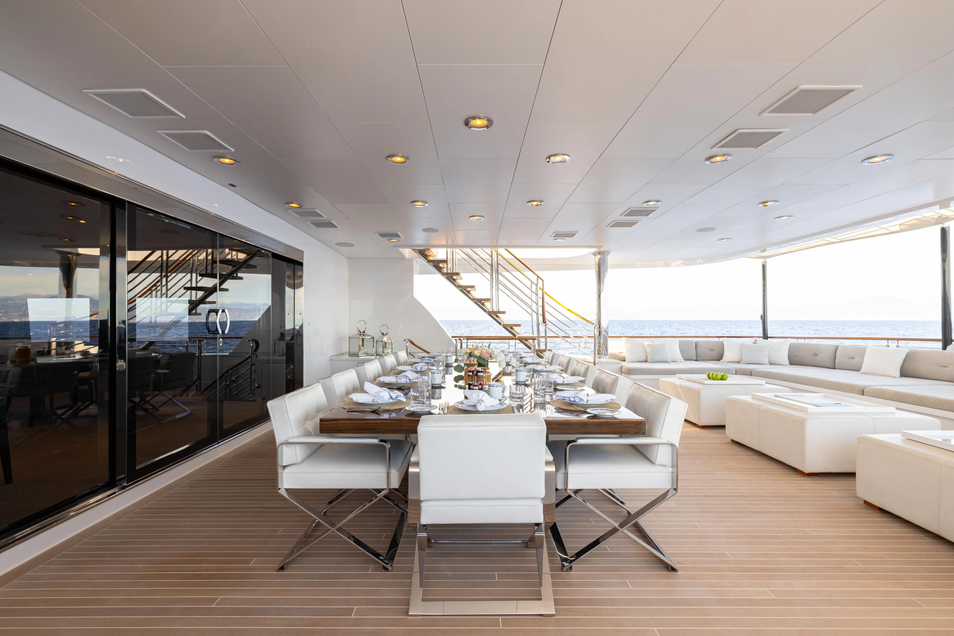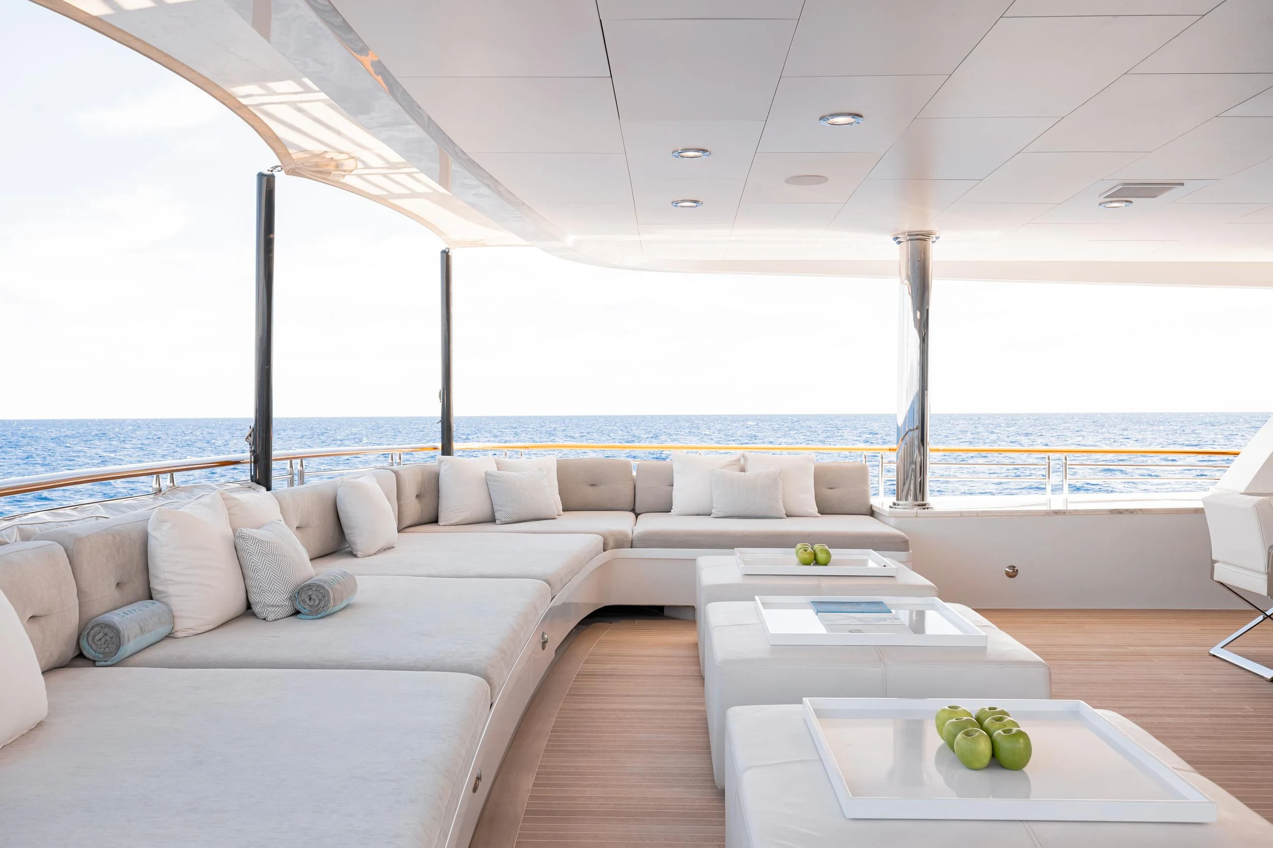 Outdoors, expansive deck spaces are both inviting and practical, with generous seating areas designed for entertaining and relaxation. Removable awnings on all three aft decks provide adaptable shade, enhancing comfort in any climate.
