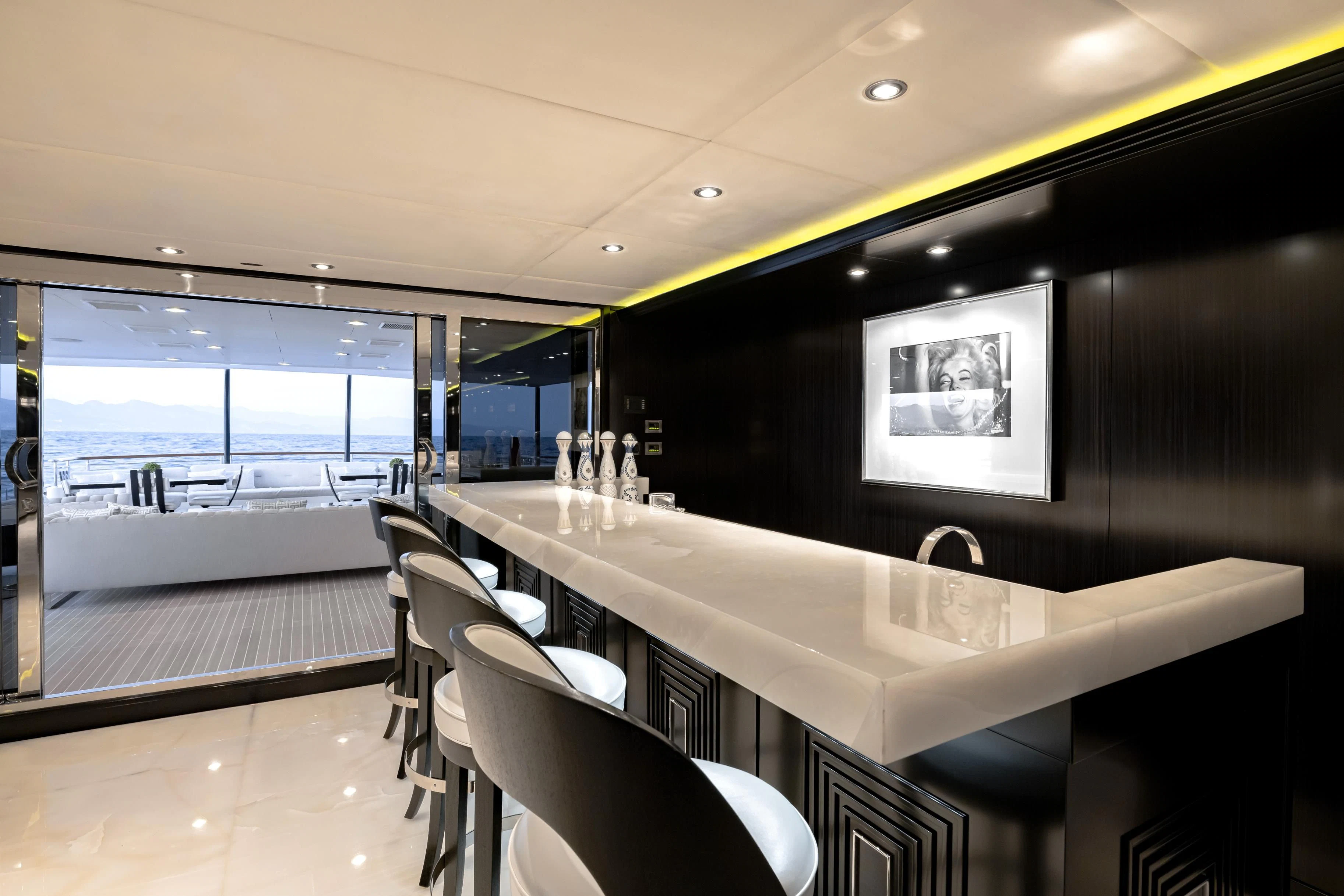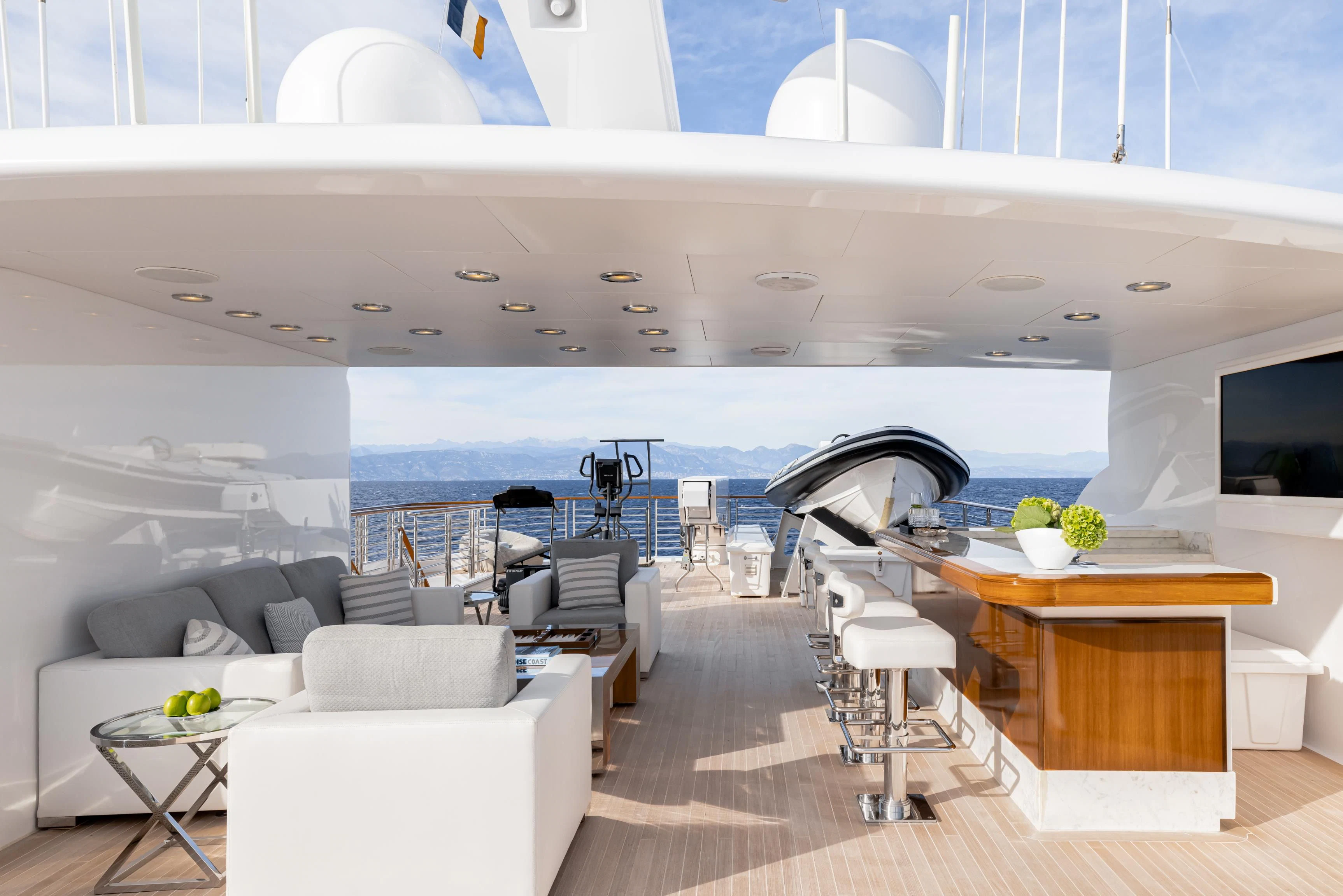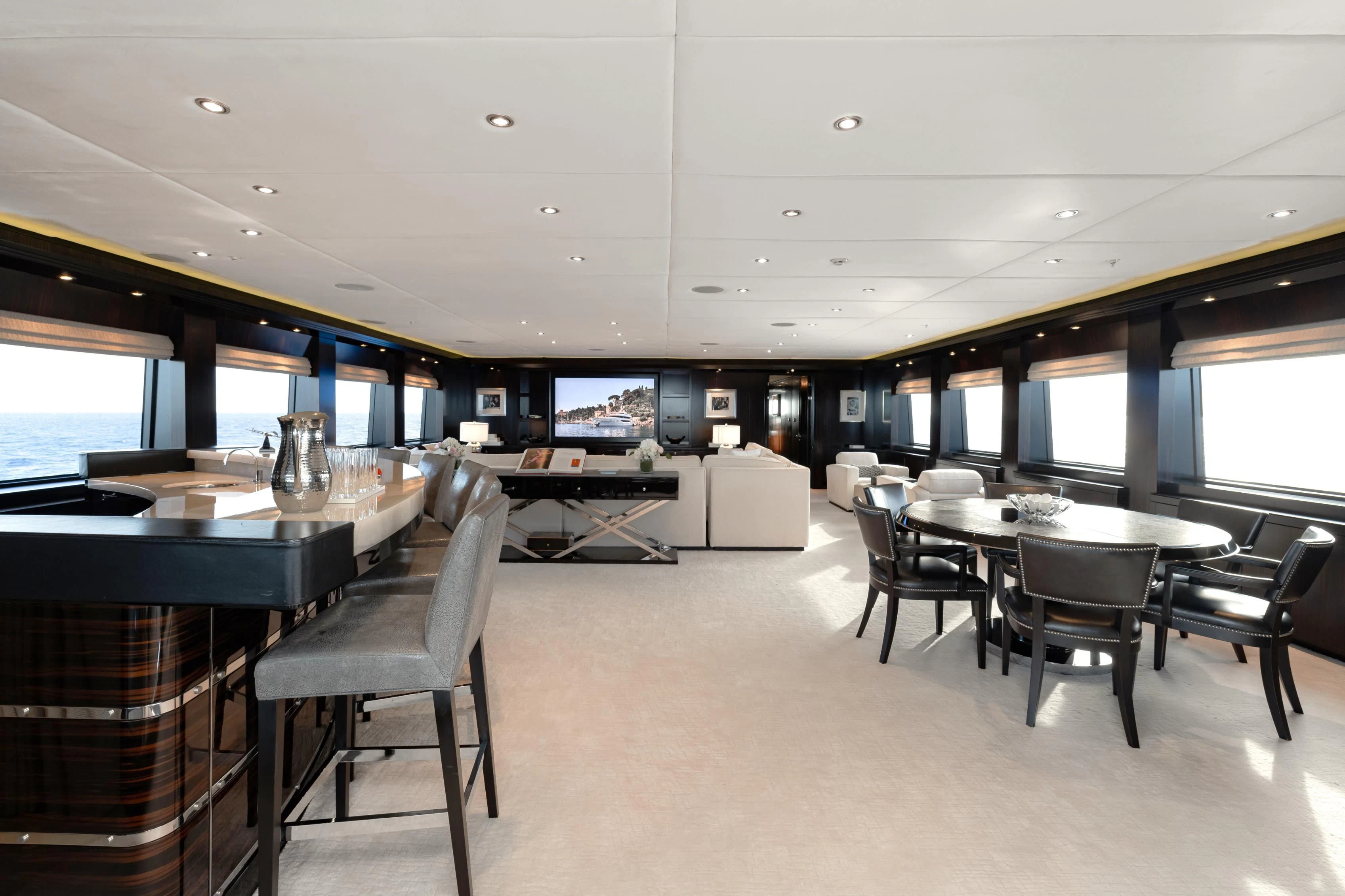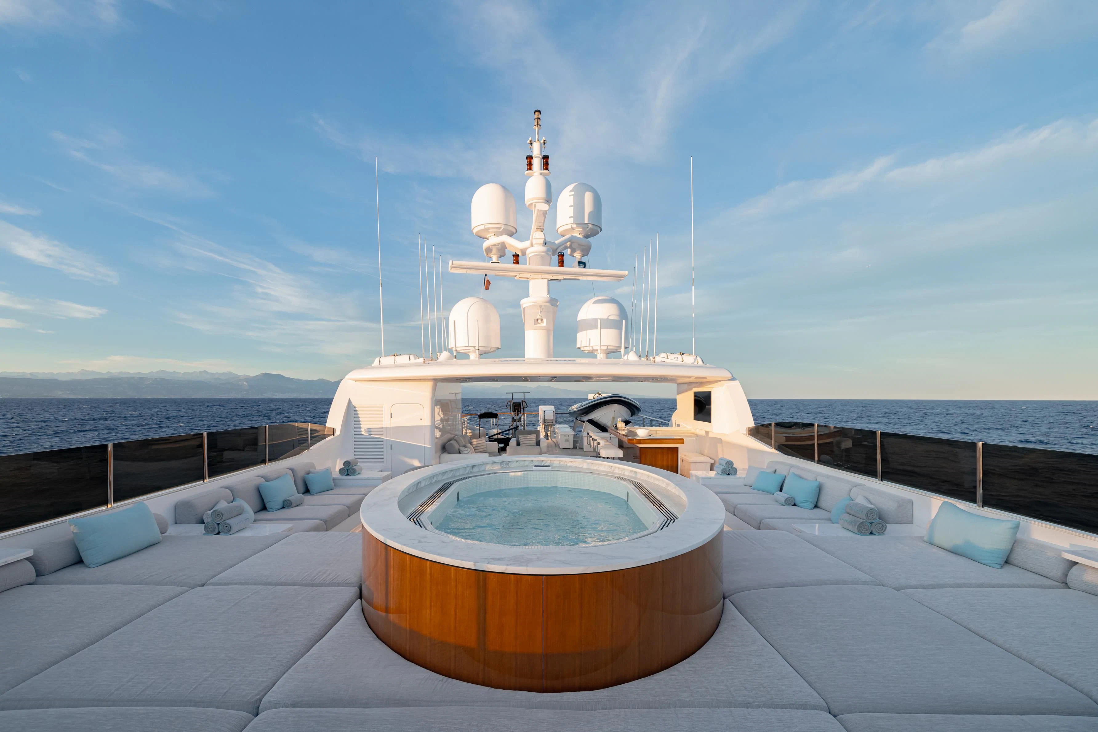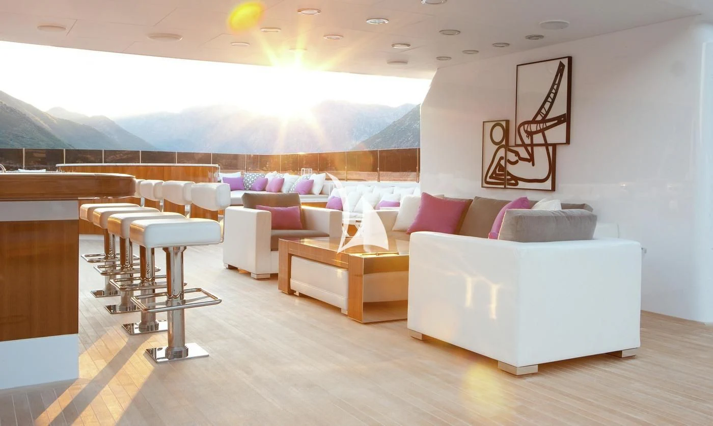 Outdoors, expansive deck spaces are both inviting and practical, with generous seating areas designed for entertaining and relaxation. Removable awnings on all three aft decks provide adaptable shade, enhancing comfort in any climate.