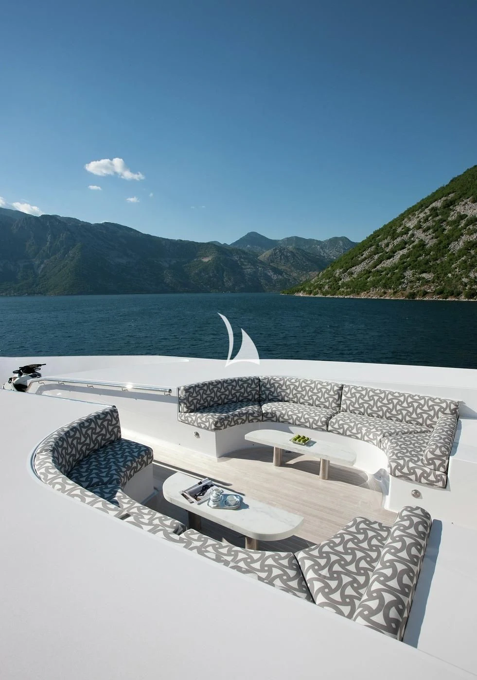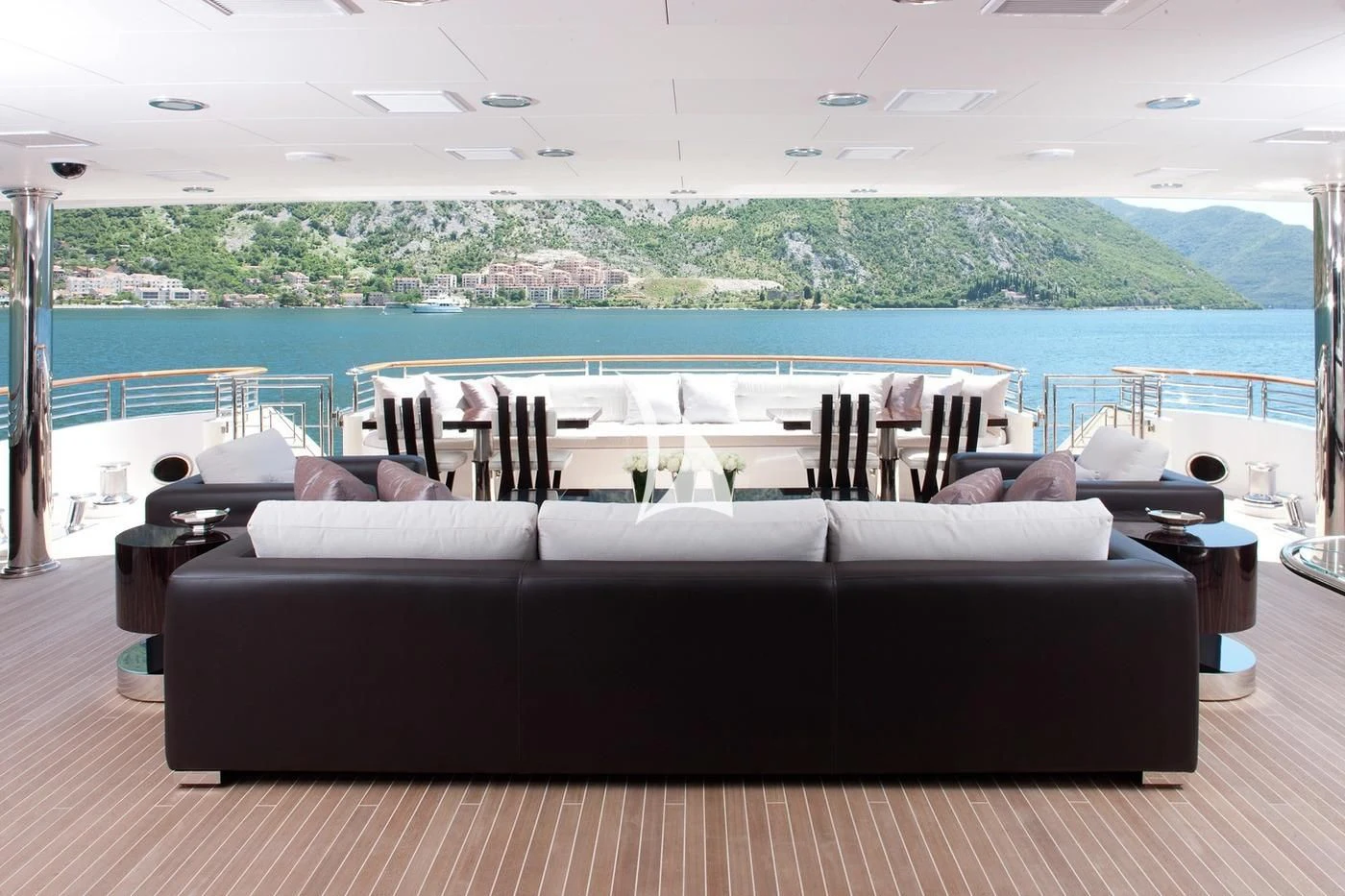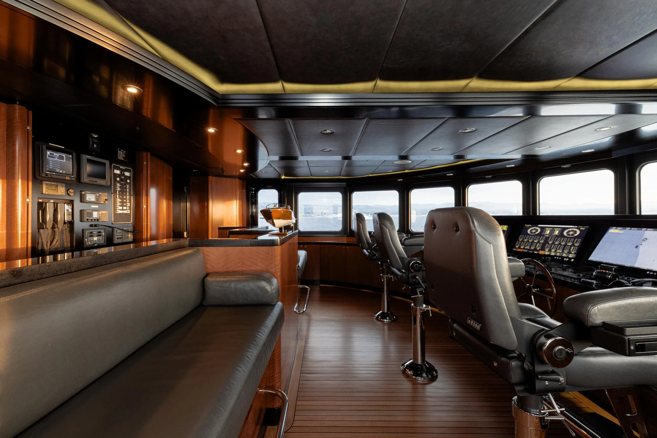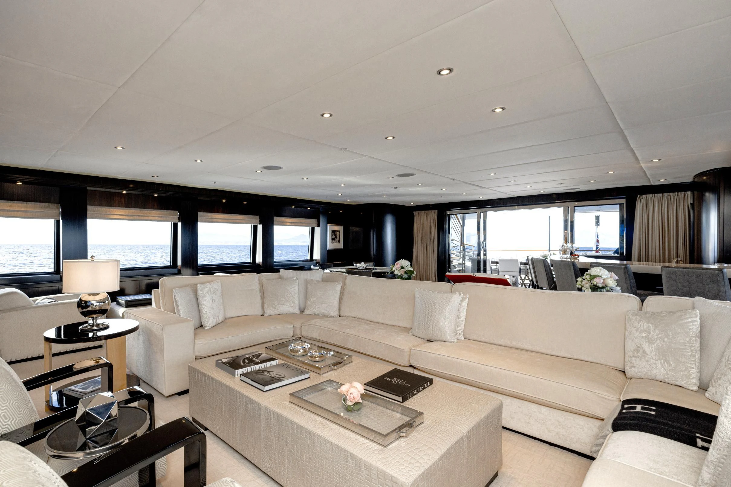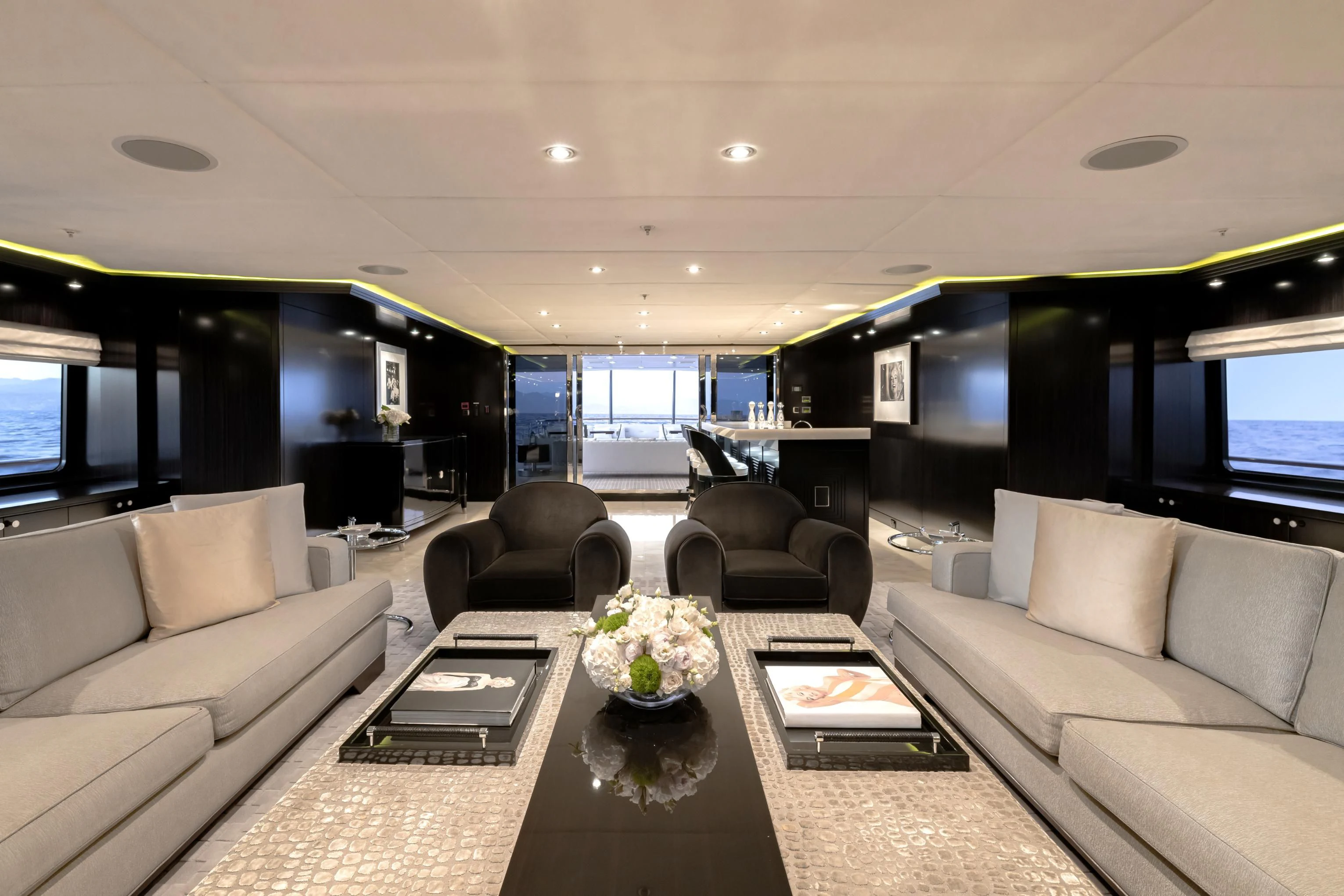 Outdoors, expansive deck spaces are both inviting and practical, with generous seating areas designed for entertaining and relaxation. Removable awnings on all three aft decks provide adaptable shade, enhancing comfort in any climate.
