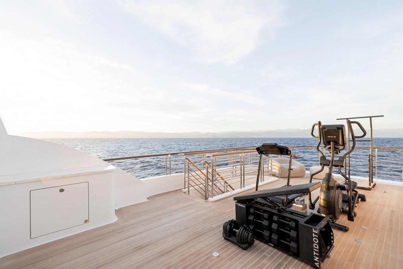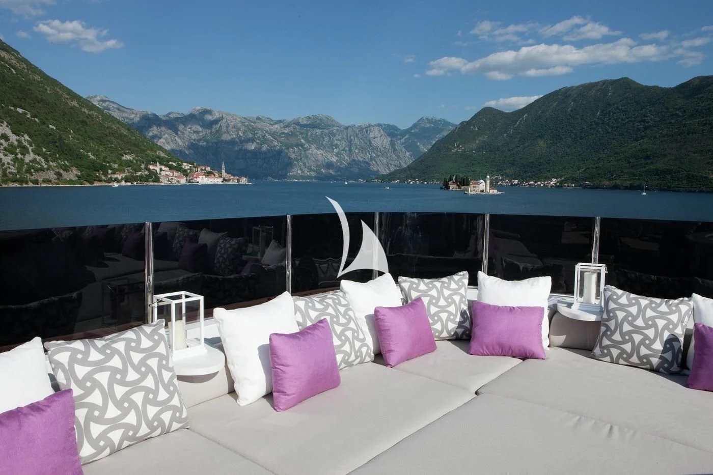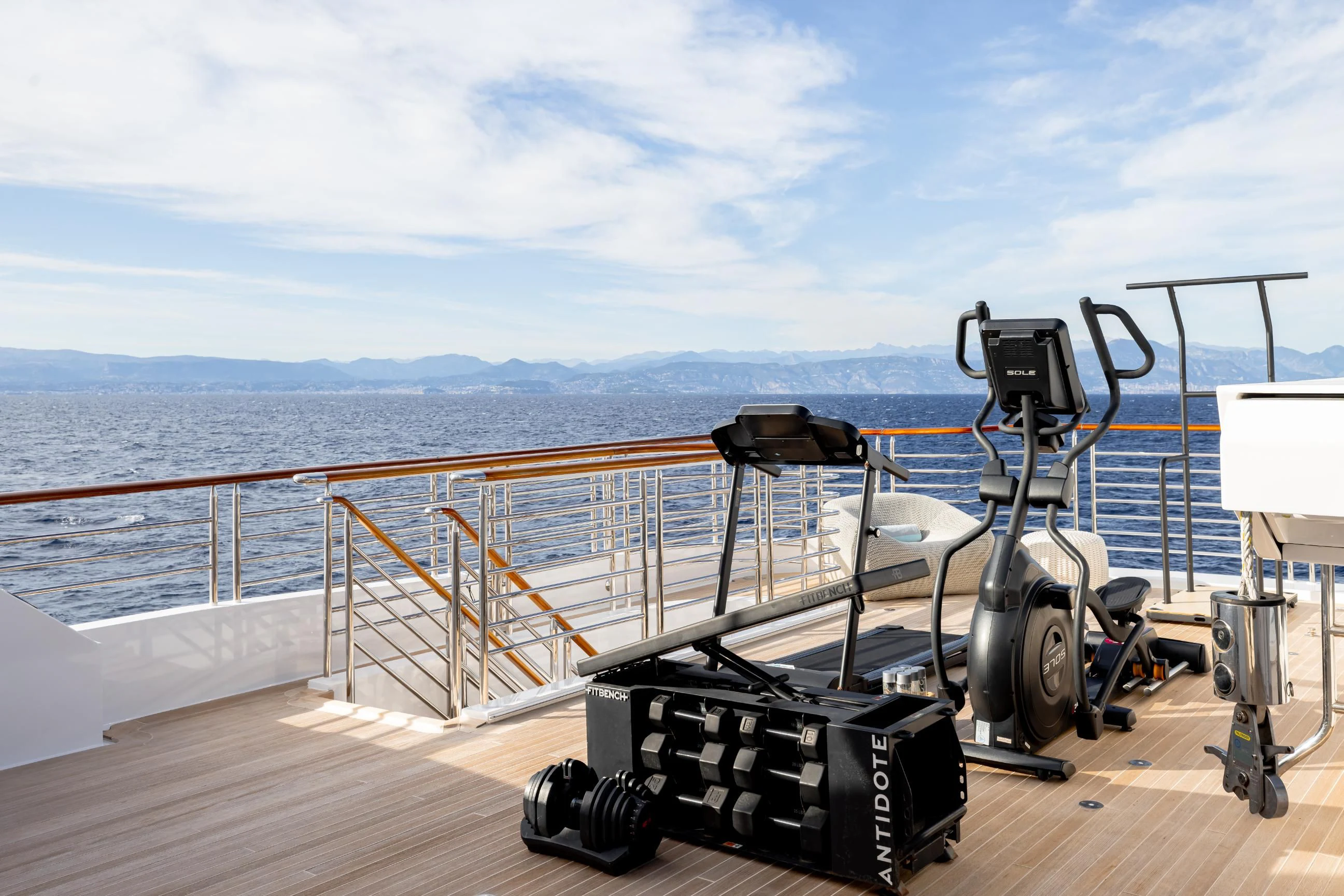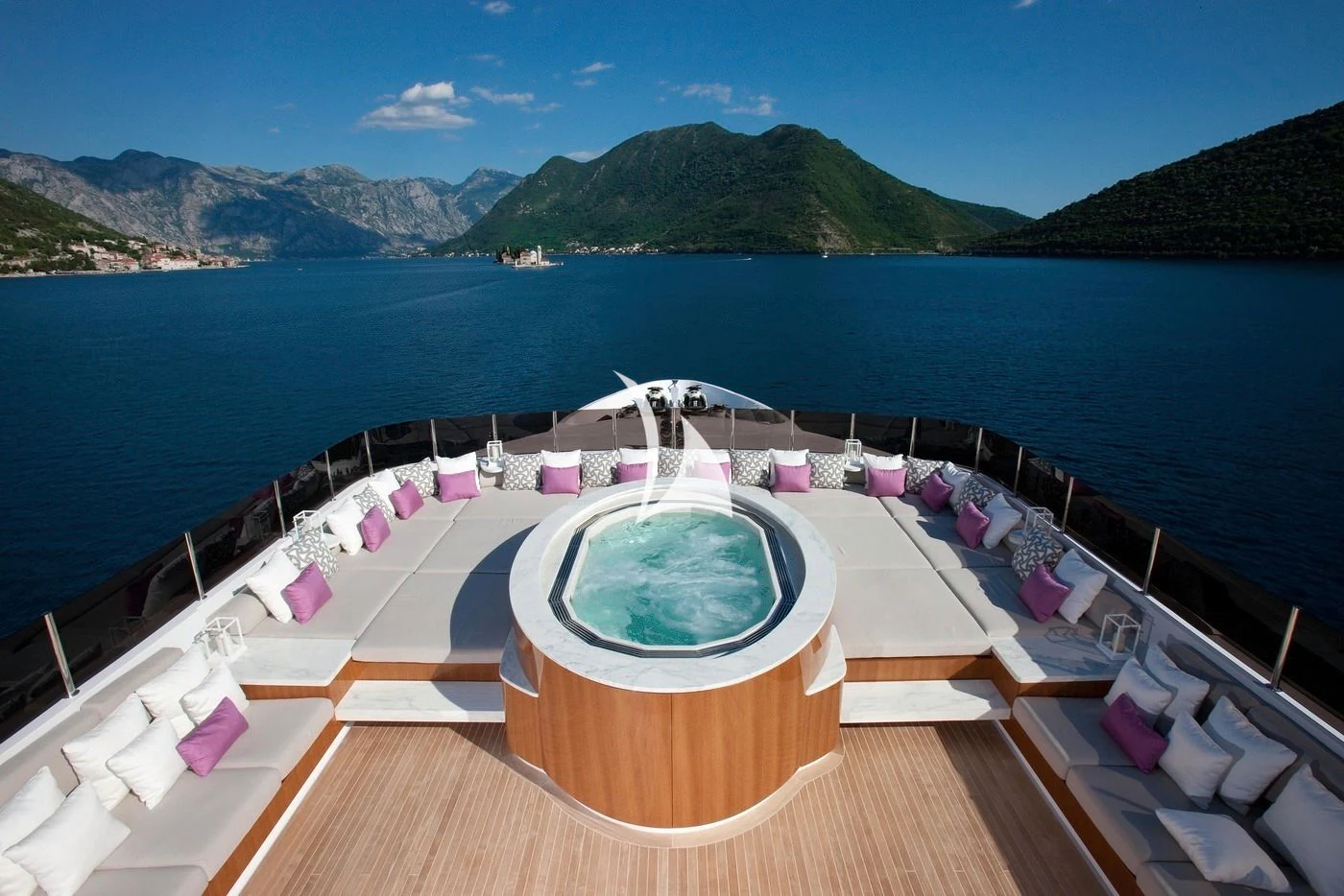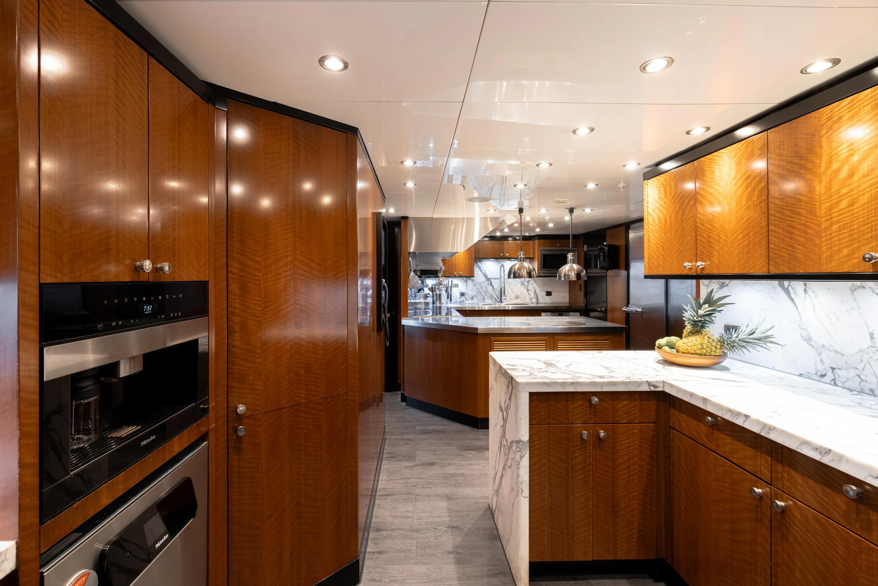 Outdoors, expansive deck spaces are both inviting and practical, with generous seating areas designed for entertaining and relaxation. Removable awnings on all three aft decks provide adaptable shade, enhancing comfort in any climate.