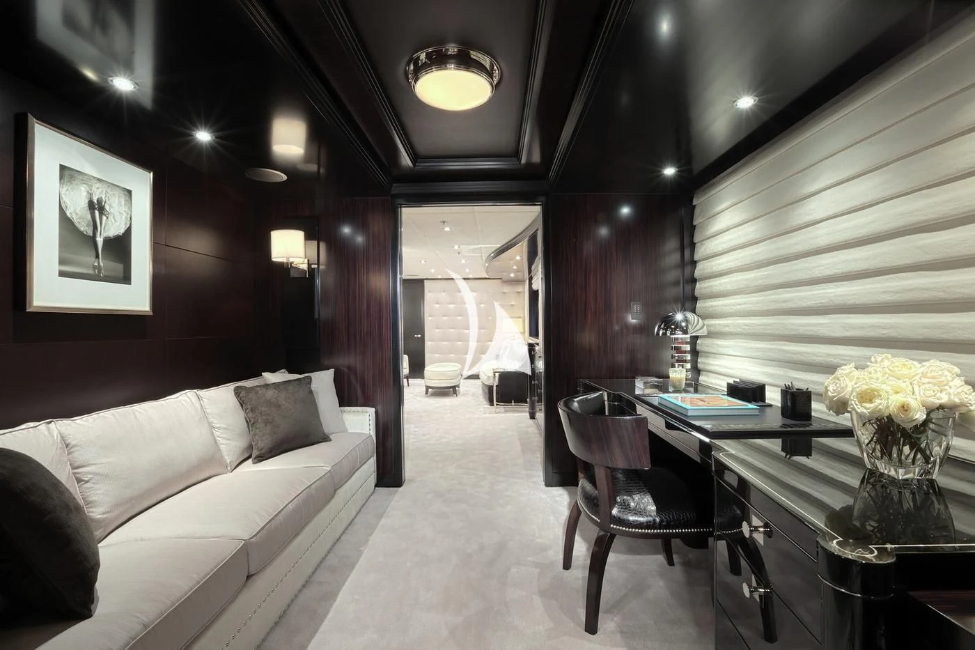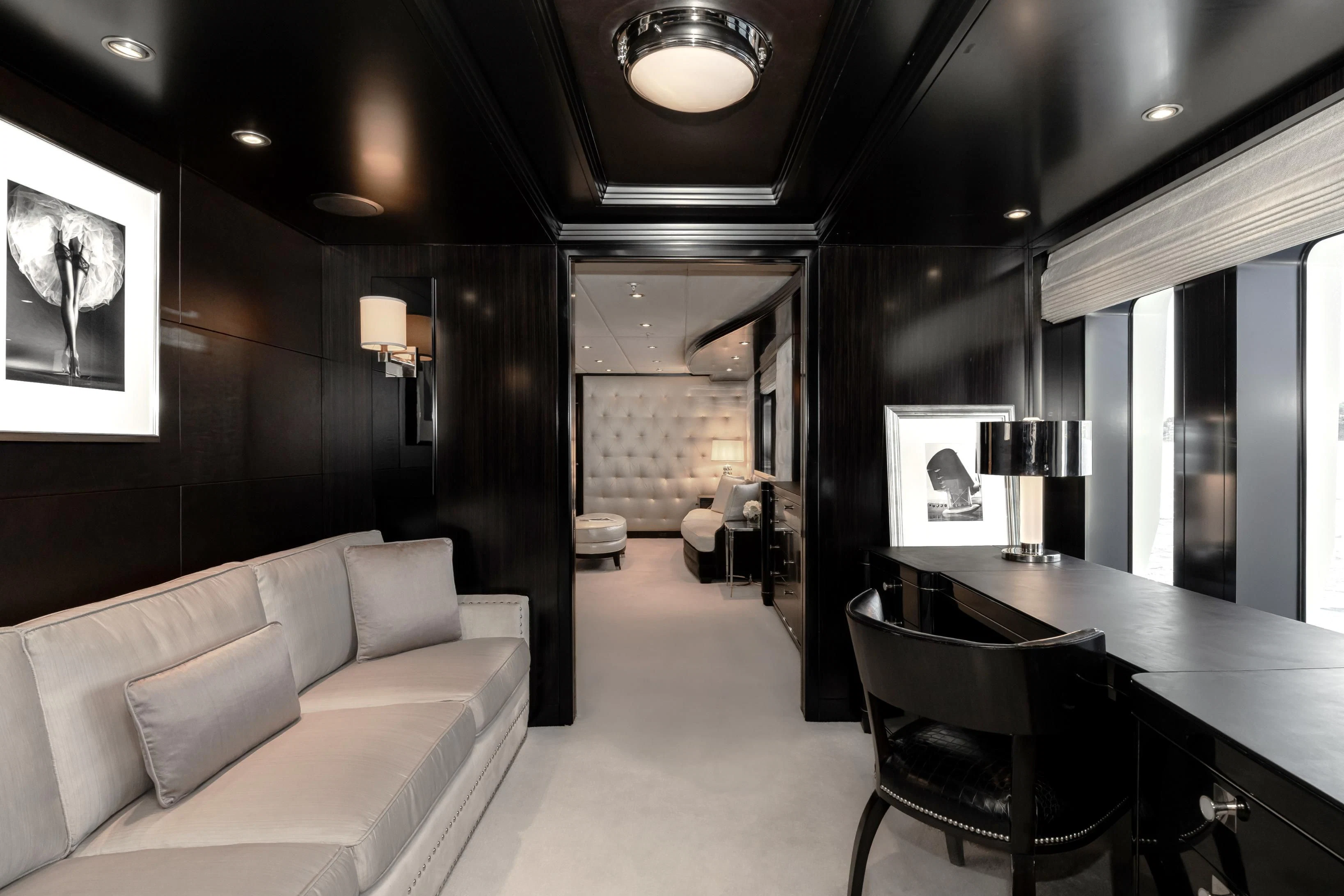Showcasing the owner’s distinctive design vision, CARPE DIEM features a striking juxtaposition of dark woods, light carpets, and neutral furnishings throughout. Vintage fashion photography, Art Deco antiques, and carefully curated furniture and styling create a sophisticated yet relaxed atmosphere across all interior spaces.
