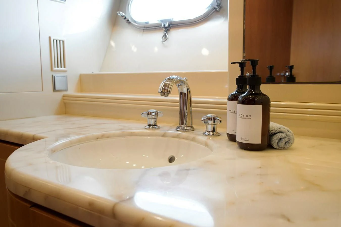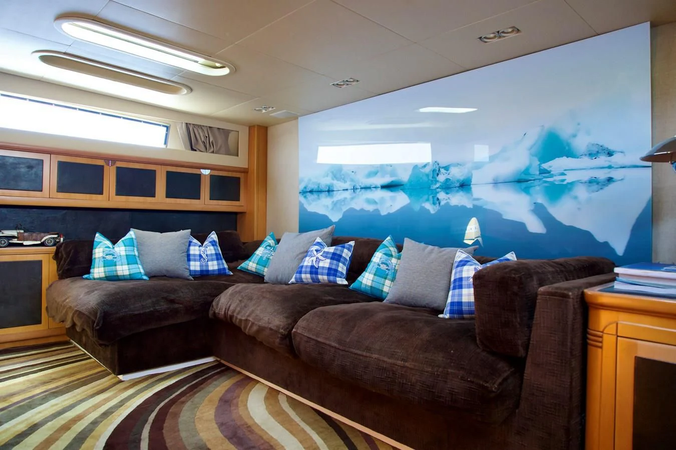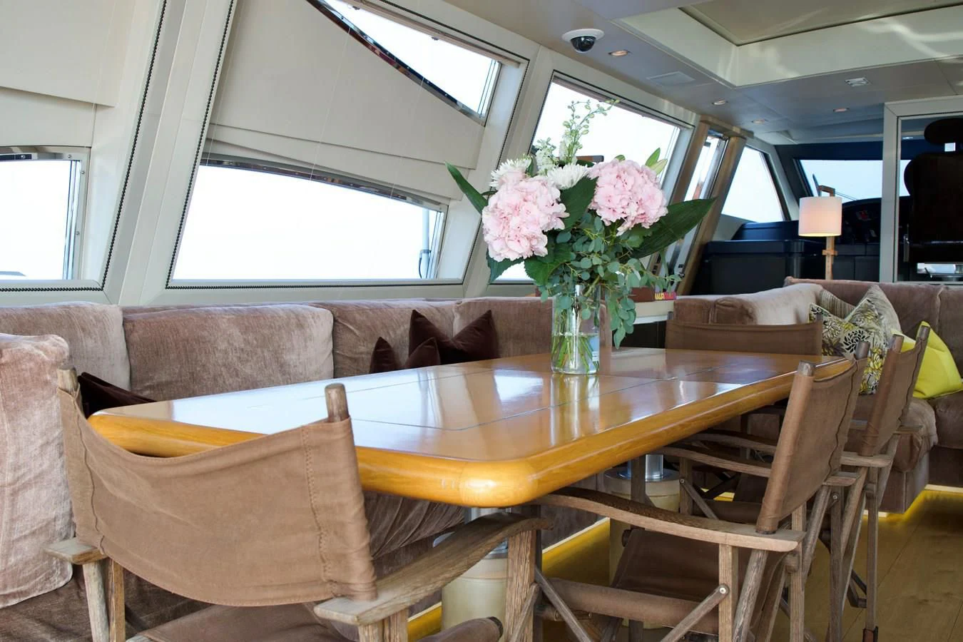 The main salon serves as an ideal socializing space with plush seating arrangements set against large windows offering unobstructed views of your surroundings – whether it’s a serene sunset or starlit skies. An elegant dining area adjacent to it allows guests to enjoy gourmet meals prepared by our world-class chef while enjoying beautiful vistas outside.