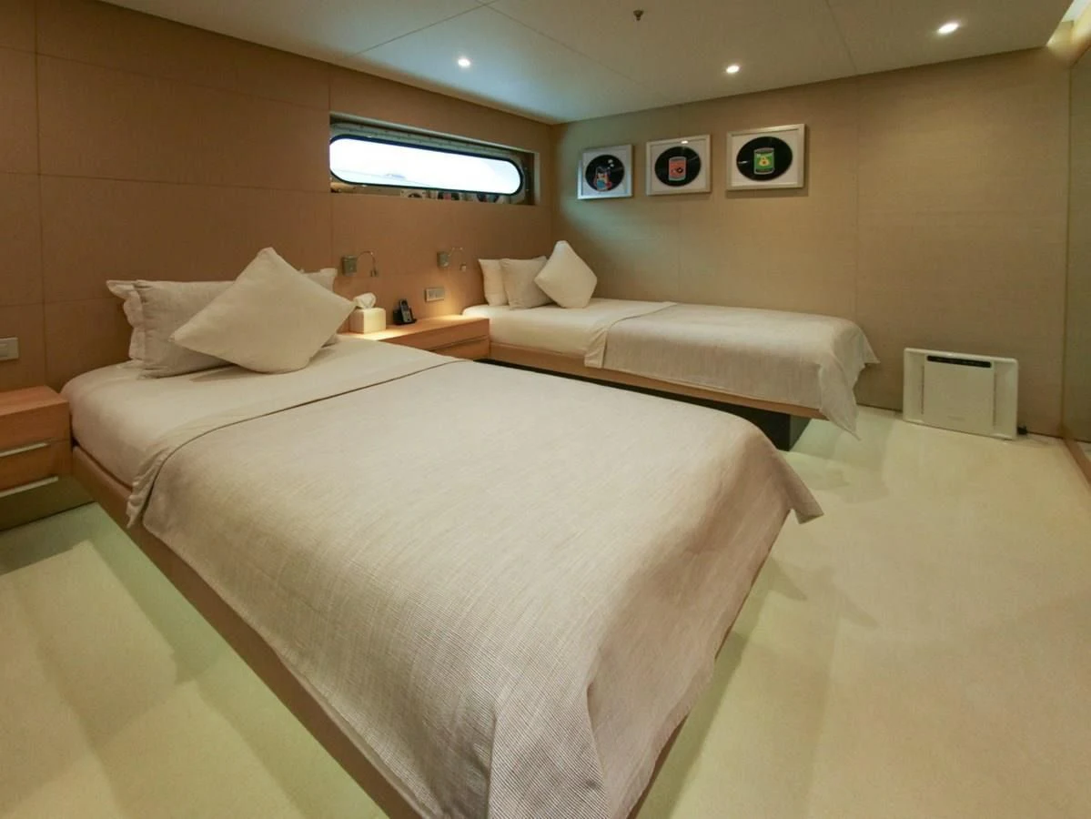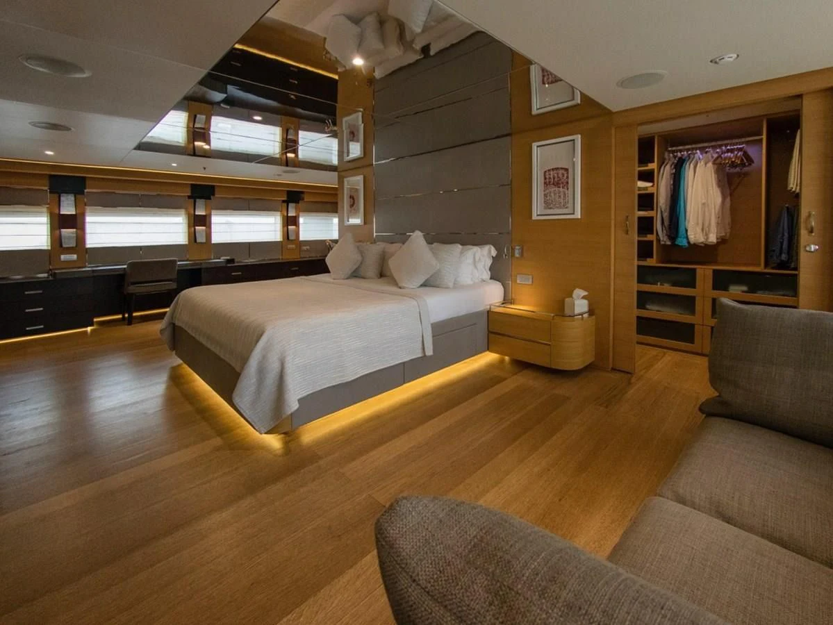 Inside DARLING, luxury takes on new dimensions. She comfortably accommodates up to ten guests across her five lavish cabins – each one meticulously designed to provide unrivaled comfort and style. The master stateroom stands out with its expansive layout, sumptuous furnishings, and stunning en-suite facilities that are second to none. Furthermore, seven dedicated crew members are always at hand to ensure every voyage aboard this gem is nothing short of extraordinary.
