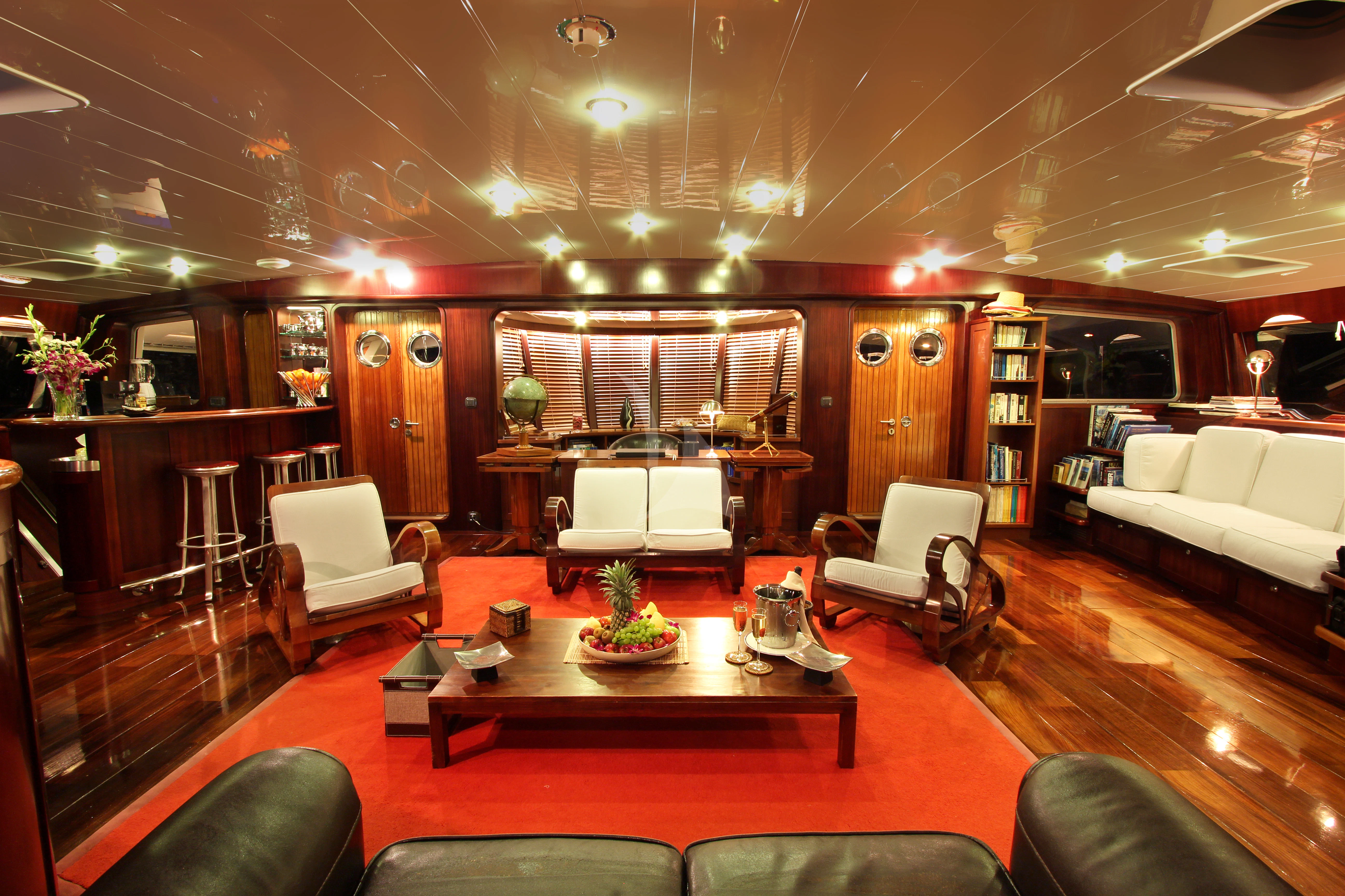 Her exterior design is a harmonious fusion of classic and contemporary elements. The aluminum hull material ensures robustness while retaining sleekness, contributing to her cruising speed of 12 knots and maximum speed of 15 knots. With a beam width reaching up to 50 feet or approximately 15.4 meters, DOUCE FRANCE boasts expansive deck spaces perfect for outdoor activities or simply basking in the sun-soaked ambiance on the sundeck.