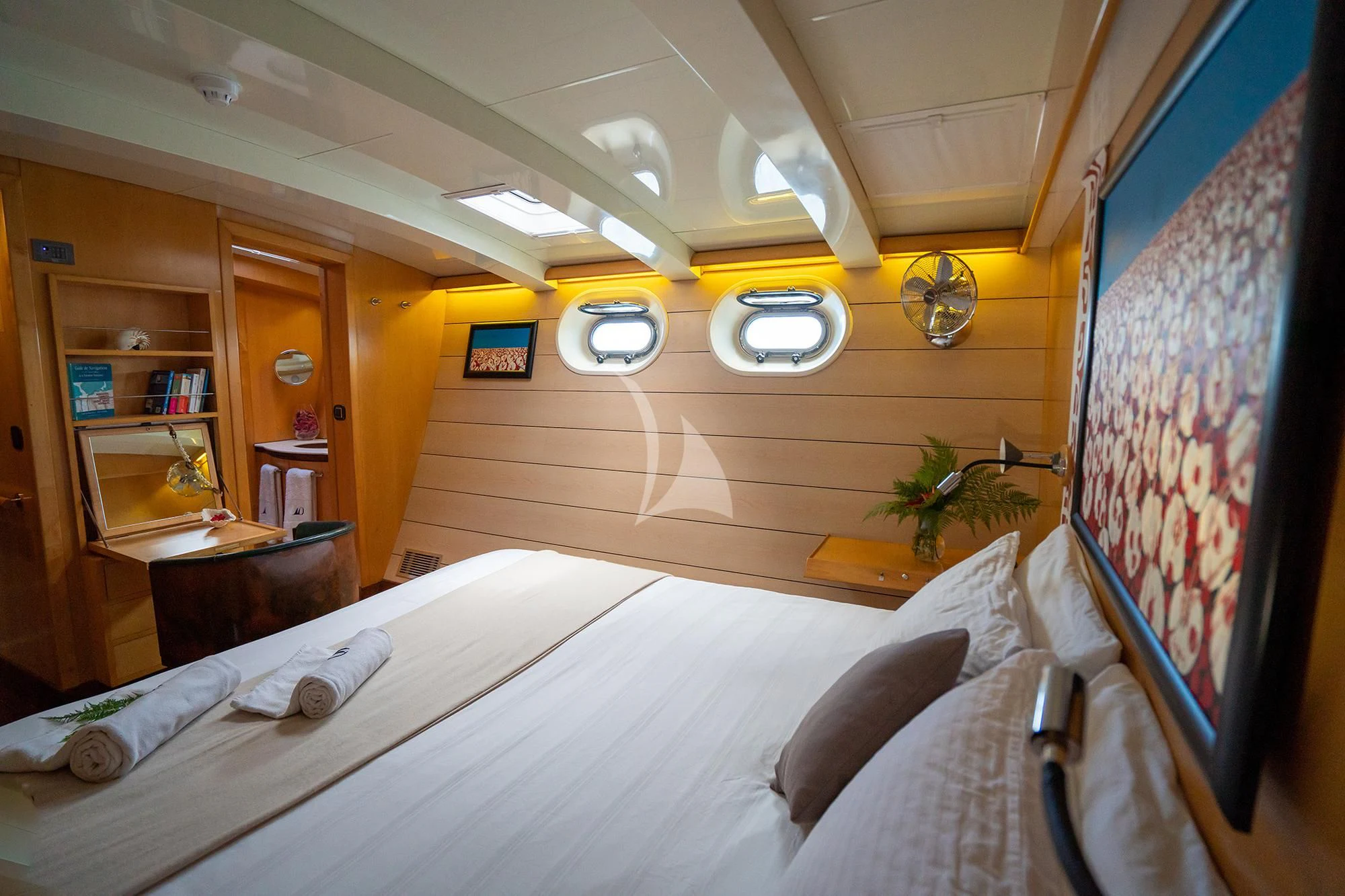 The interior of DOUCE FRANCE is as captivating as its exterior, offering an immersive experience into unparalleled luxury living on water. This floating paradise can comfortably accommodate up to twelve guests across six lavish cabins, each designed with meticulous attention to detail ensuring absolute comfort during your stay onboard. A crew of seven dedicated professionals are always at hand catering to every need and whim of the guests.
