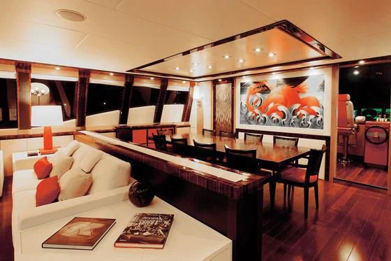 DRAGON's onboard amenities set new standards in luxury yachting experiences; from its grand main salon perfect for socializing or unwinding after a day full adventure at sea to its formal dining area where culinary delights are served against a backdrop of stunning seascapes; every space has been designed keeping in mind utmost comfort & leisure for guests.