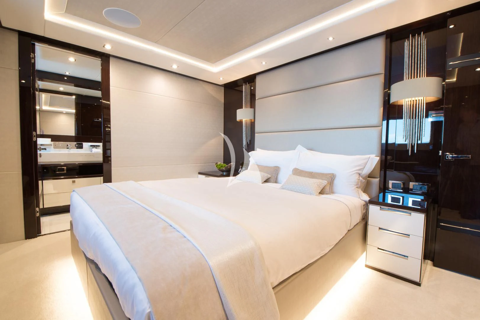 The master stateroom stands as an epitome of elegance and tranquility featuring plush furnishings, exquisite décor, ample storage space, and state-of-the-art entertainment systems – all bathed in natural light streaming through large windows offering mesmerizing sea views right from your bed! The additional staterooms are equally lavish ensuring every guest enjoys their own private haven onboard E-MOTION.