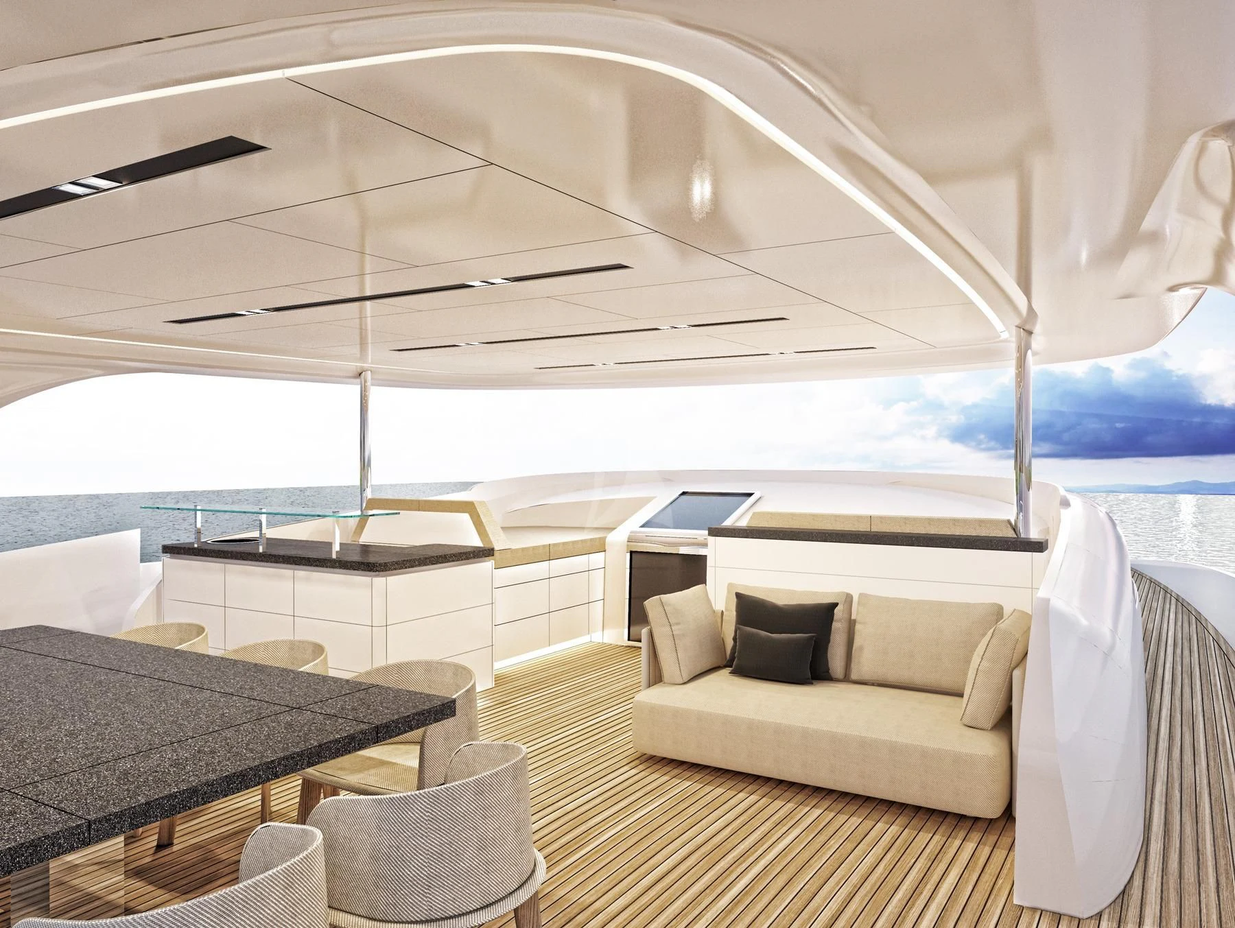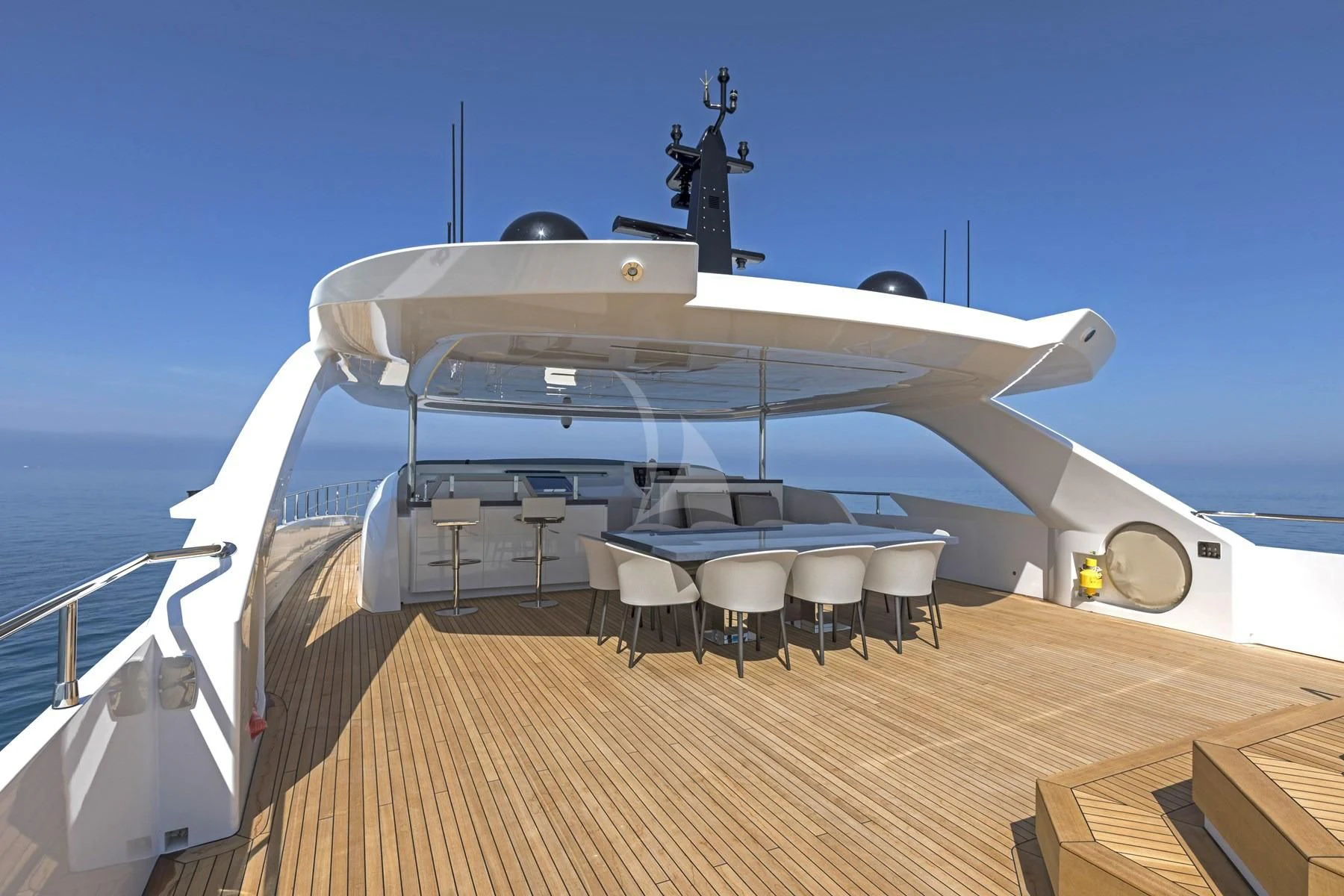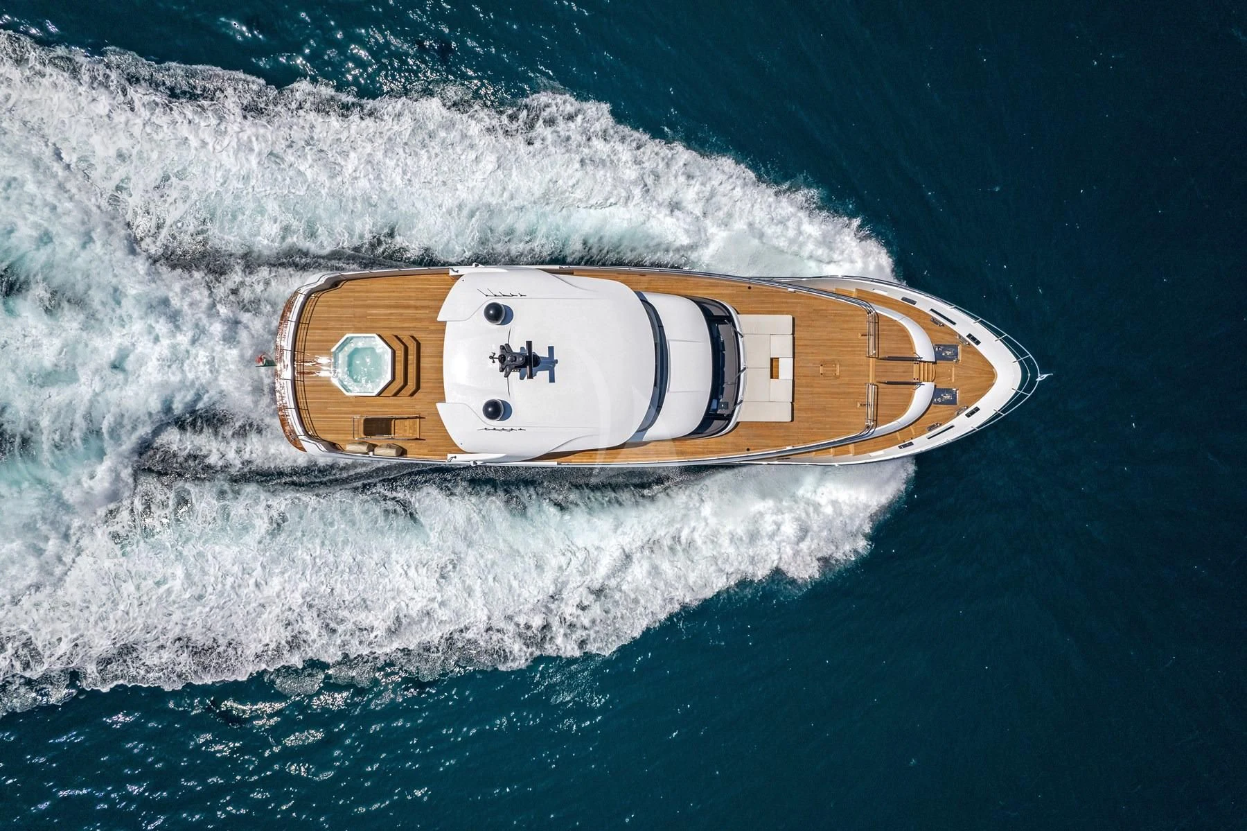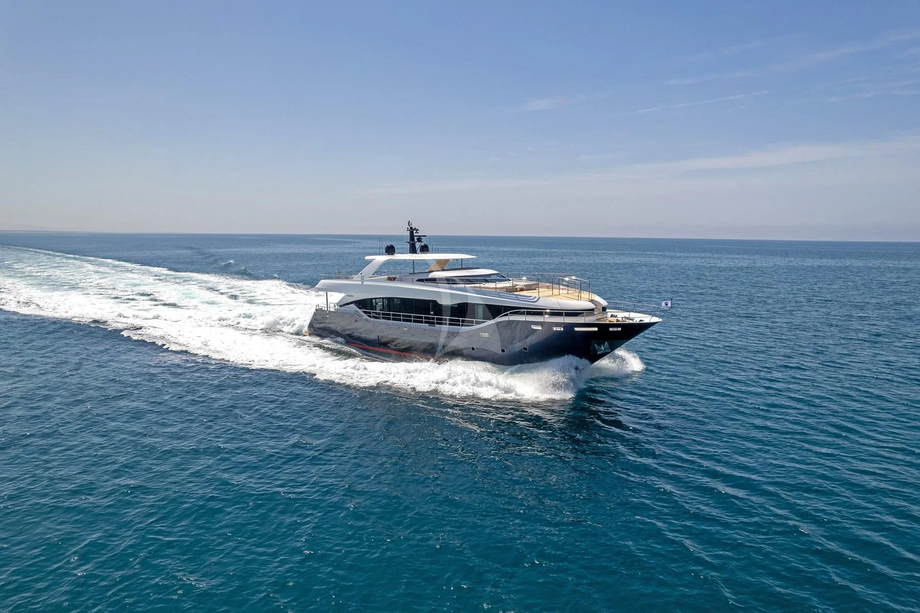 This 100’ Maiora 30 Walkaround model from the Italian brand Maiora of Next Group, is the result of a renovated in-house production, that stands out with her large outdoor areas and broad side walkways allowing easy and safe passenger access from stern to bow.