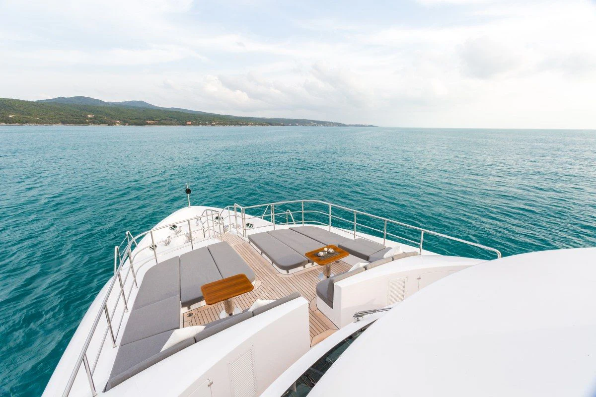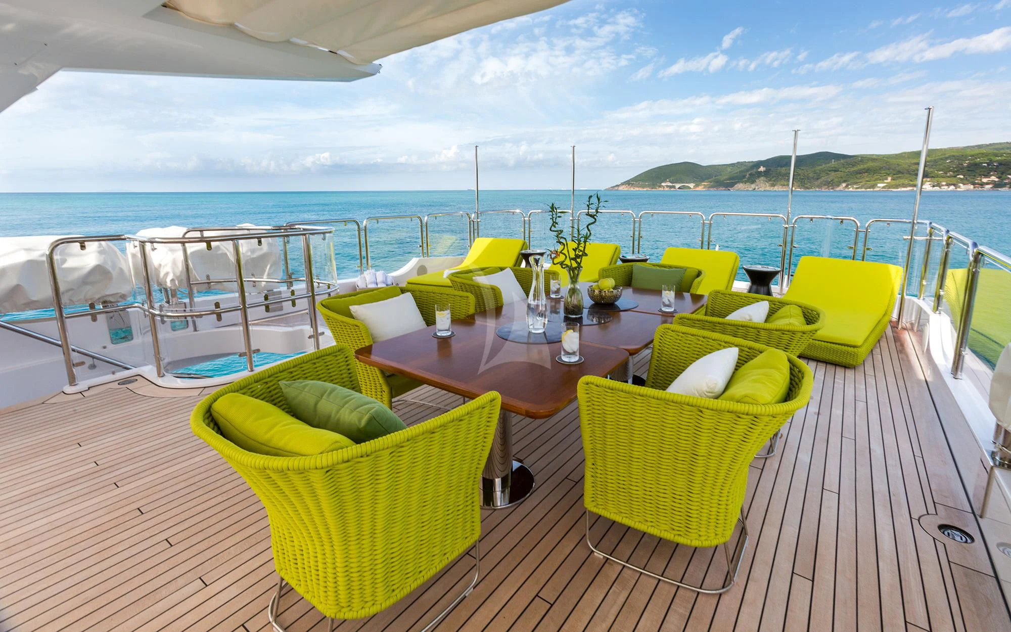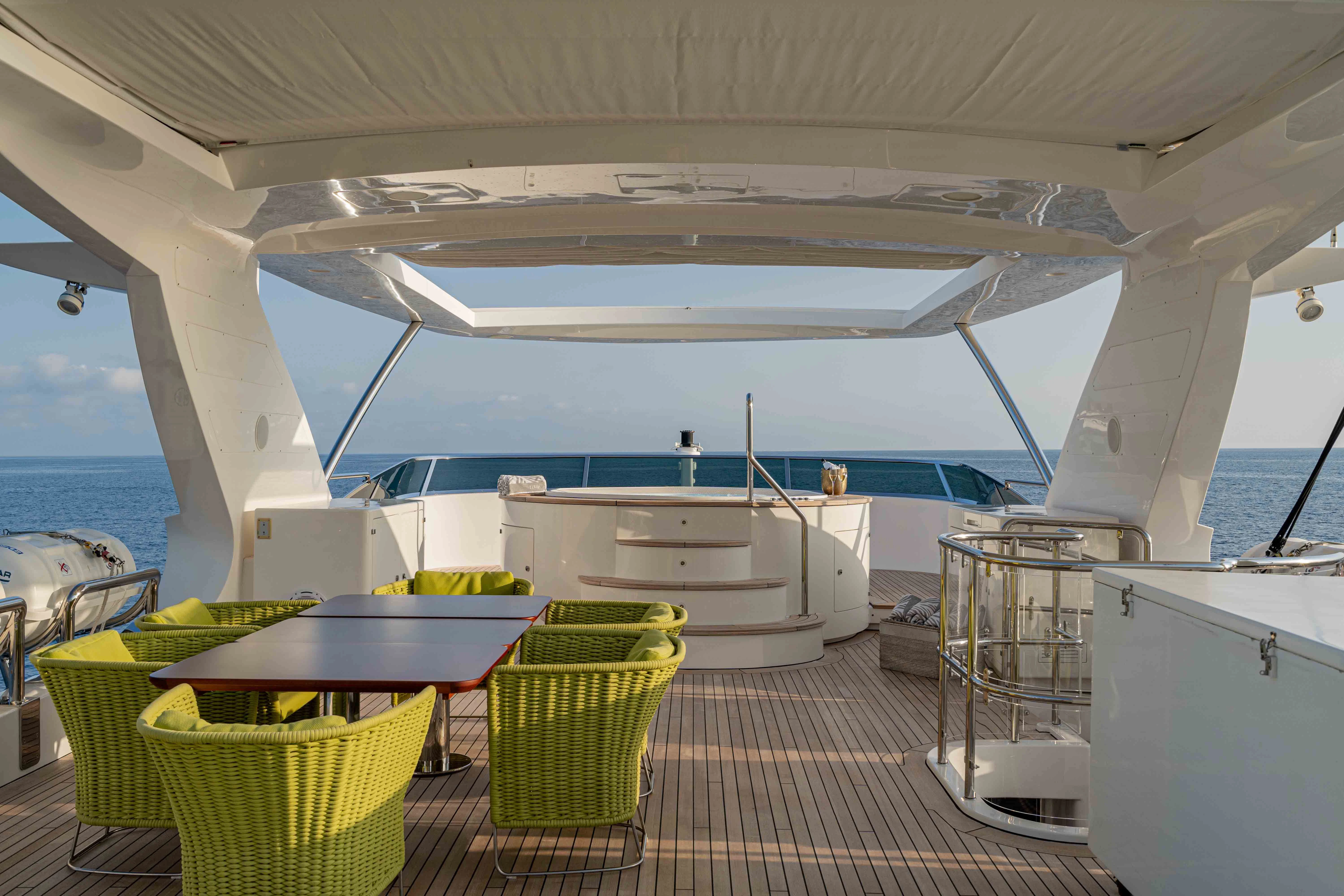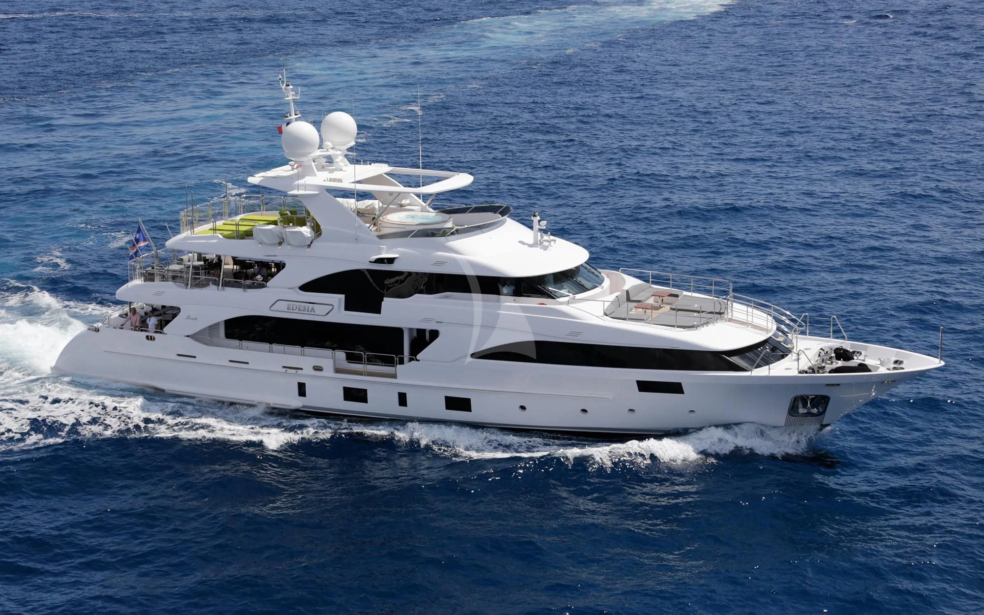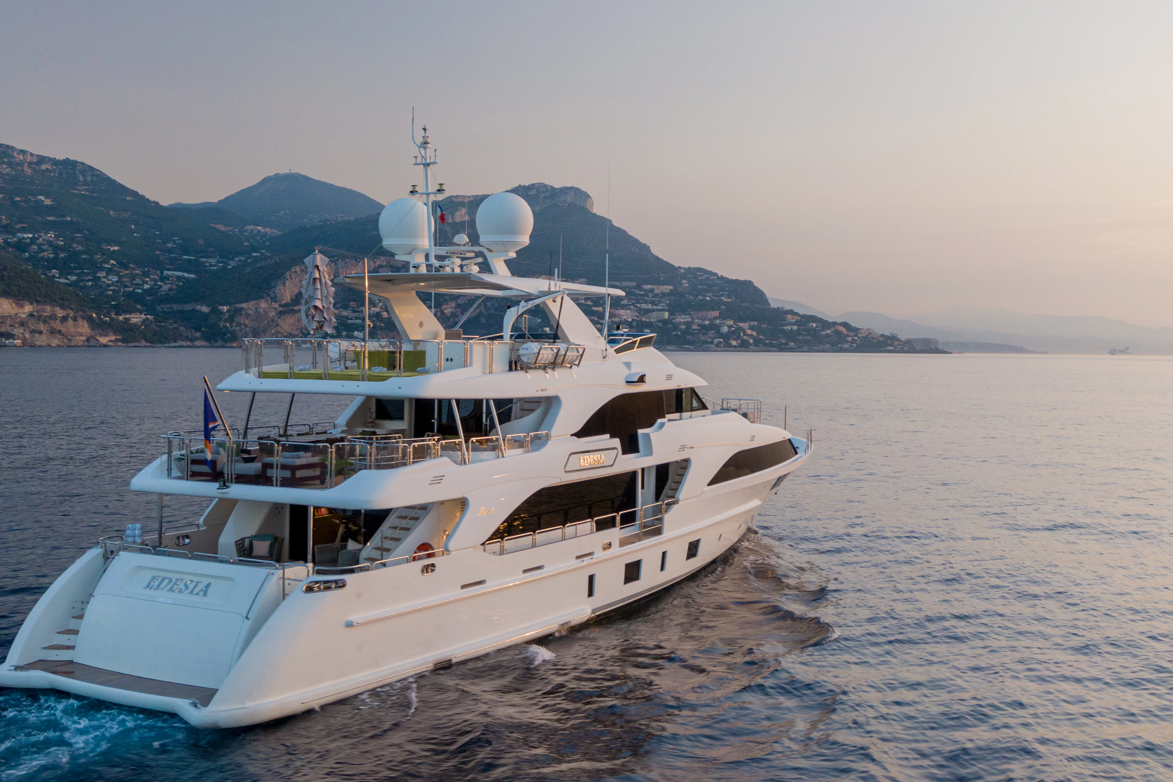 The exterior design of EDESIA is a showcase of elegance and sophistication. The spacious sundeck invites guests to bask in the sun or relax in the Jacuzzi while taking in panoramic views of the ocean. Underwater lights add a magical touch to evening gatherings on deck, creating an enchanting atmosphere for alfresco dining or cocktail parties under the stars. Among her many amenities are at-anchor stabilizers ensuring smooth cruising even at her top speed of 15 knots.