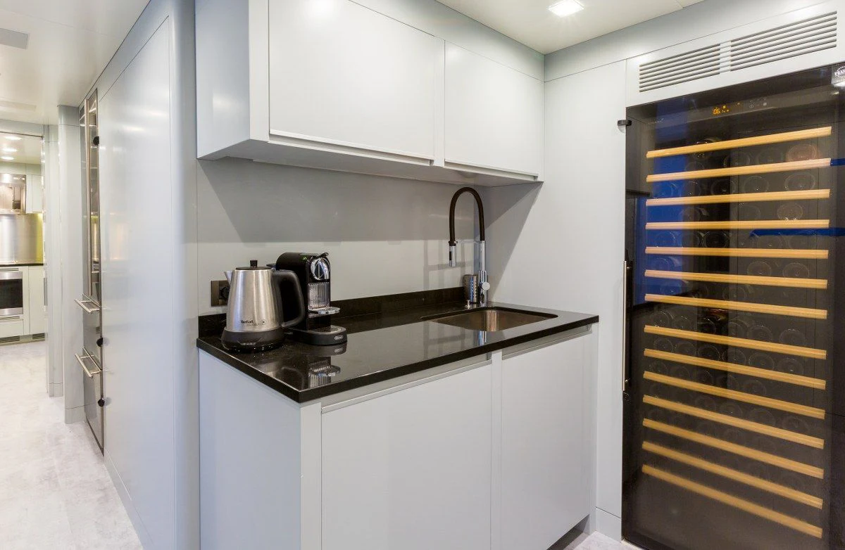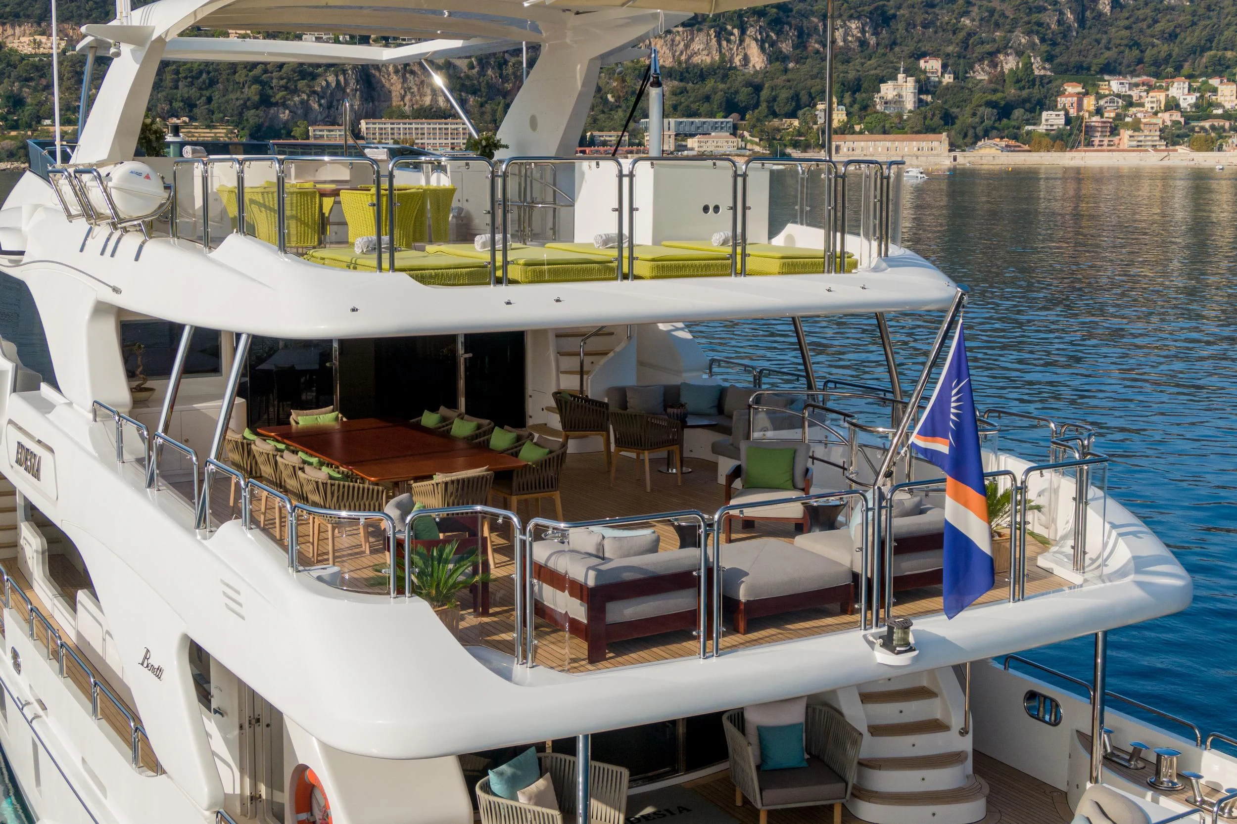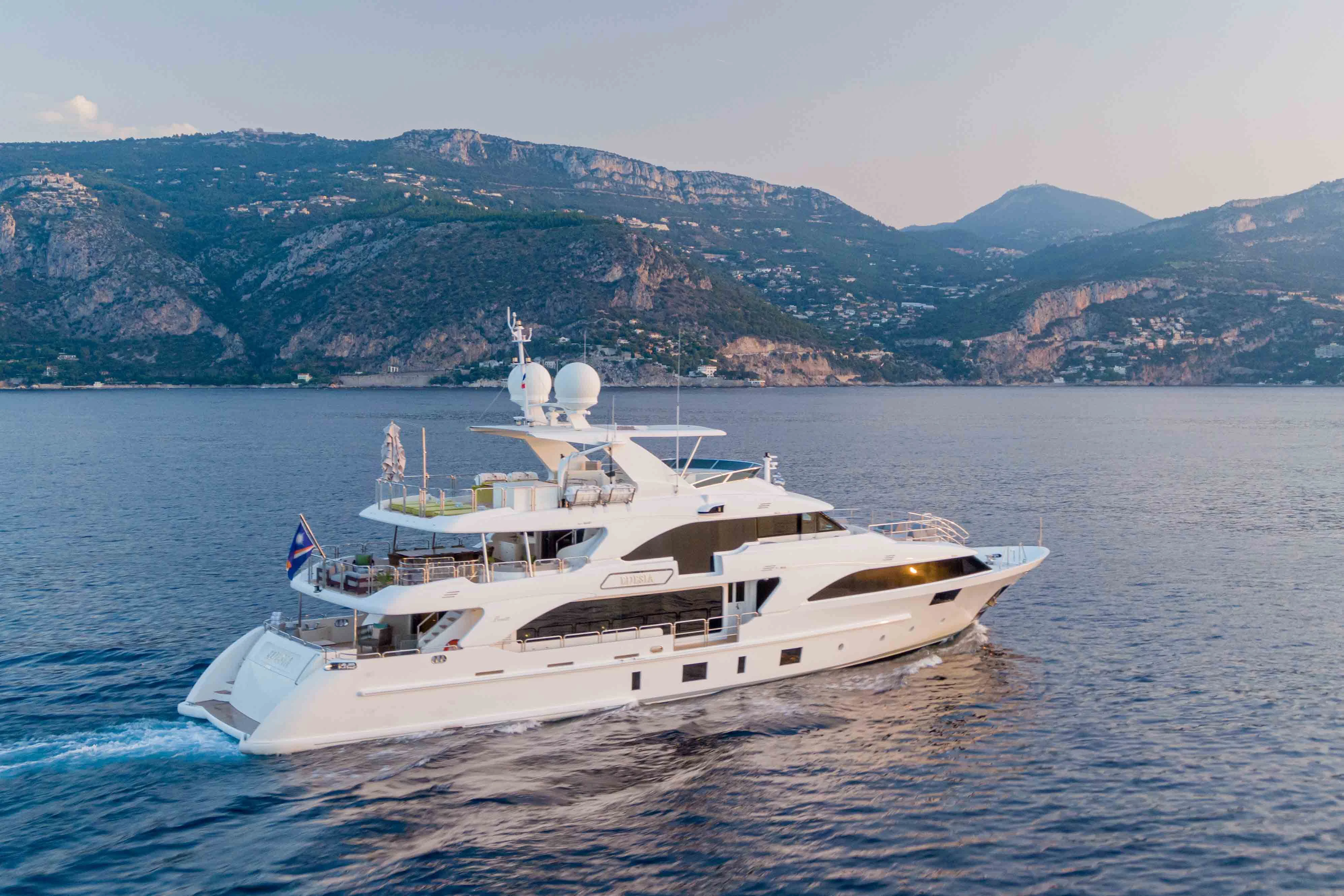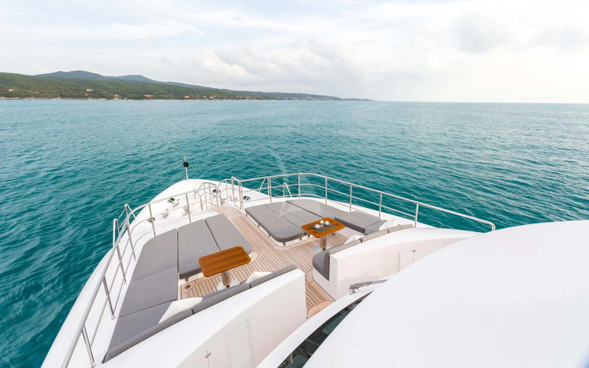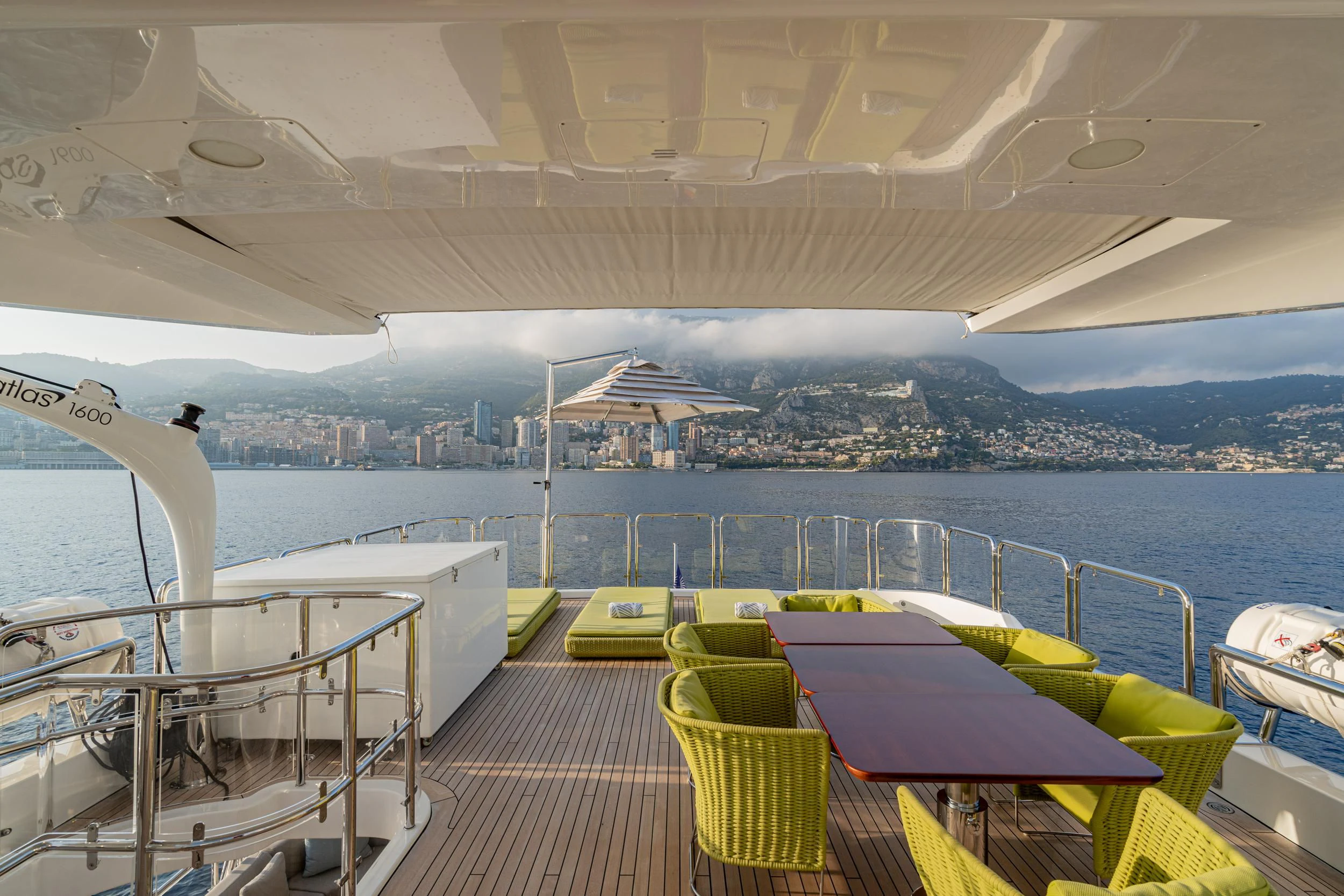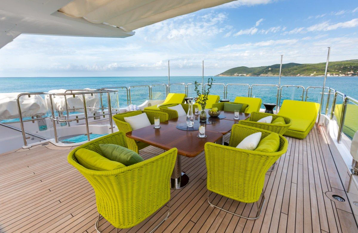 The exterior design of EDESIA is a showcase of elegance and sophistication. The spacious sundeck invites guests to bask in the sun or relax in the Jacuzzi while taking in panoramic views of the ocean. Underwater lights add a magical touch to evening gatherings on deck, creating an enchanting atmosphere for alfresco dining or cocktail parties under the stars. Among her many amenities are at-anchor stabilizers ensuring smooth cruising even at her top speed of 15 knots.