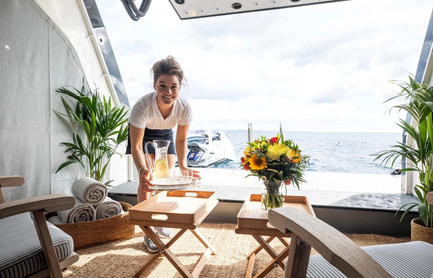 The main salon serves as a hub for entertainment – equipped with state-of-the-art audio-visual systems – while also offering an inviting space for relaxation after a day filled with adventure on the high seas. A fully equipped gym caters to health-conscious guests who wish not to break their fitness routine even when at sea, whereas those seeking relaxation can indulge in soothing Jacuzzi sessions under open skies or unwind at the beach club.