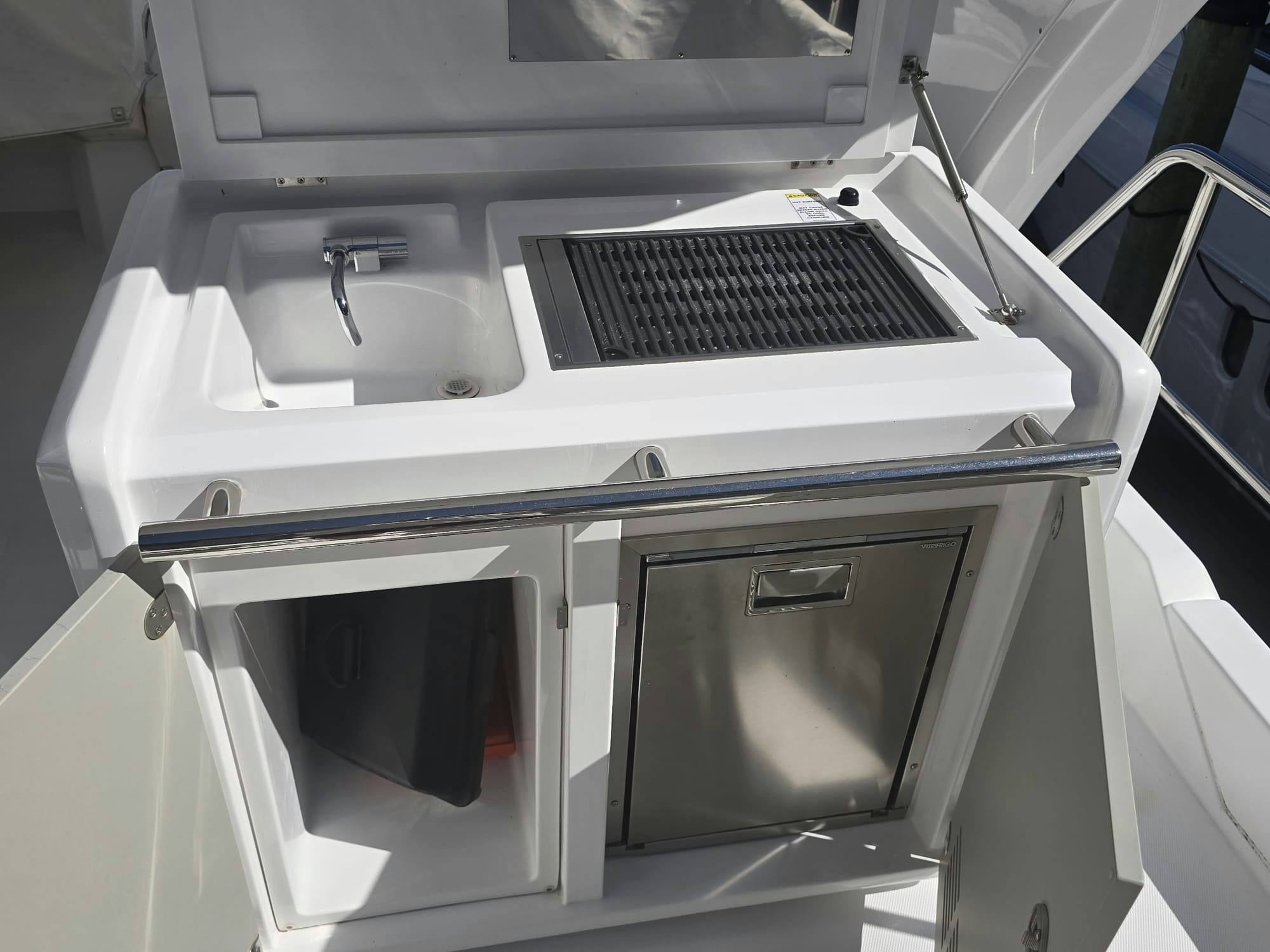 Inside, natural light floods every room, enhancing the spacious feel of the main salon and galley, which is conveniently positioned for seamless entertaining. The salon boasts a large U-shaped seating area with an adjustable table, ideal for social gatherings or simply lounging with a view. The galley is equipped with top-tier appliances and a power-opening window to let in fresh air and sunlight.