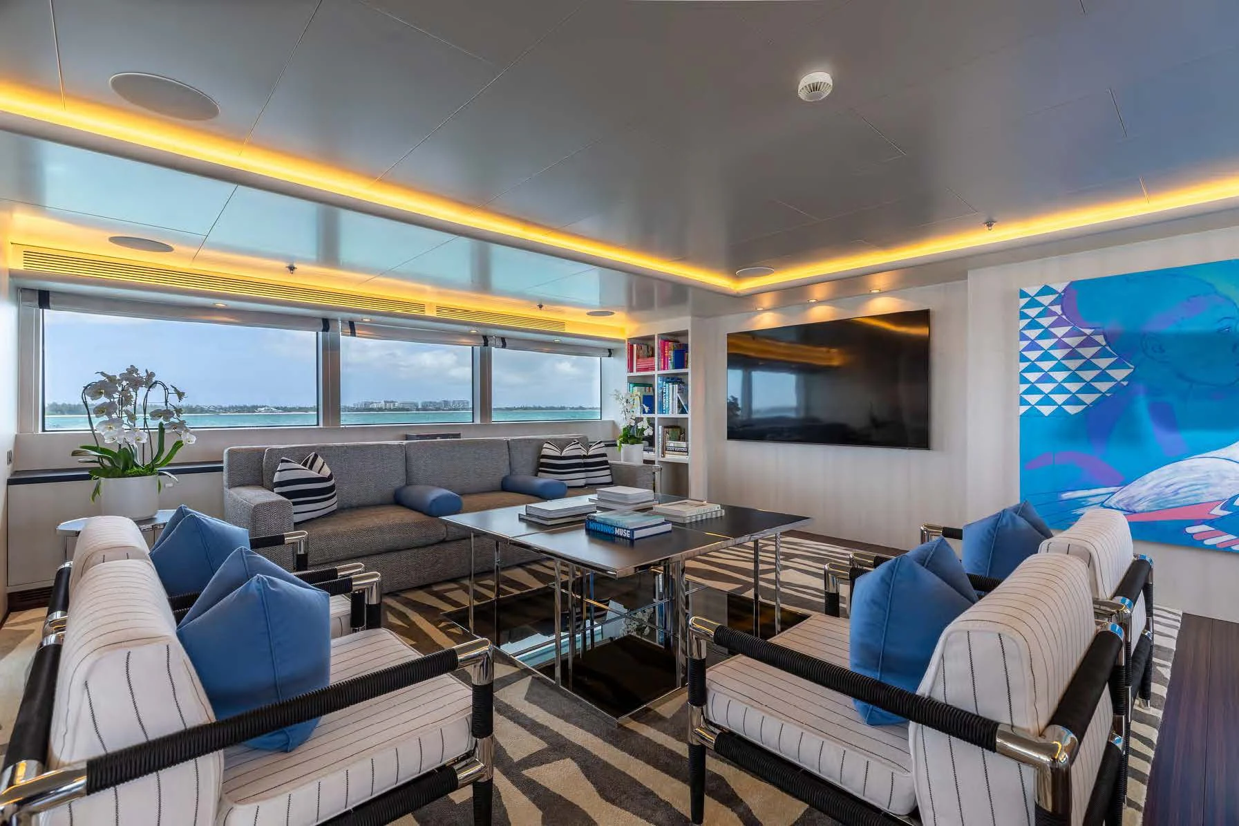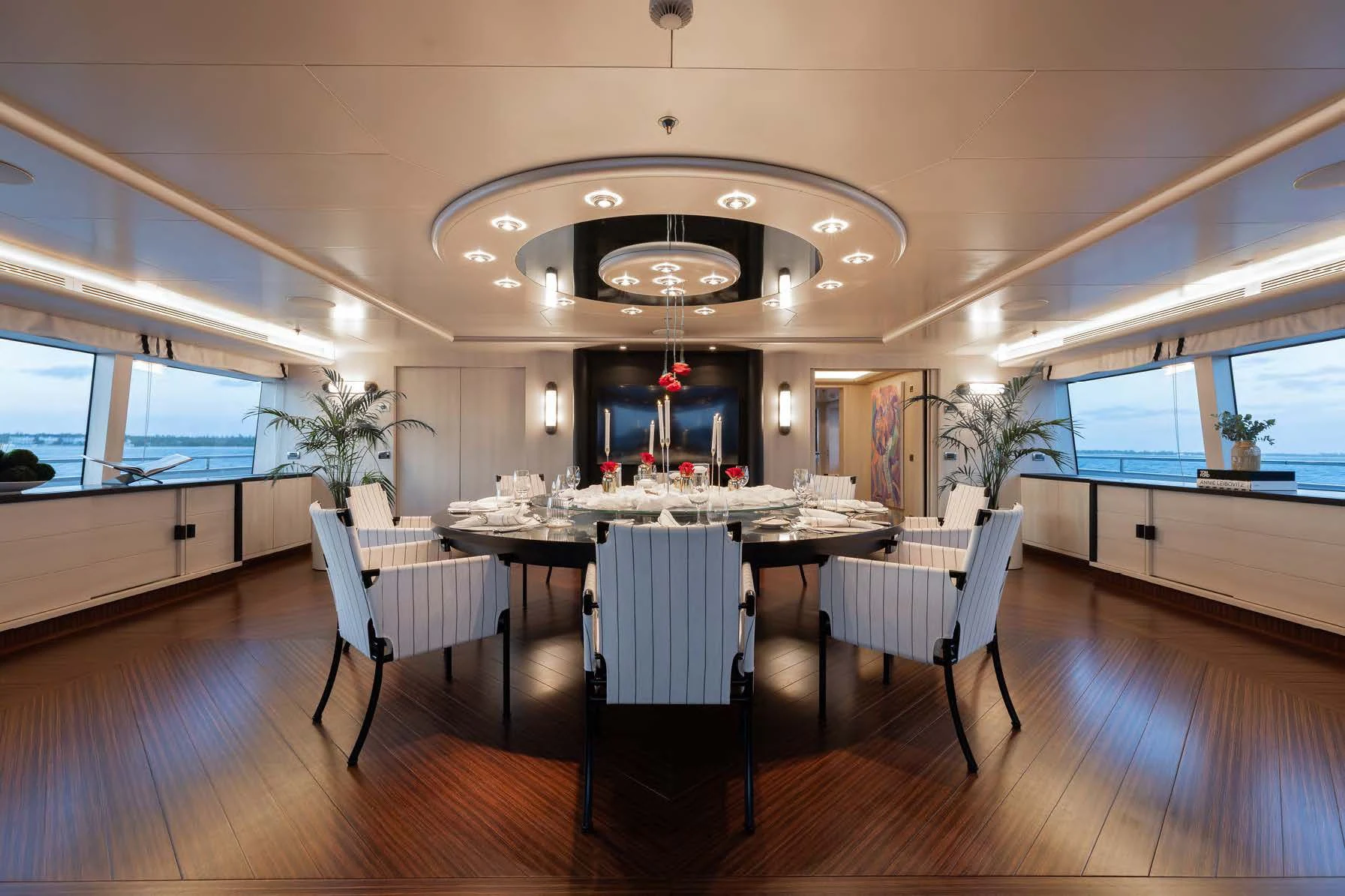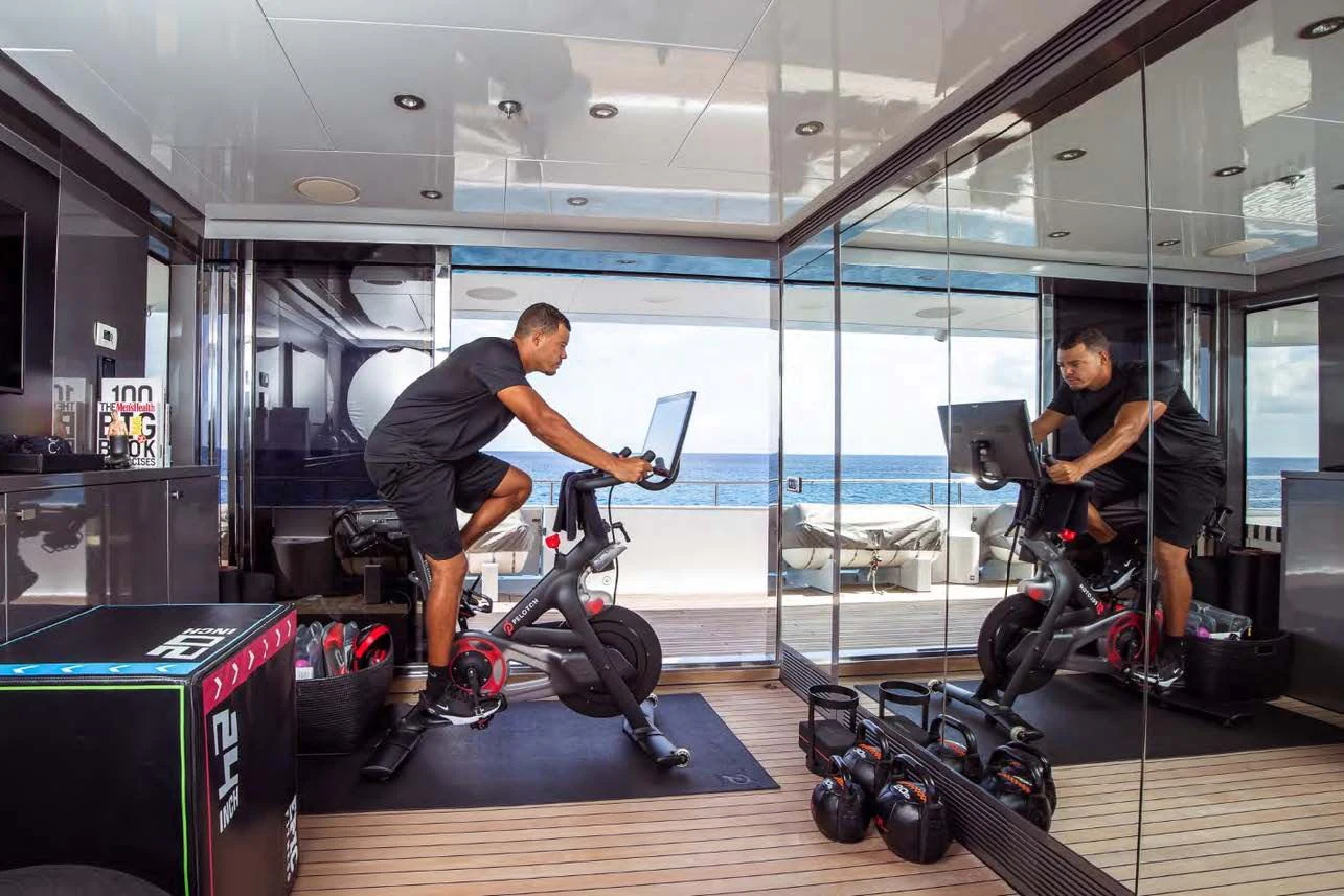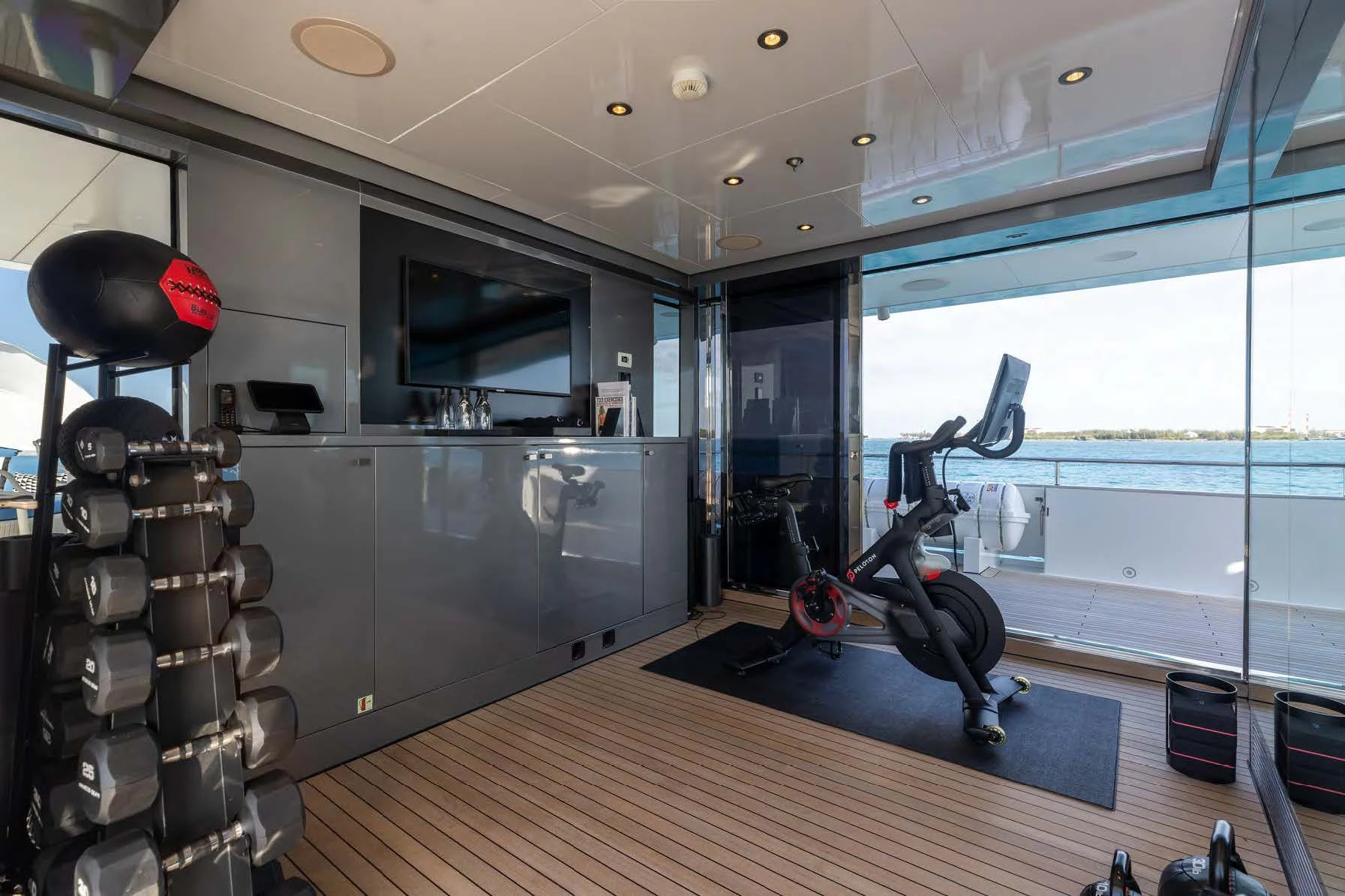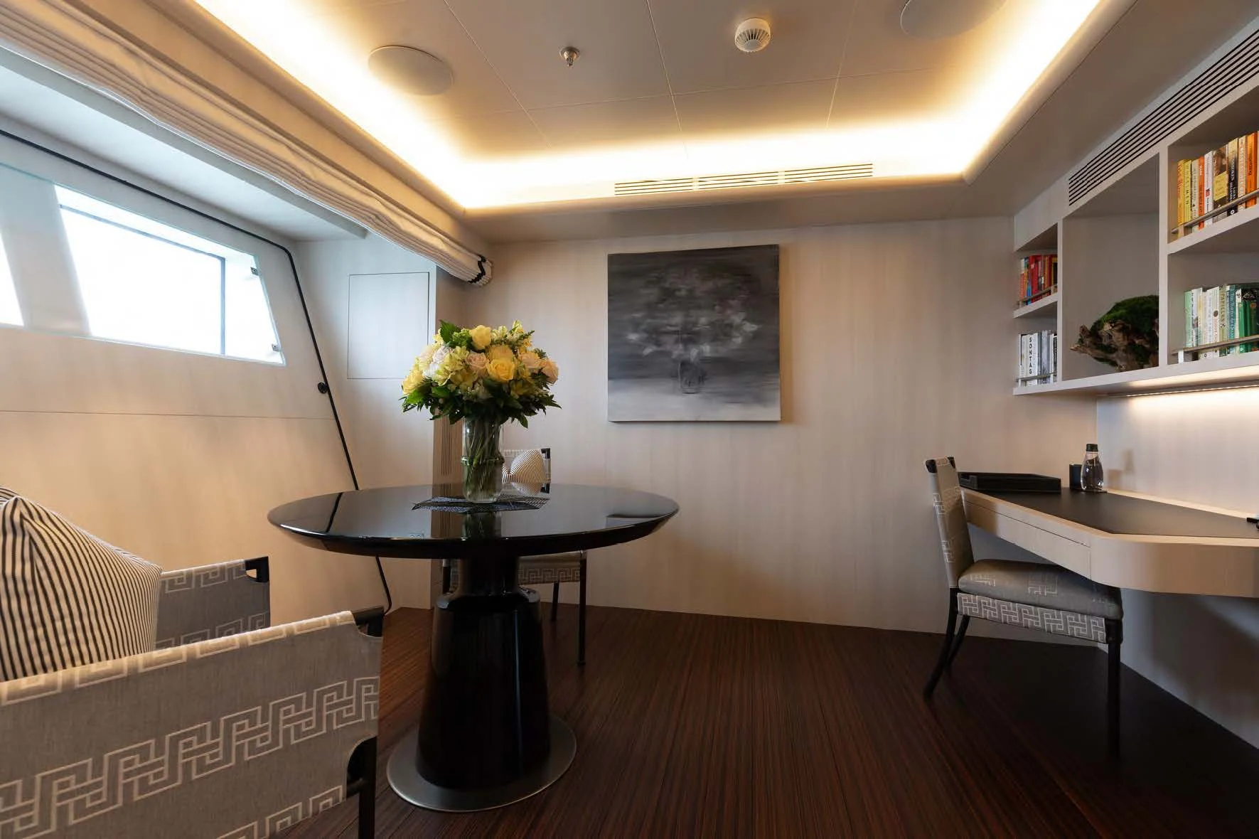 The main salon serves as the heart of social interactions on board ETERNITY offering plush seating arrangements perfect for intimate gatherings or grand celebrations alike. Adjacent lies the formal dining area where guests can indulge in gastronomic delights prepared by our world-class chef while enjoying panoramic views of the sea beyond. For those seeking wellness during their voyage, our state-of-the-art gymnasium provides all you need for maintaining your fitness regime away from home.