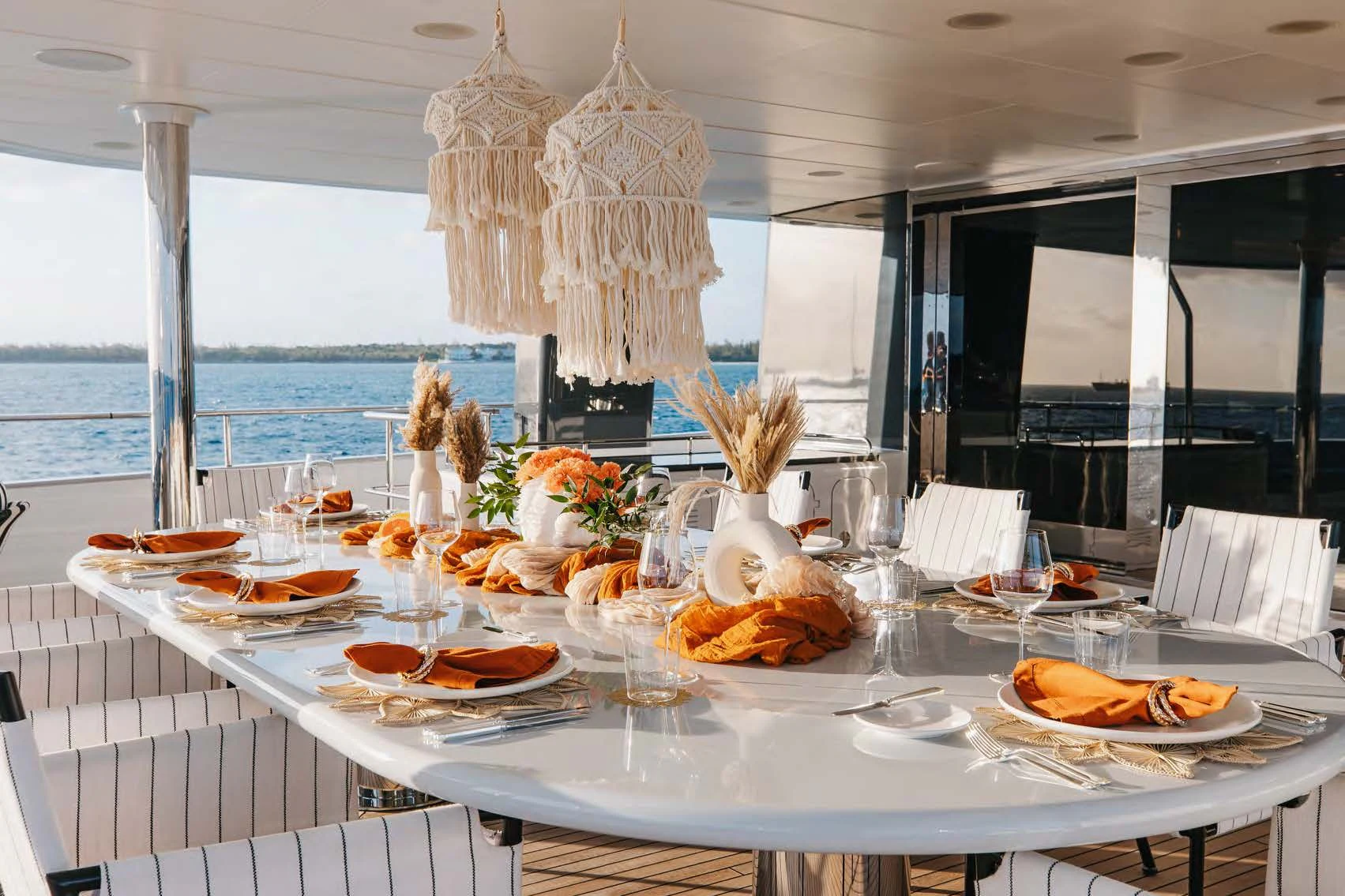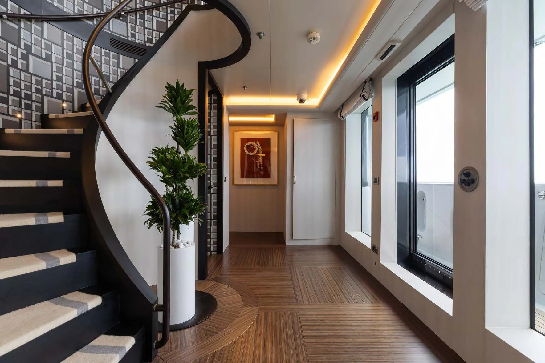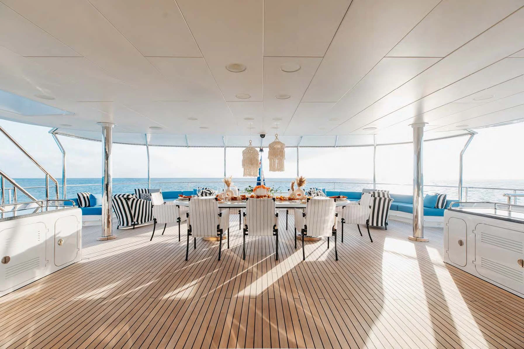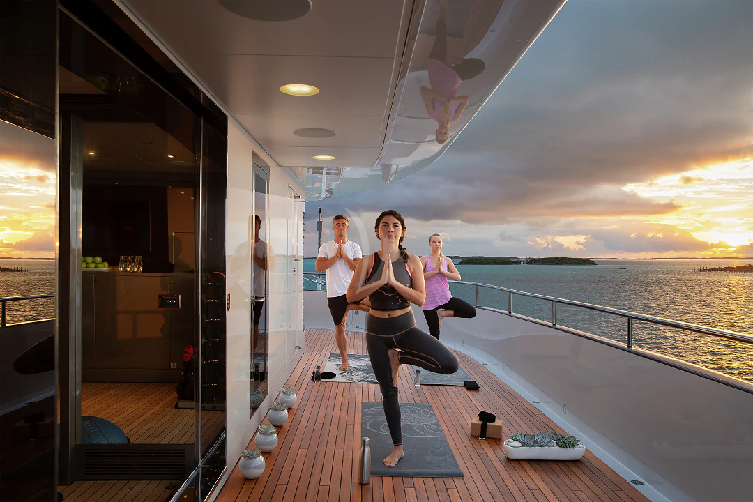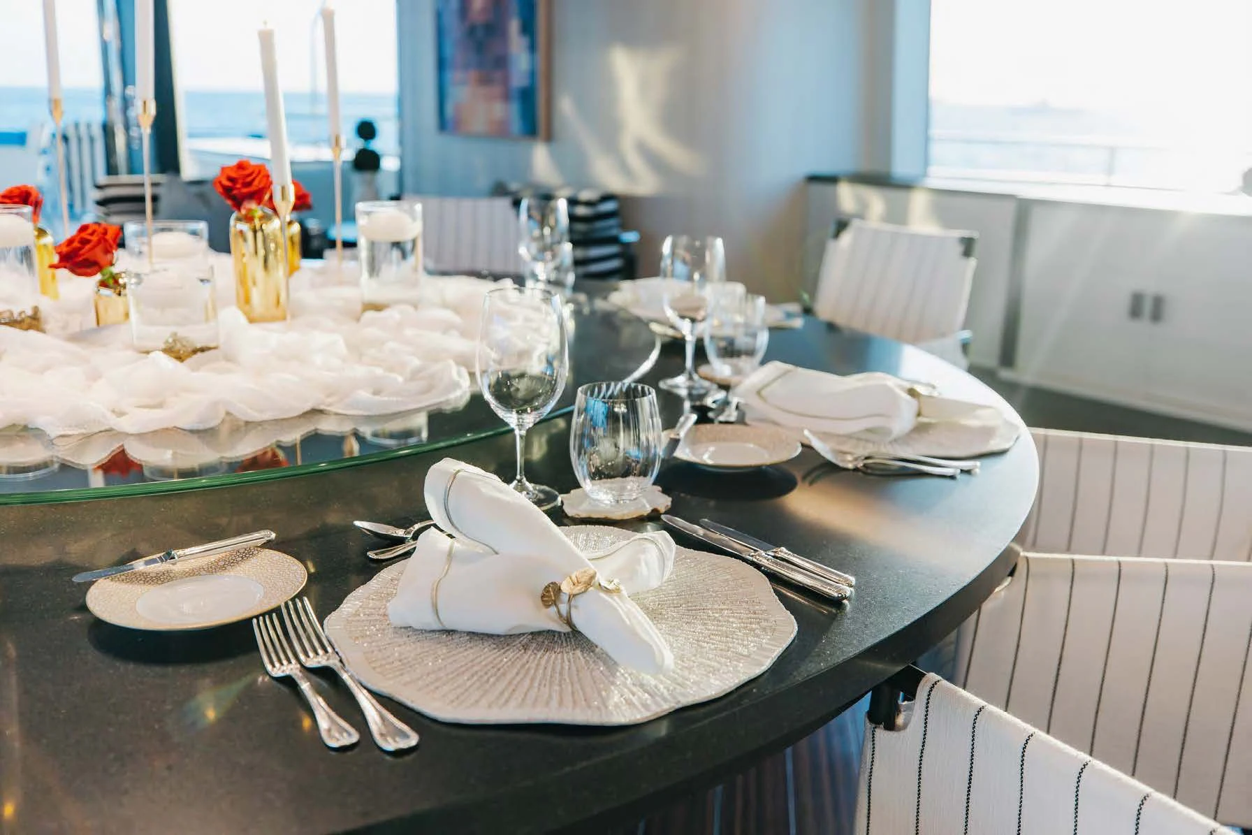 The main salon serves as the heart of social interactions on board ETERNITY offering plush seating arrangements perfect for intimate gatherings or grand celebrations alike. Adjacent lies the formal dining area where guests can indulge in gastronomic delights prepared by our world-class chef while enjoying panoramic views of the sea beyond. For those seeking wellness during their voyage, our state-of-the-art gymnasium provides all you need for maintaining your fitness regime away from home.
