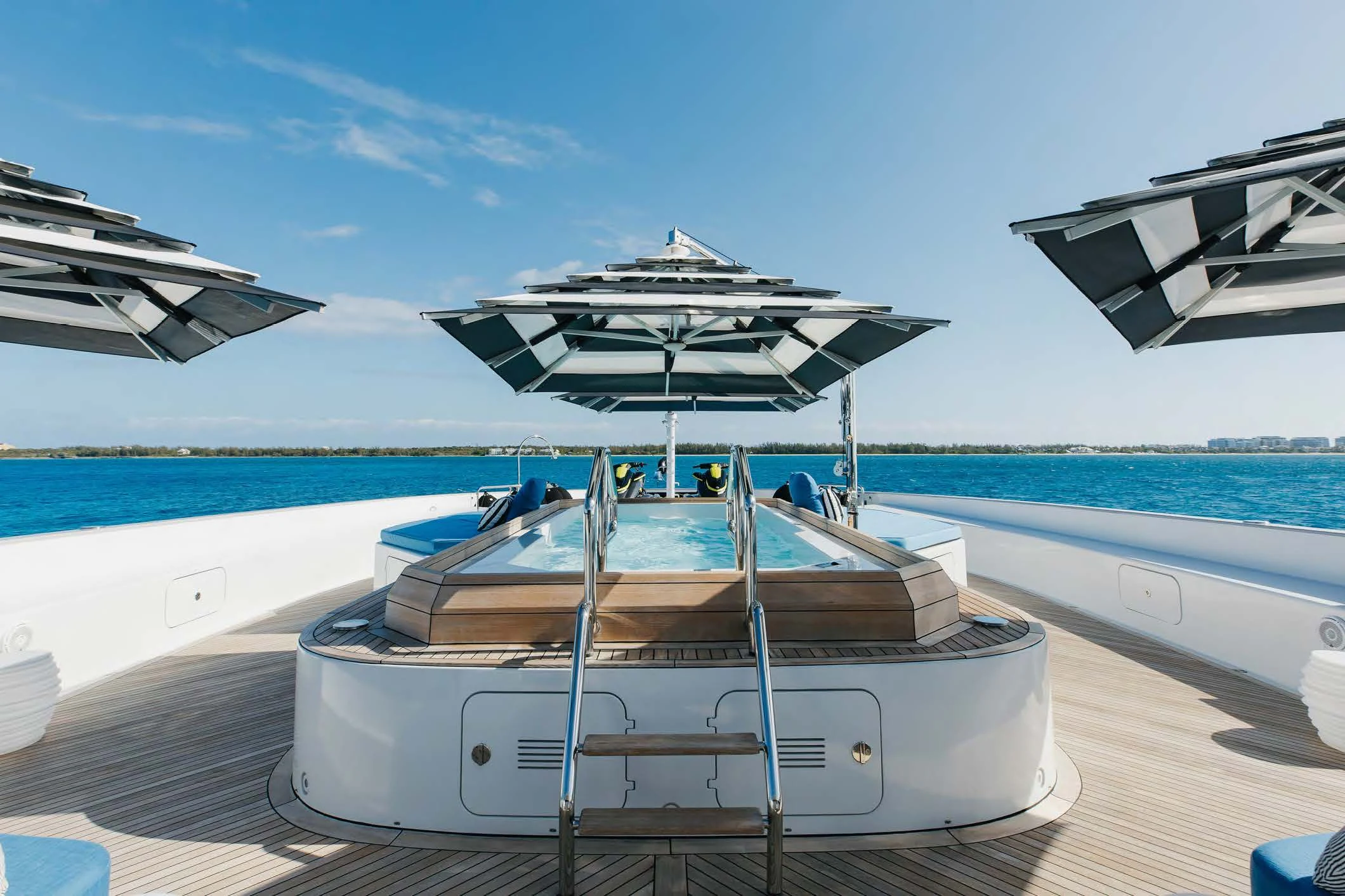 ETERNITY also boasts an array of amenities designed for entertainment, relaxation, and convenience including a Jacuzzi offering breathtaking views under open skies; Stabilizers ensuring smooth sailing at all times; High-speed Wi-Fi connectivity keeping you connected with your world while you sail into new horizons; An elevator providing easy access across different decks – truly encapsulating what it means to experience luxury on water.