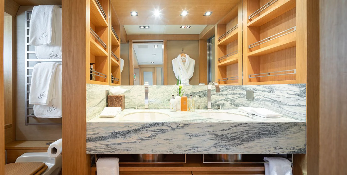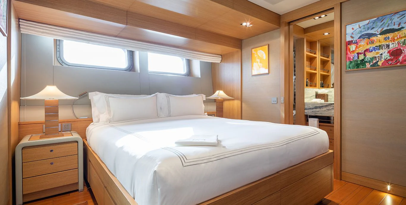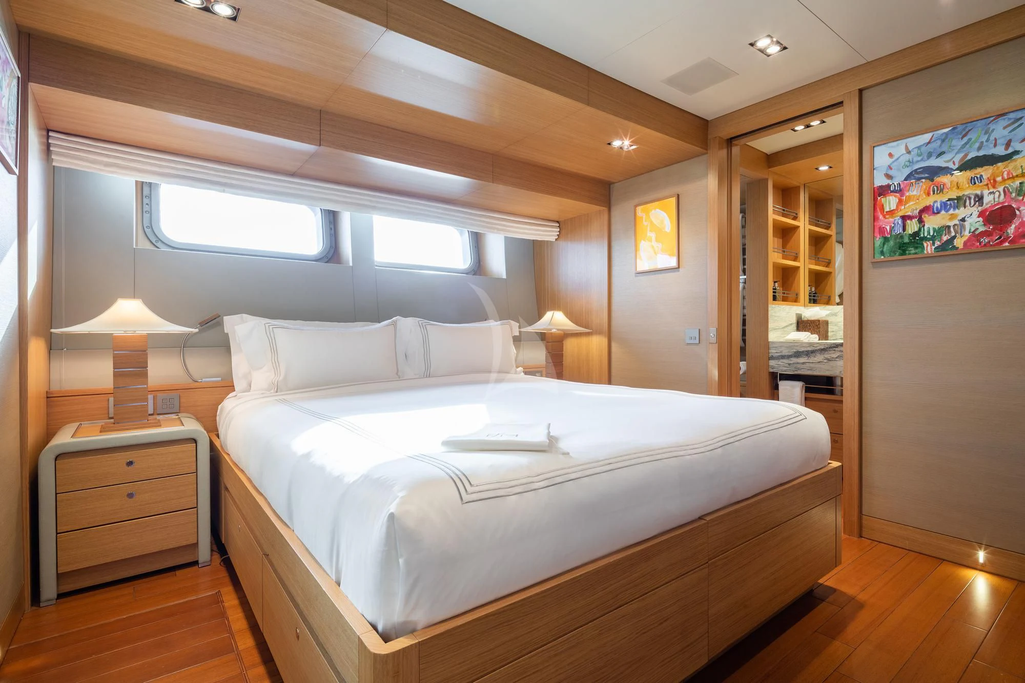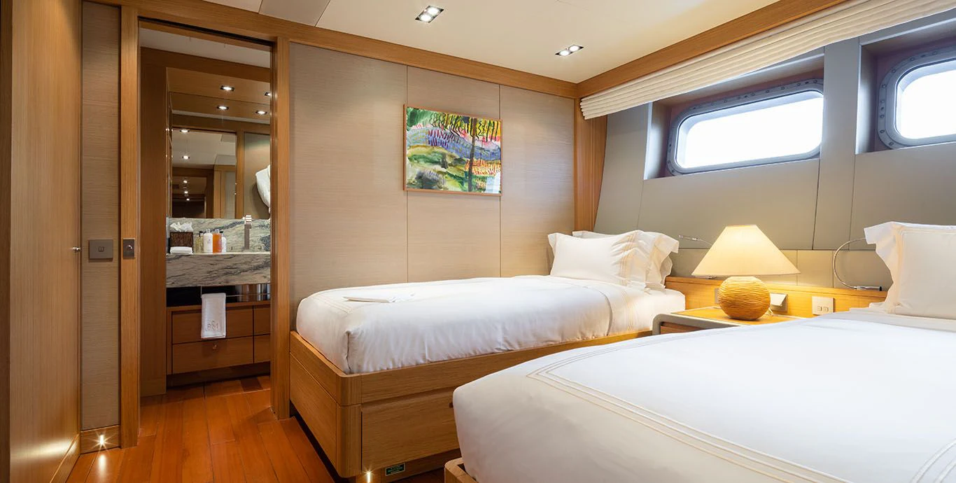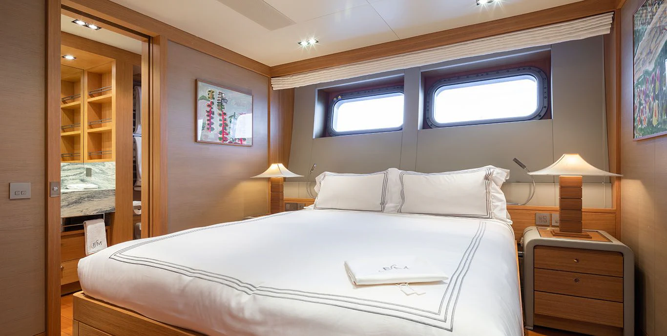 Step inside FALCO MOSCATA and prepare to be captivated by her lavish interior design. Accommodating up to eleven guests across five beautifully appointed cabins, this yacht offers an unrivaled level of comfort and luxury at sea. The master stateroom stands out with its expansive layout, plush furnishings, and state-of-the-art amenities – truly a private sanctuary within the yacht. Each additional stateroom echoes the same level of elegance and comfort as the master suite ensuring every guest enjoys their stay onboard.