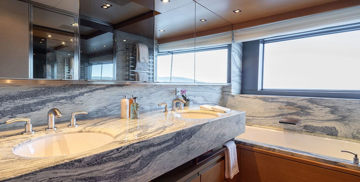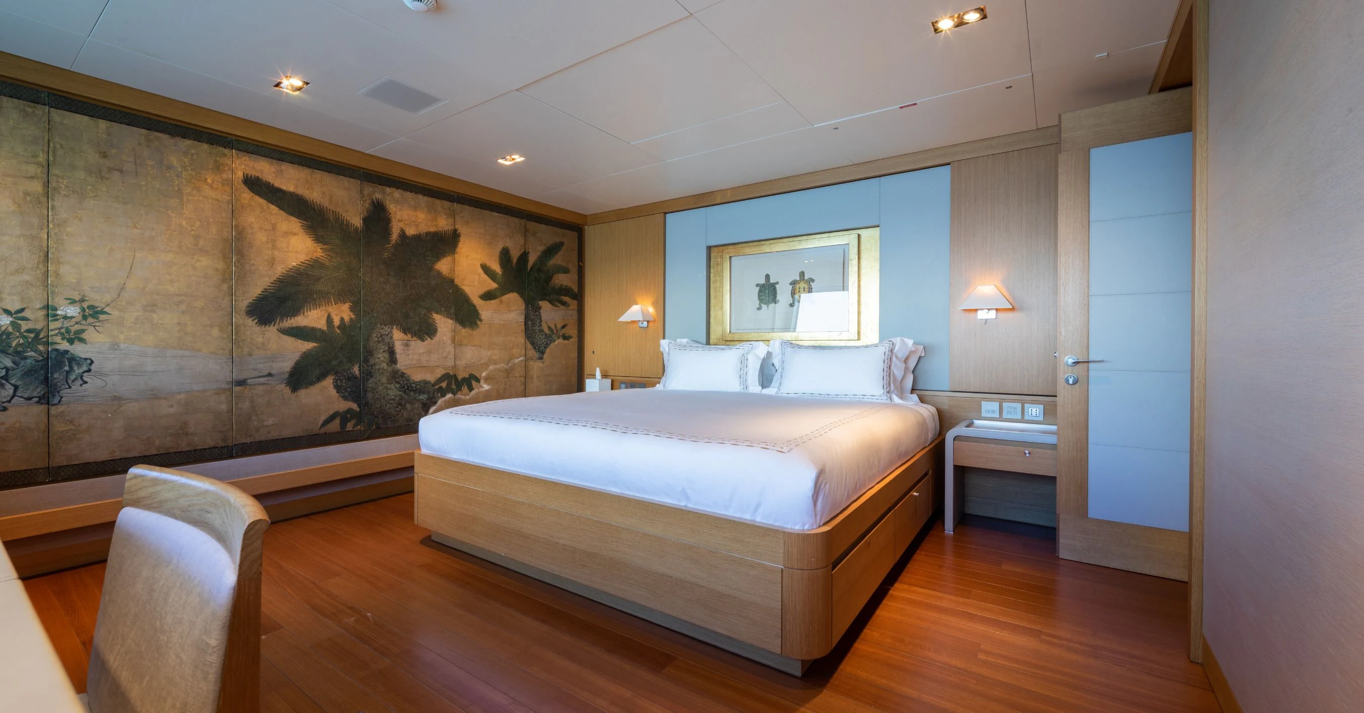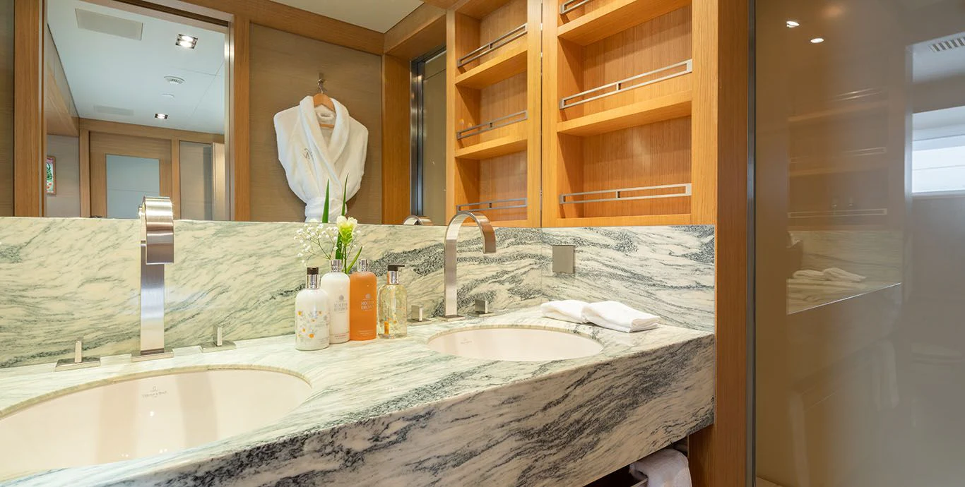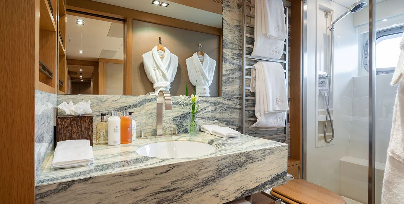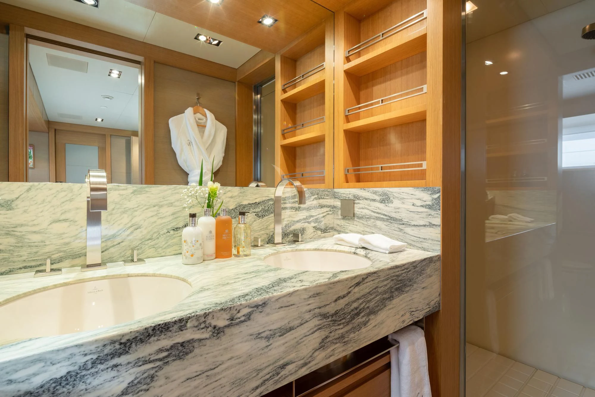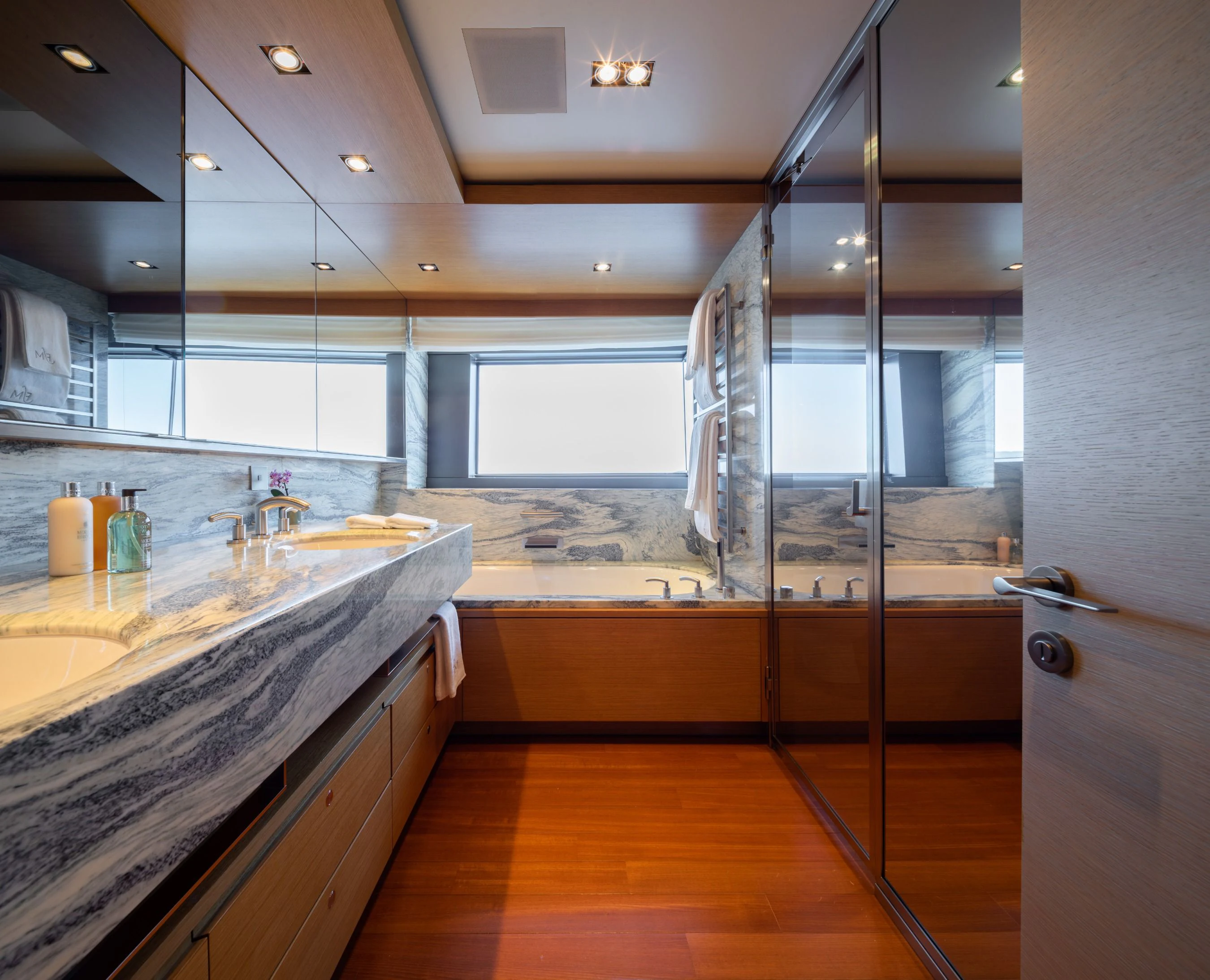 Step inside FALCO MOSCATA and prepare to be captivated by her lavish interior design. Accommodating up to eleven guests across five beautifully appointed cabins, this yacht offers an unrivaled level of comfort and luxury at sea. The master stateroom stands out with its expansive layout, plush furnishings, and state-of-the-art amenities – truly a private sanctuary within the yacht. Each additional stateroom echoes the same level of elegance and comfort as the master suite ensuring every guest enjoys their stay onboard.