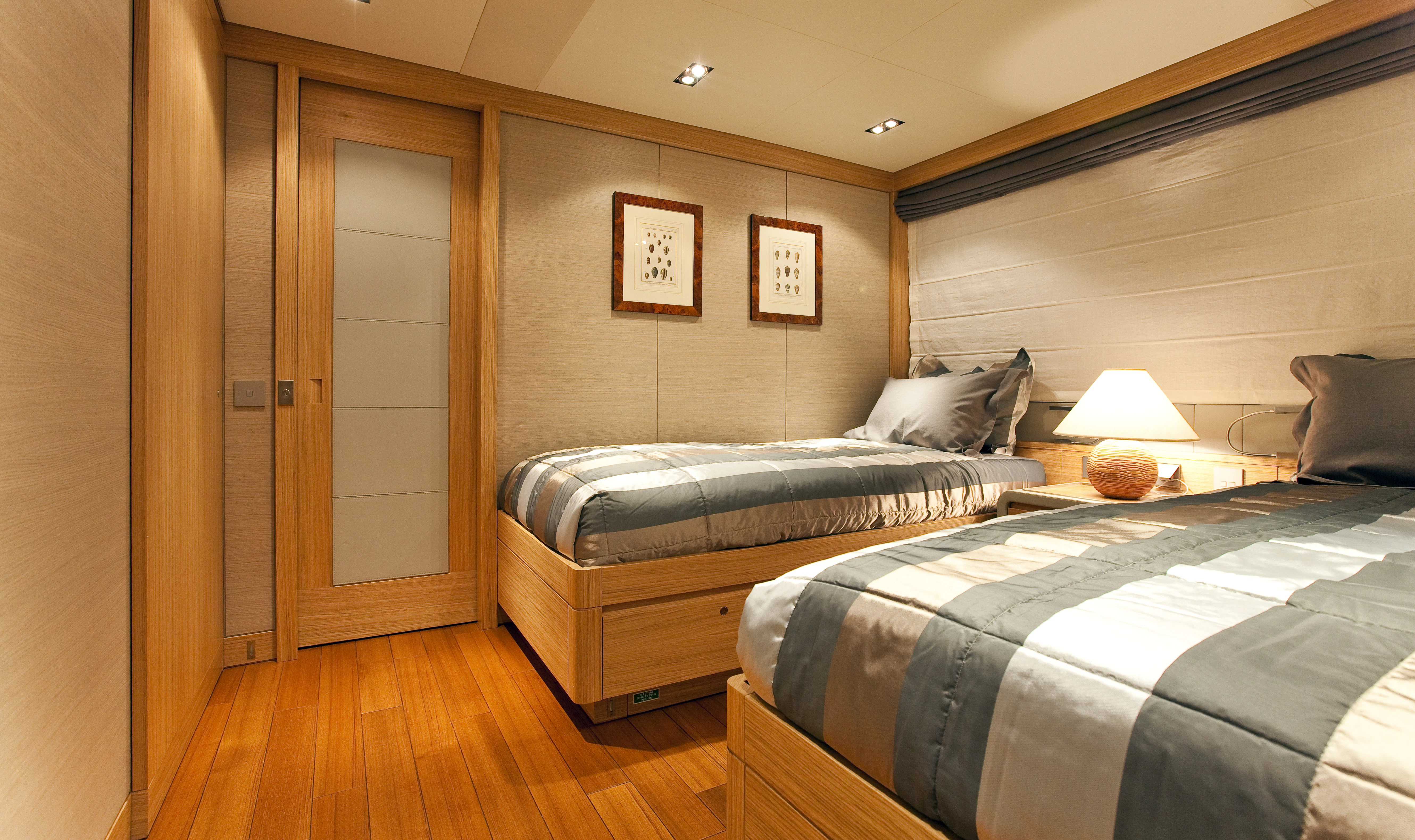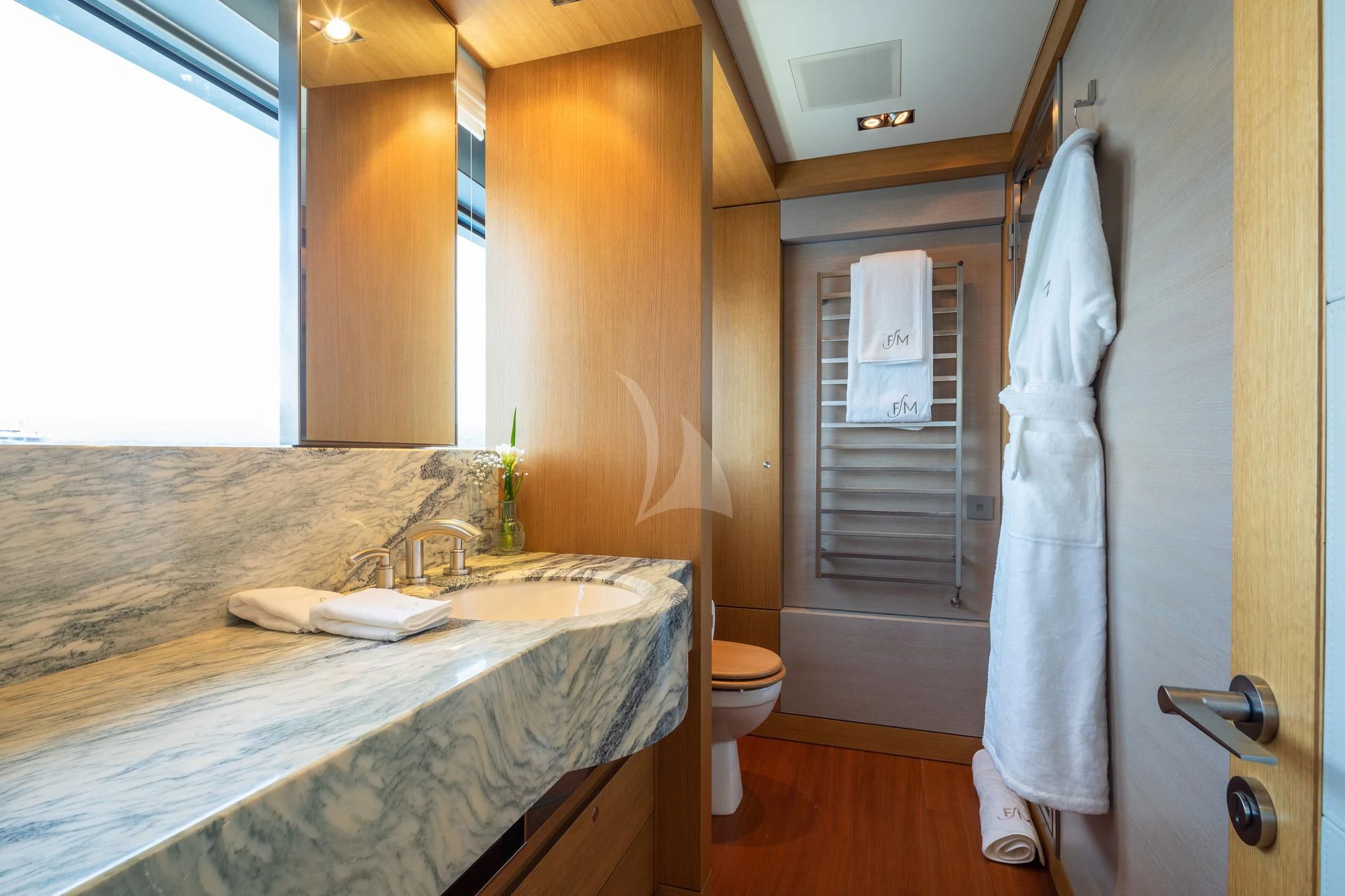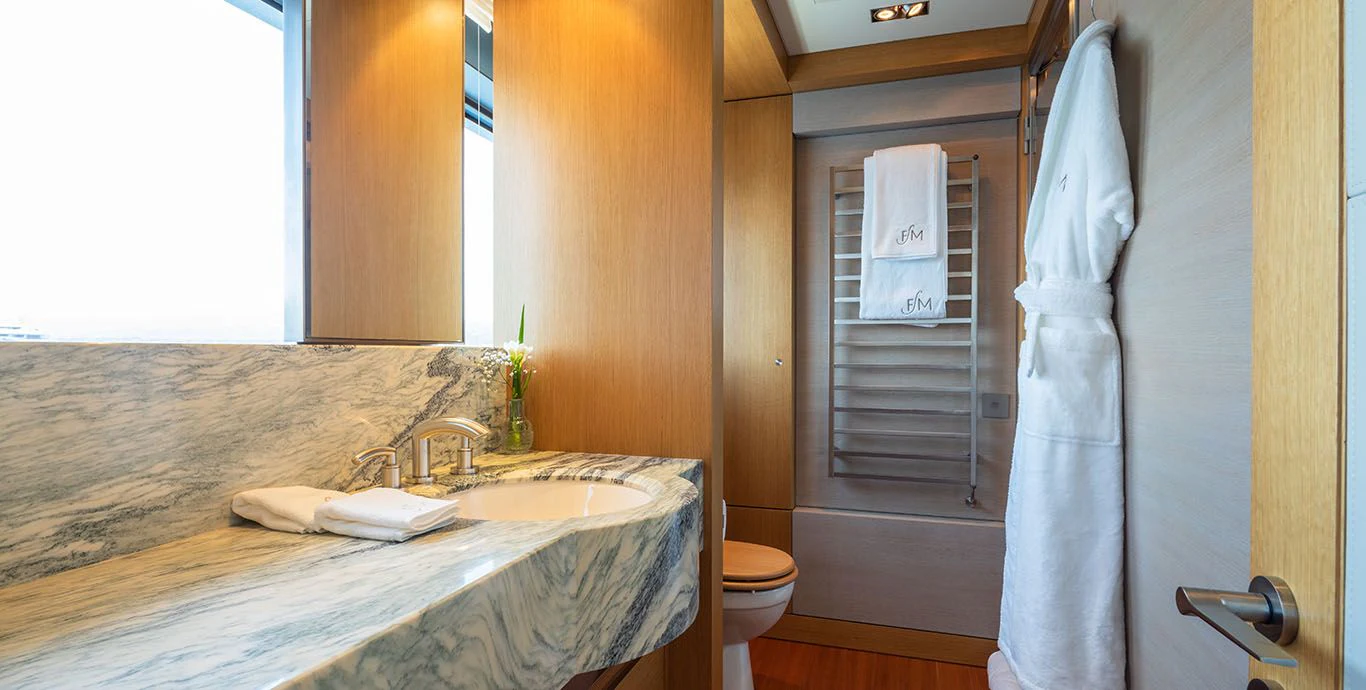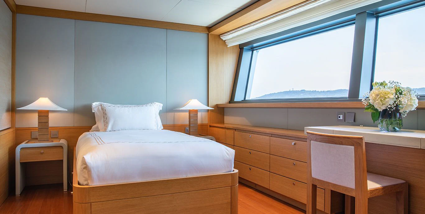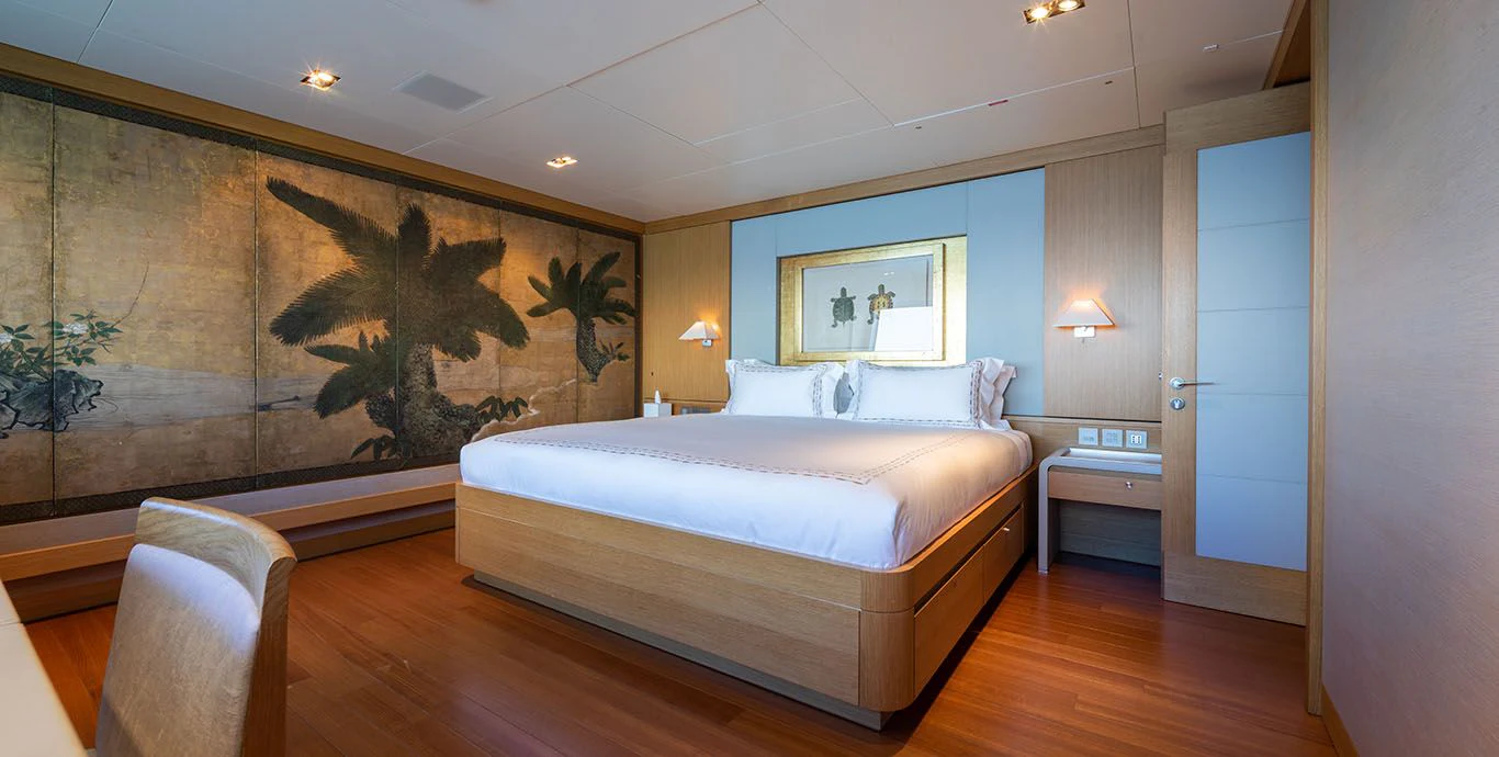 Step inside FALCO MOSCATA and prepare to be captivated by her lavish interior design. Accommodating up to eleven guests across five beautifully appointed cabins, this yacht offers an unrivaled level of comfort and luxury at sea. The master stateroom stands out with its expansive layout, plush furnishings, and state-of-the-art amenities – truly a private sanctuary within the yacht. Each additional stateroom echoes the same level of elegance and comfort as the master suite ensuring every guest enjoys their stay onboard.