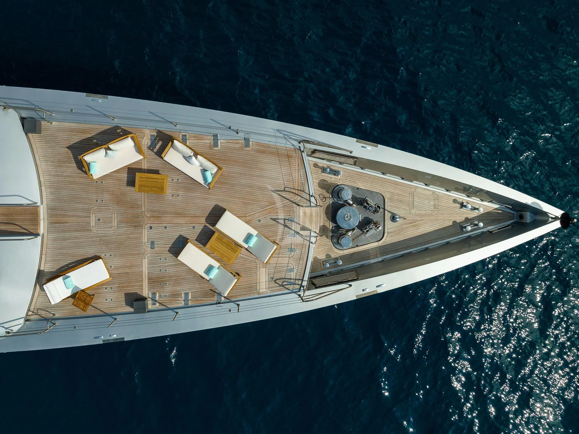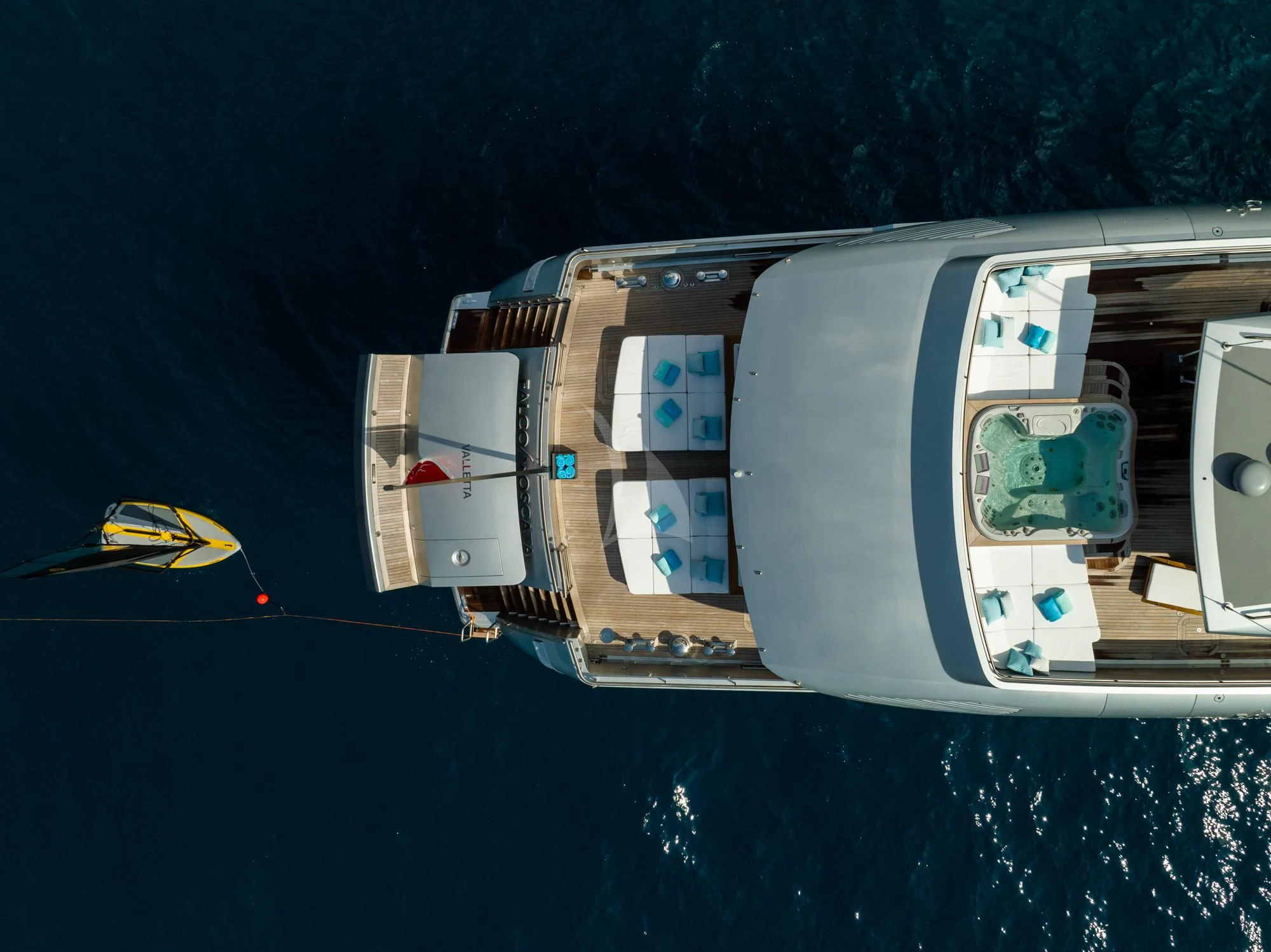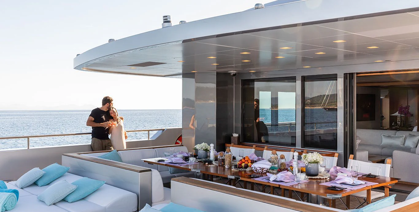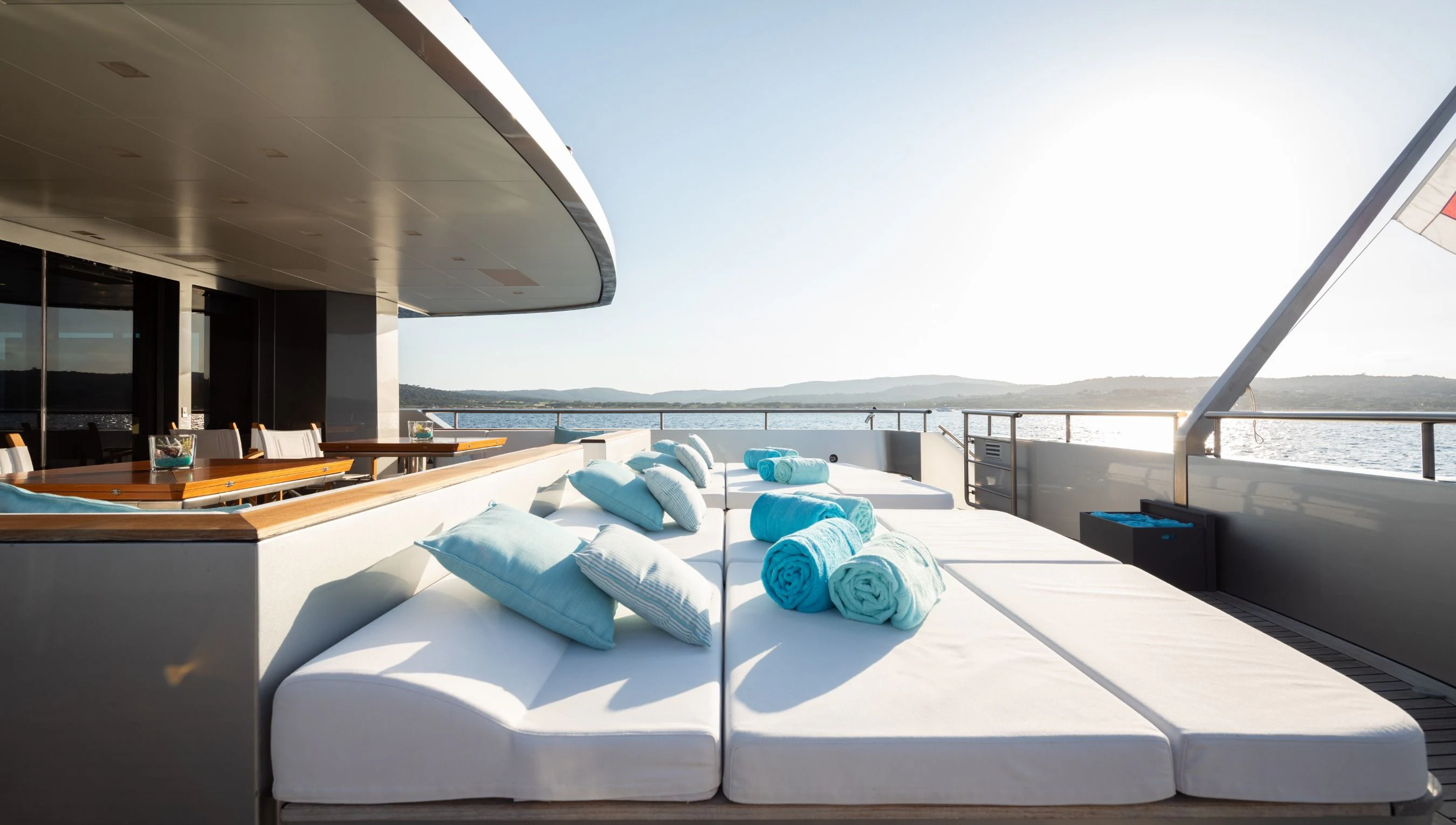 FALCO MOSCATA's exterior design is nothing short of extraordinary. Her sleek lines are reminiscent of classic nautical architecture, while her modern detailing adds an air of sophistication. The sundeck is a haven for sun worshippers, featuring ample lounging space alongside a luxurious Jacuzzi for ultimate relaxation. Alfresco dining areas allow guests to enjoy their meals amidst breathtaking views, while multiple lounging areas provide perfect spots for socializing or simply soaking up the serene surroundings.