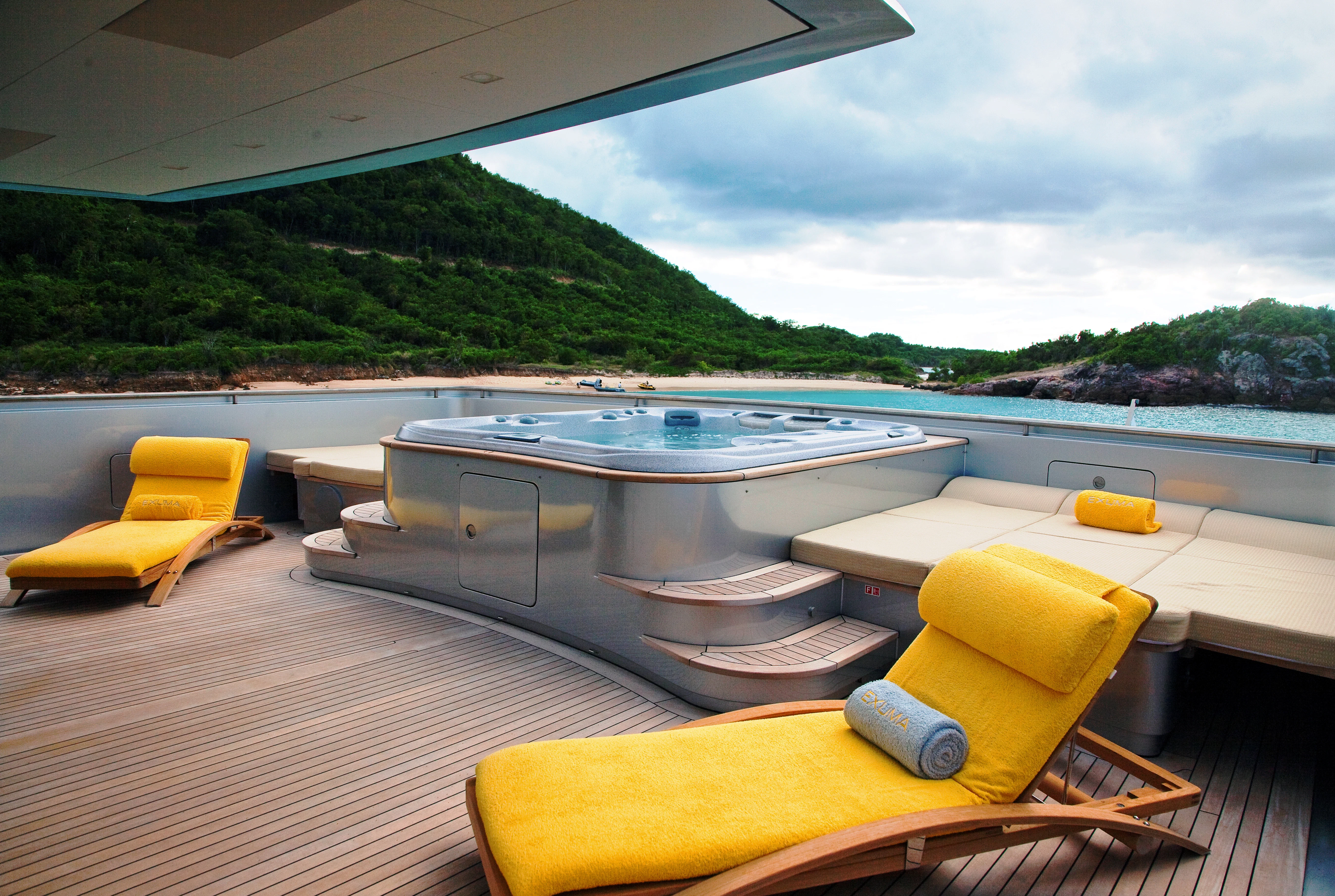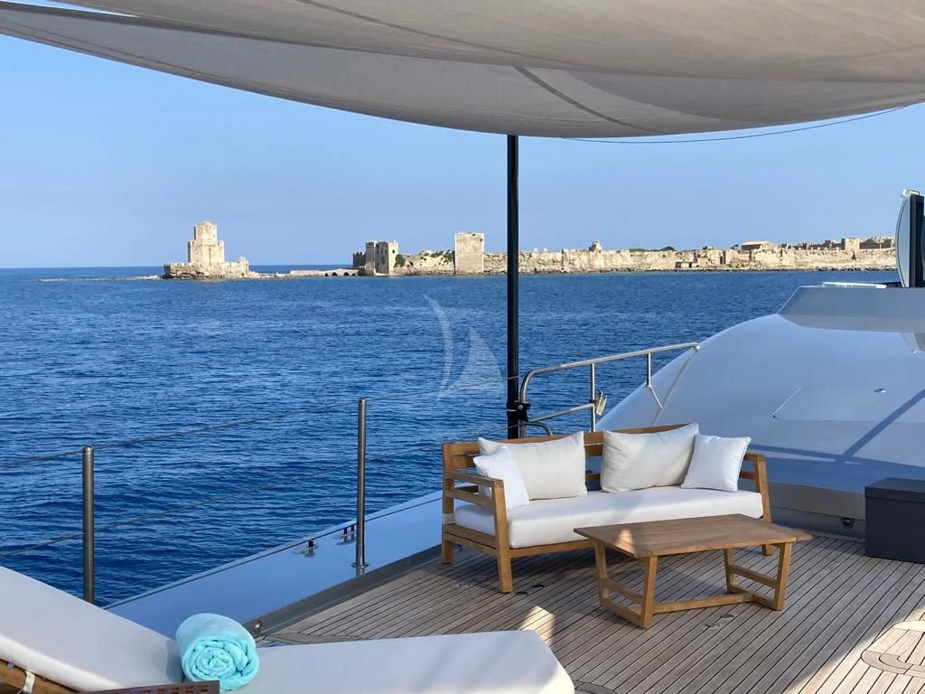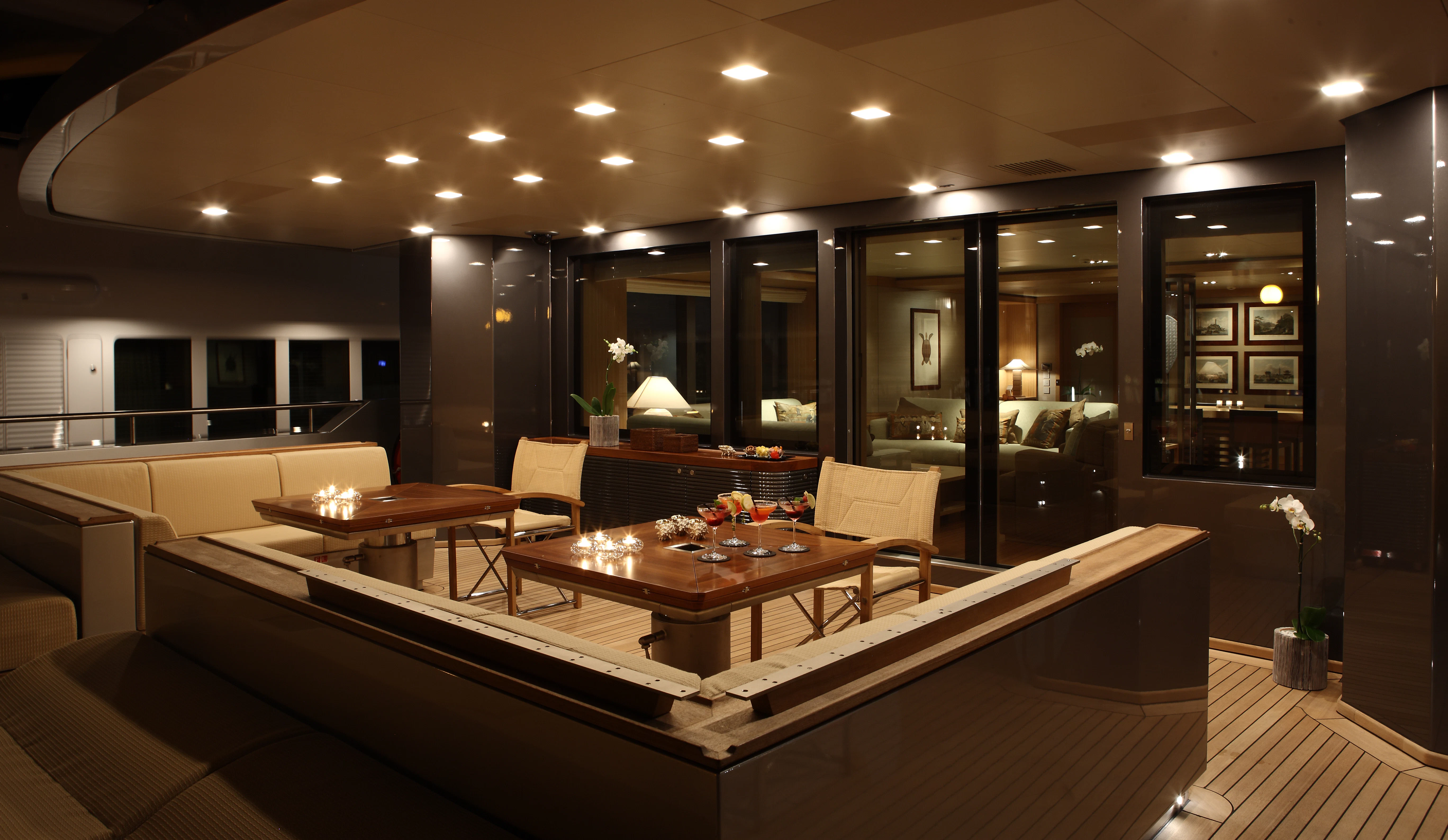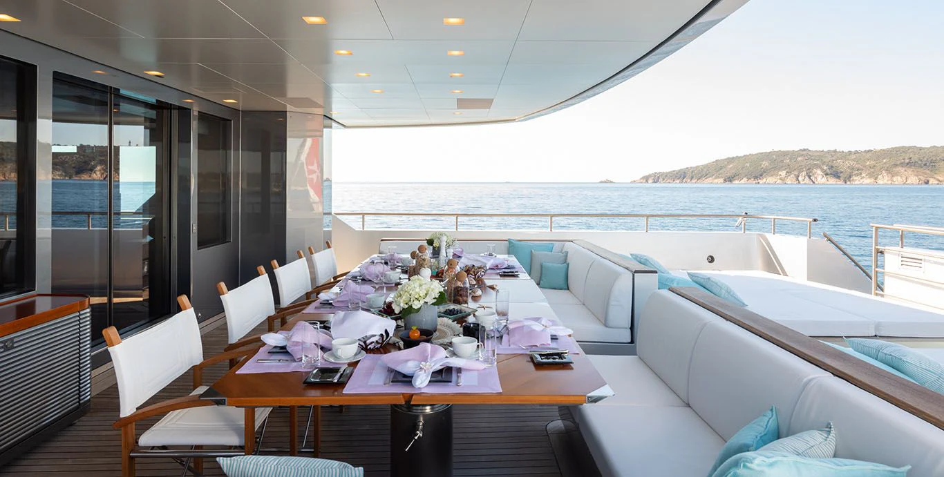 FALCO MOSCATA's exterior design is nothing short of extraordinary. Her sleek lines are reminiscent of classic nautical architecture, while her modern detailing adds an air of sophistication. The sundeck is a haven for sun worshippers, featuring ample lounging space alongside a luxurious Jacuzzi for ultimate relaxation. Alfresco dining areas allow guests to enjoy their meals amidst breathtaking views, while multiple lounging areas provide perfect spots for socializing or simply soaking up the serene surroundings.