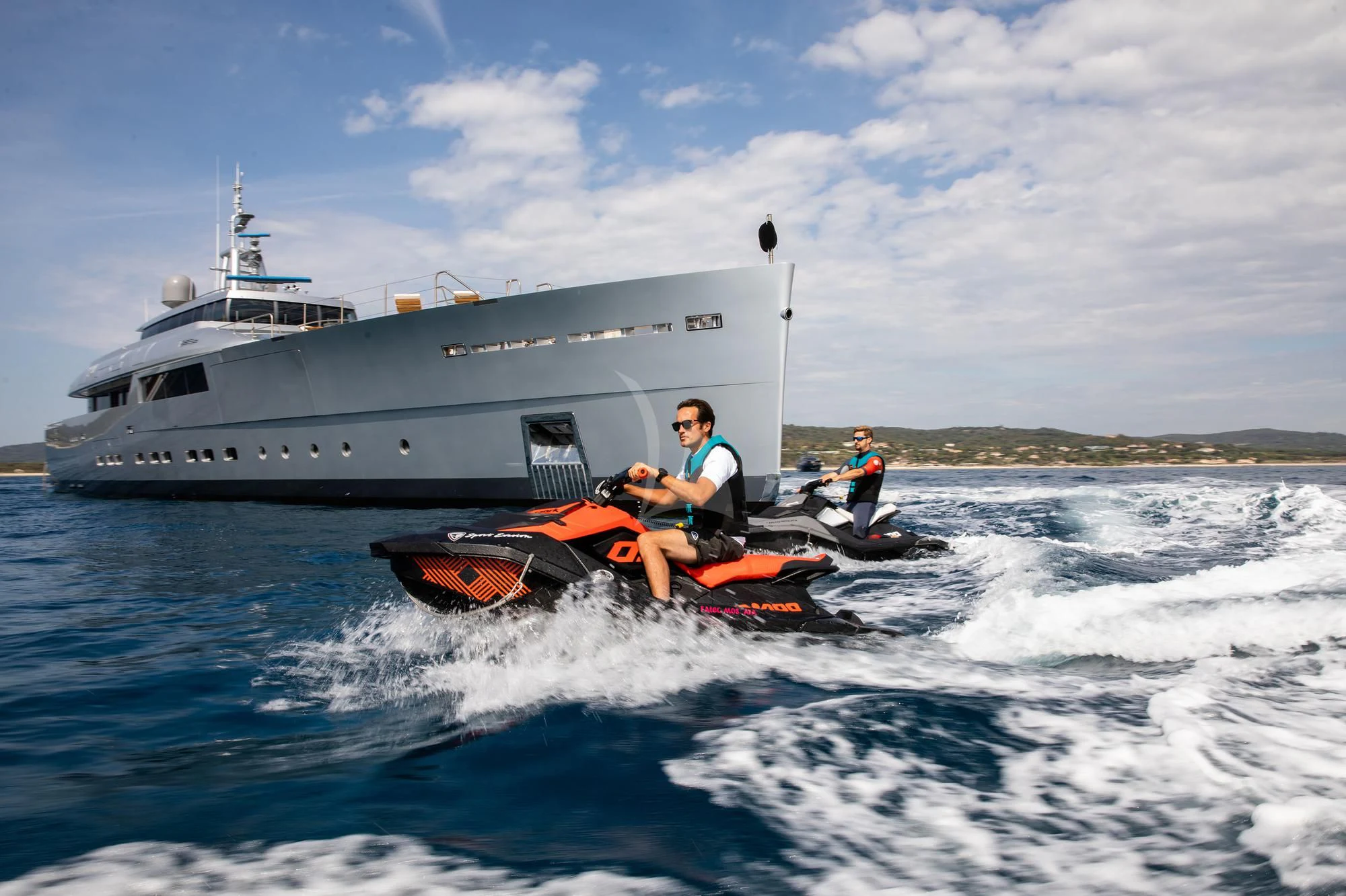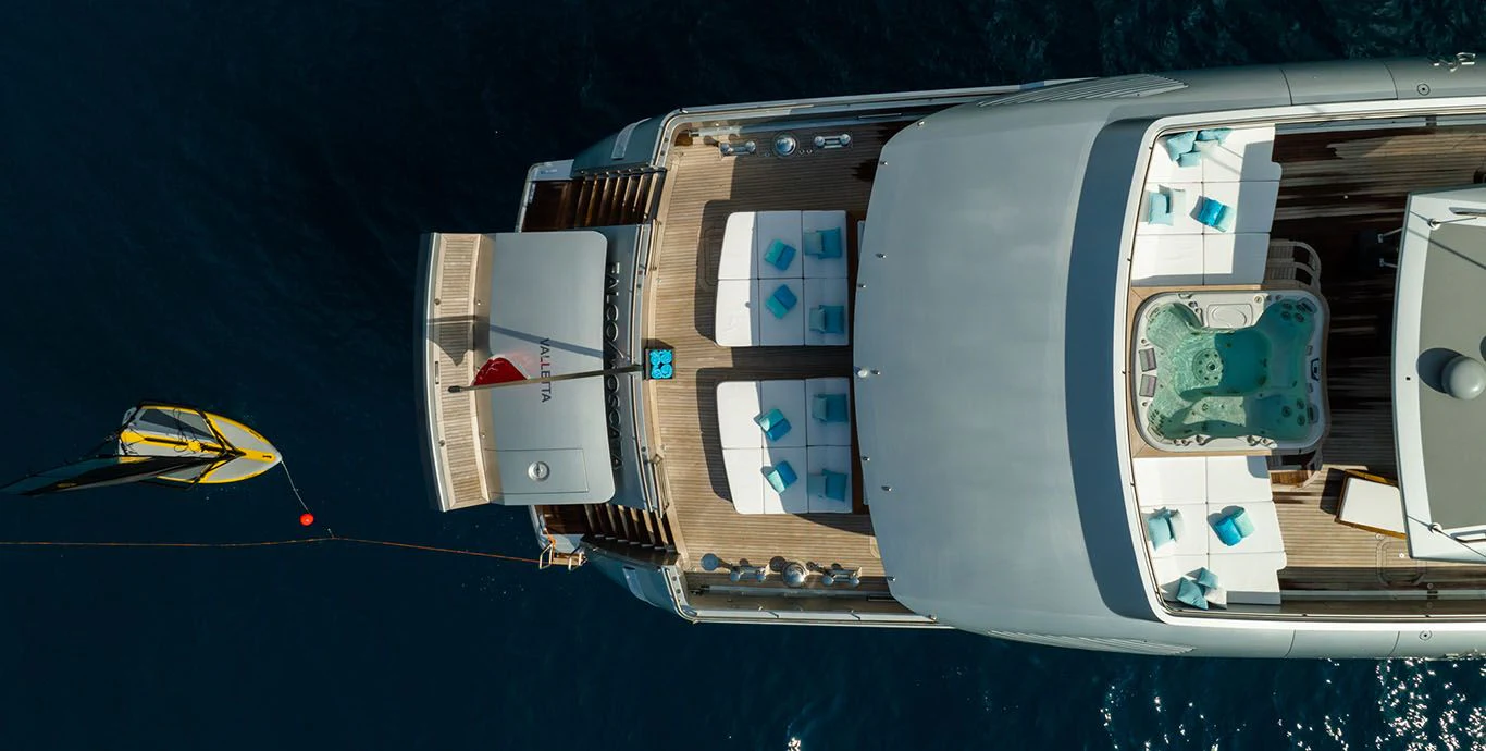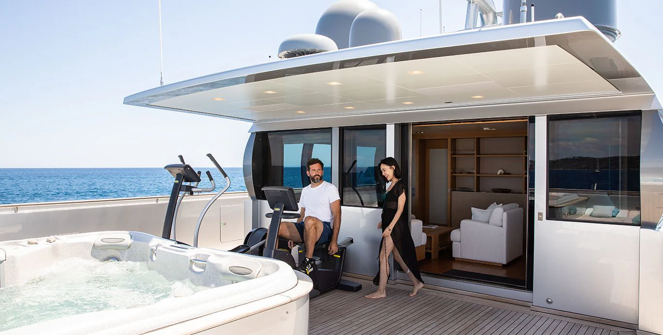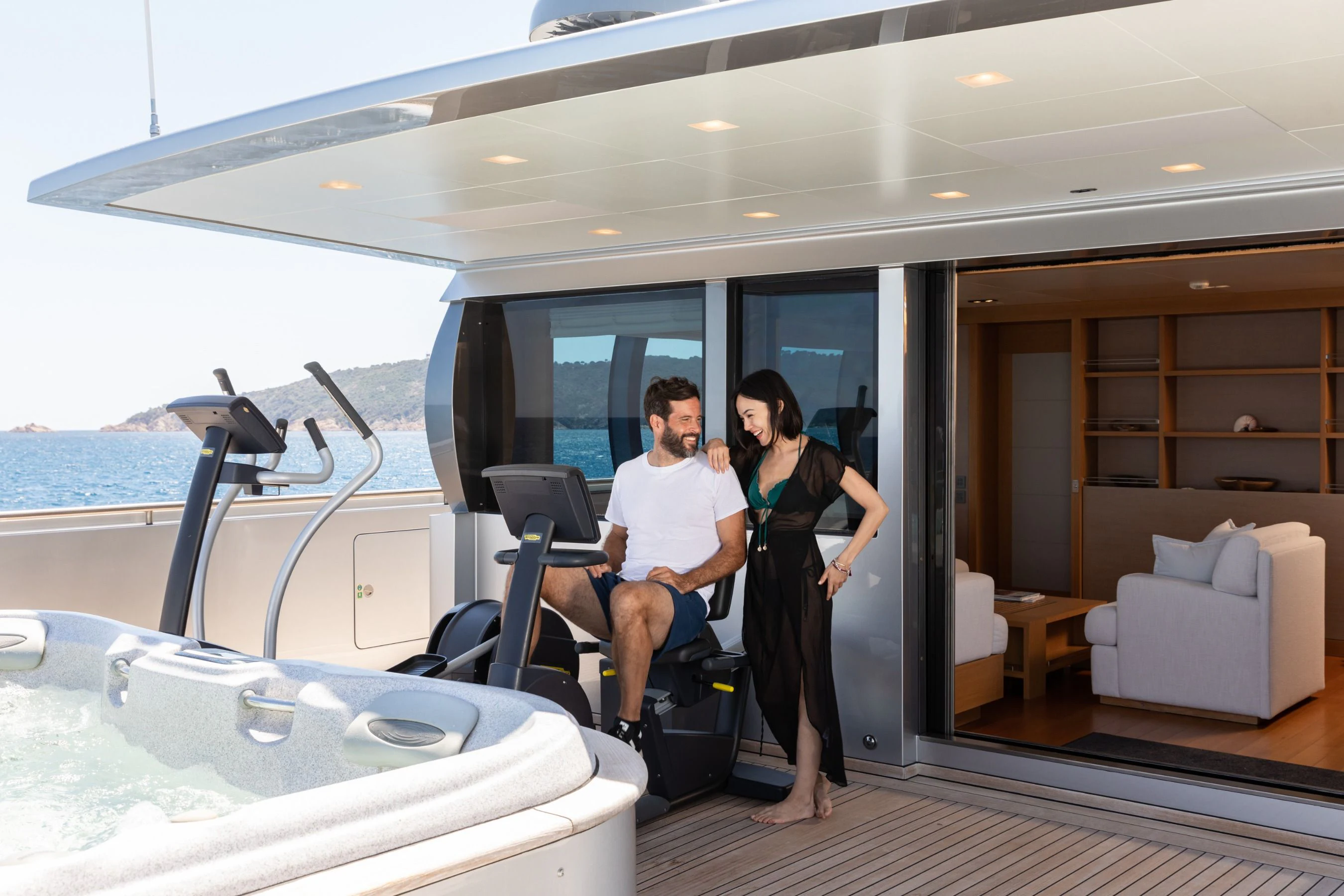 FALCO MOSCATA also houses an array of amenities designed to enhance your yachting experience including a well-equipped gymnasium for fitness enthusiasts looking to keep up with their workout regime even while at sea. Wi-Fi connectivity ensures you stay connected throughout your journey.
