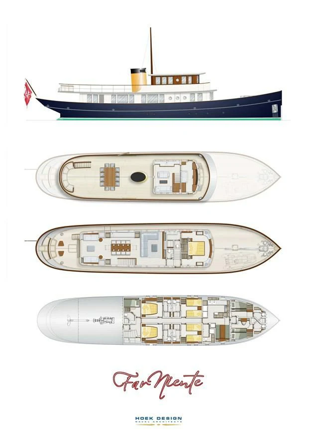 Far Niente was commissioned by an experienced British yachtsman who sought to cruise in more unusual locations and introduce a new concept to the charter fleet. Her exterior lines were inspired by the North Sea Hering Luggers of the 1900s and she bears the elegant proportions that Hoek Yacht Design is famous for. Drawing on advanced fluid dynamics, tradition meets the 21st century with an optimised hull form that improves efficiency and comfort, with enhanced stabilisation underway and at-anchor.