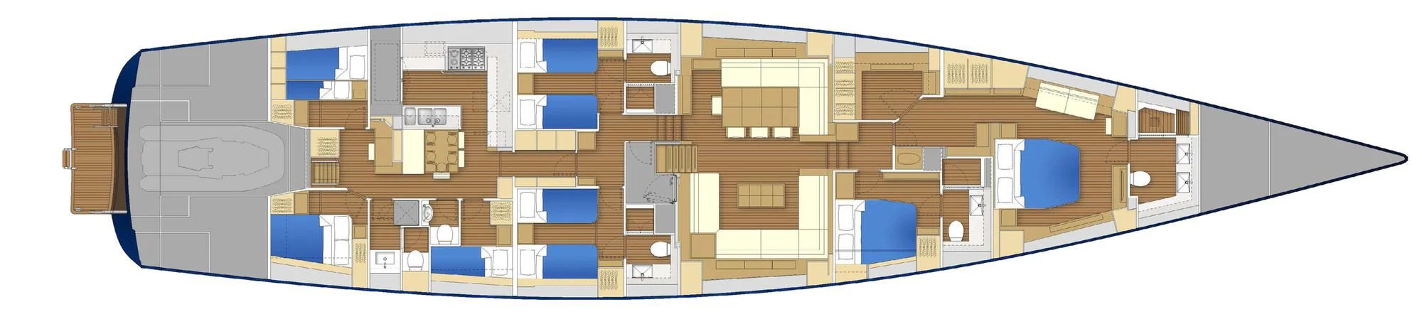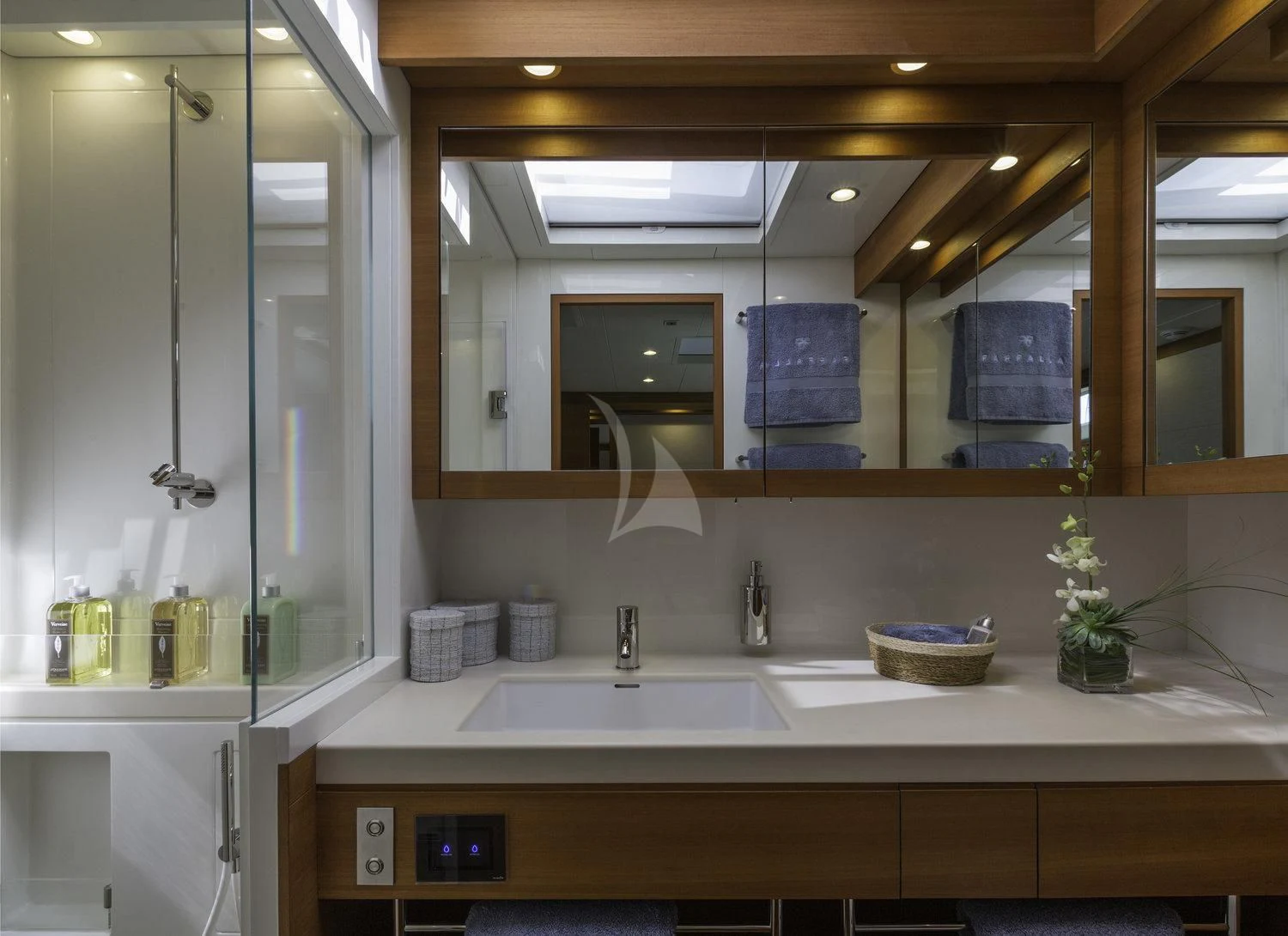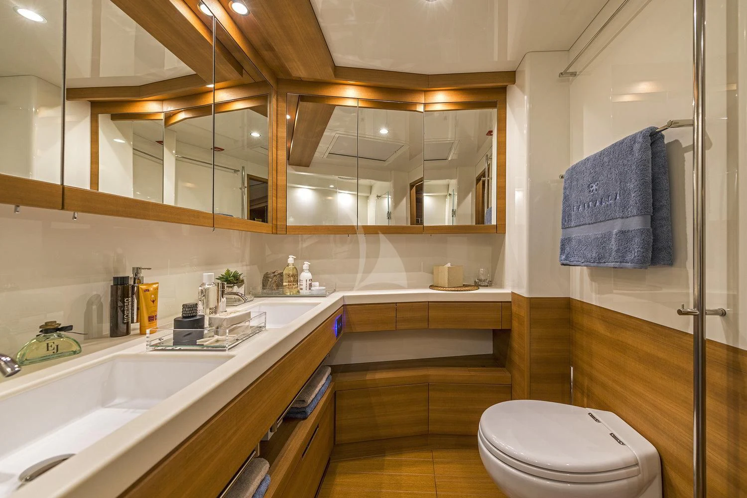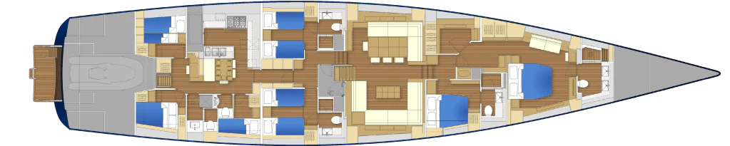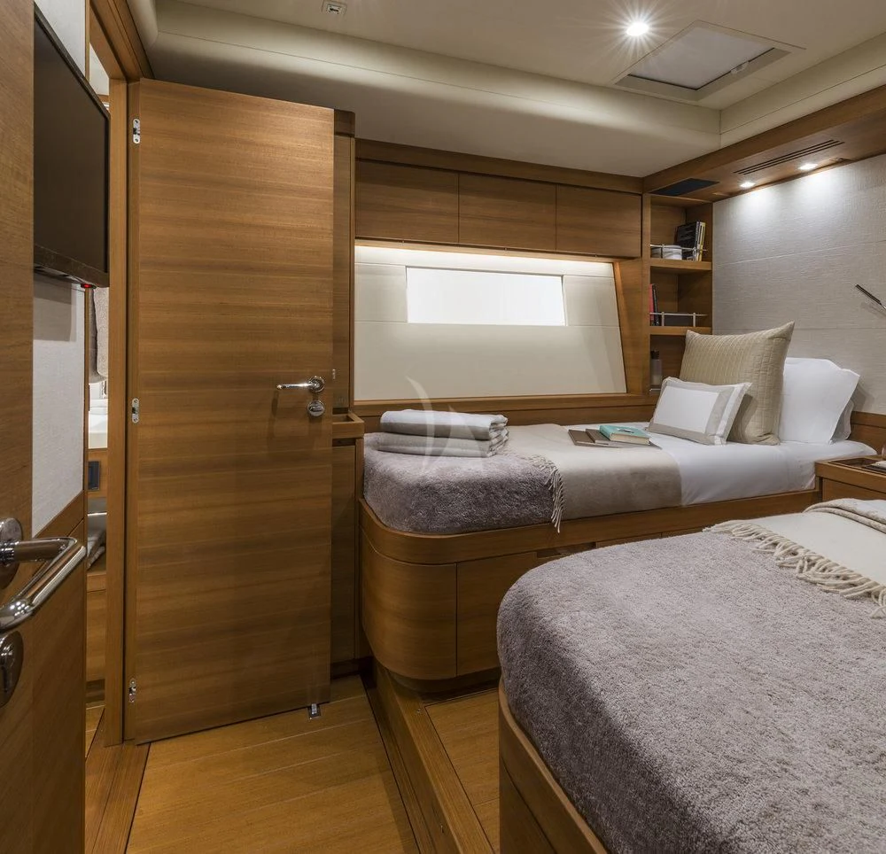 Step inside FARFALLA and be prepared to be swept away by her luxurious interior designed with comfort and elegance in mind. She can comfortably accommodate eight guests across four sumptuously furnished cabins that emanate sophistication and tranquility. The master stateroom stands out with its opulent décor, spacious layout, and top-of-the-line amenities that ensure utmost relaxation during your stay onboard.