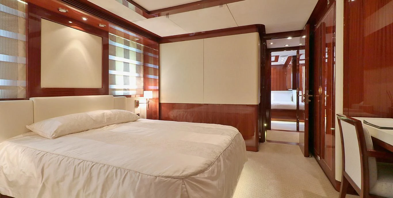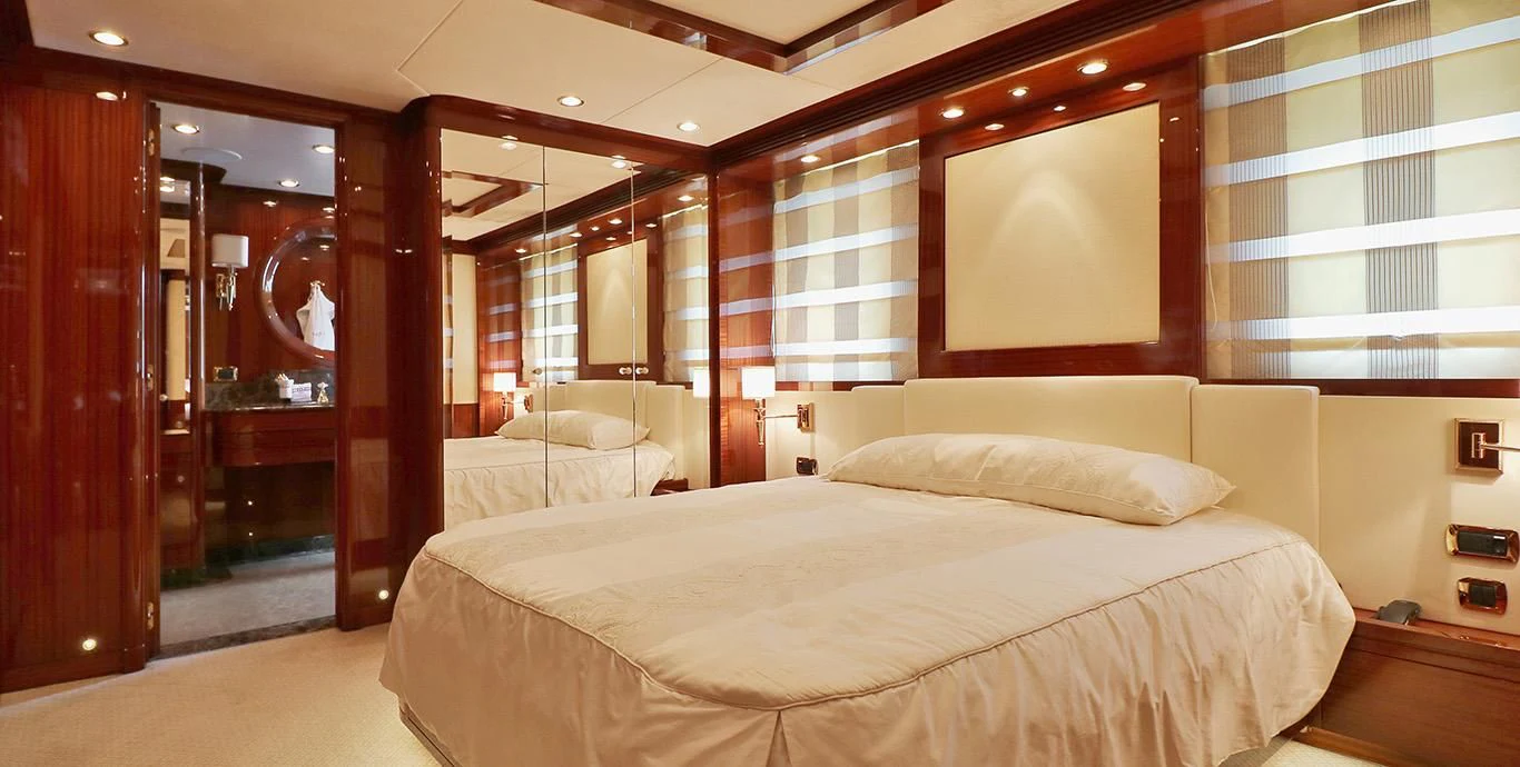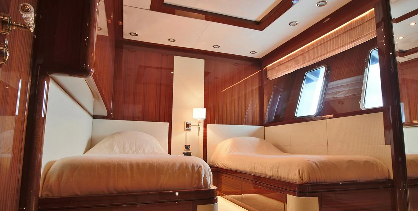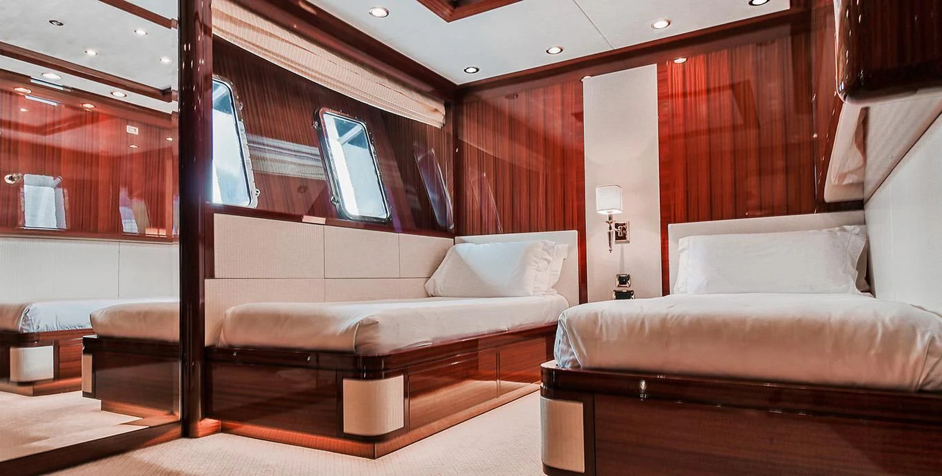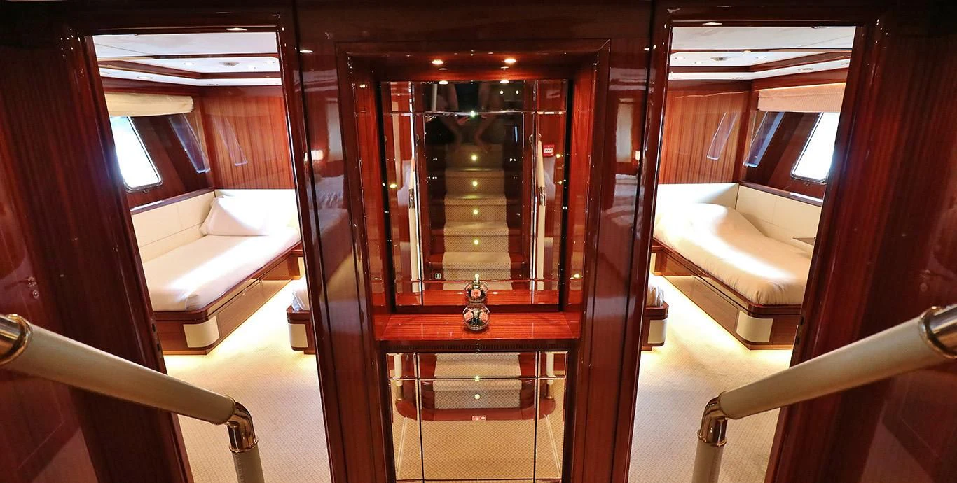 Step inside FORWIN, and you'll be greeted by interiors that are nothing short of breathtaking. Six opulent cabins accommodate up to ten guests in unrivaled luxury while nine dedicated crew members ensure every need is met with exceptional service standards. Each stateroom boasts plush furnishings complemented by a sophisticated color palette that exudes warmth and comfort.