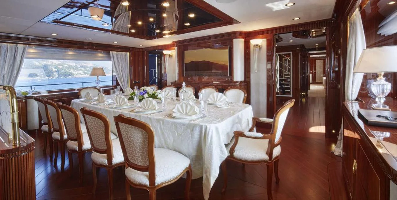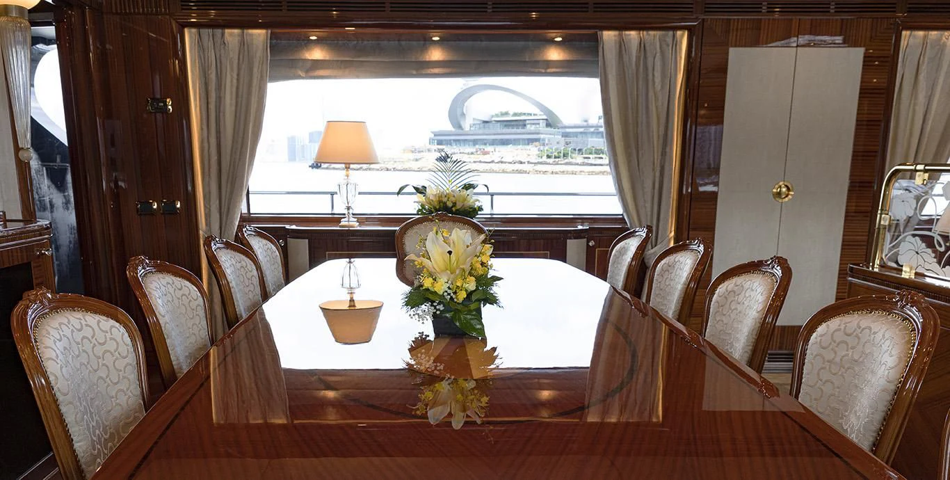 The main salon serves as a hub for entertainment and relaxation with its chic decor punctuated by unique design elements creating an atmosphere that is both stylish yet invitingly cozy. A separate dining area provides an intimate setting for gourmet meals prepared by your private chef.