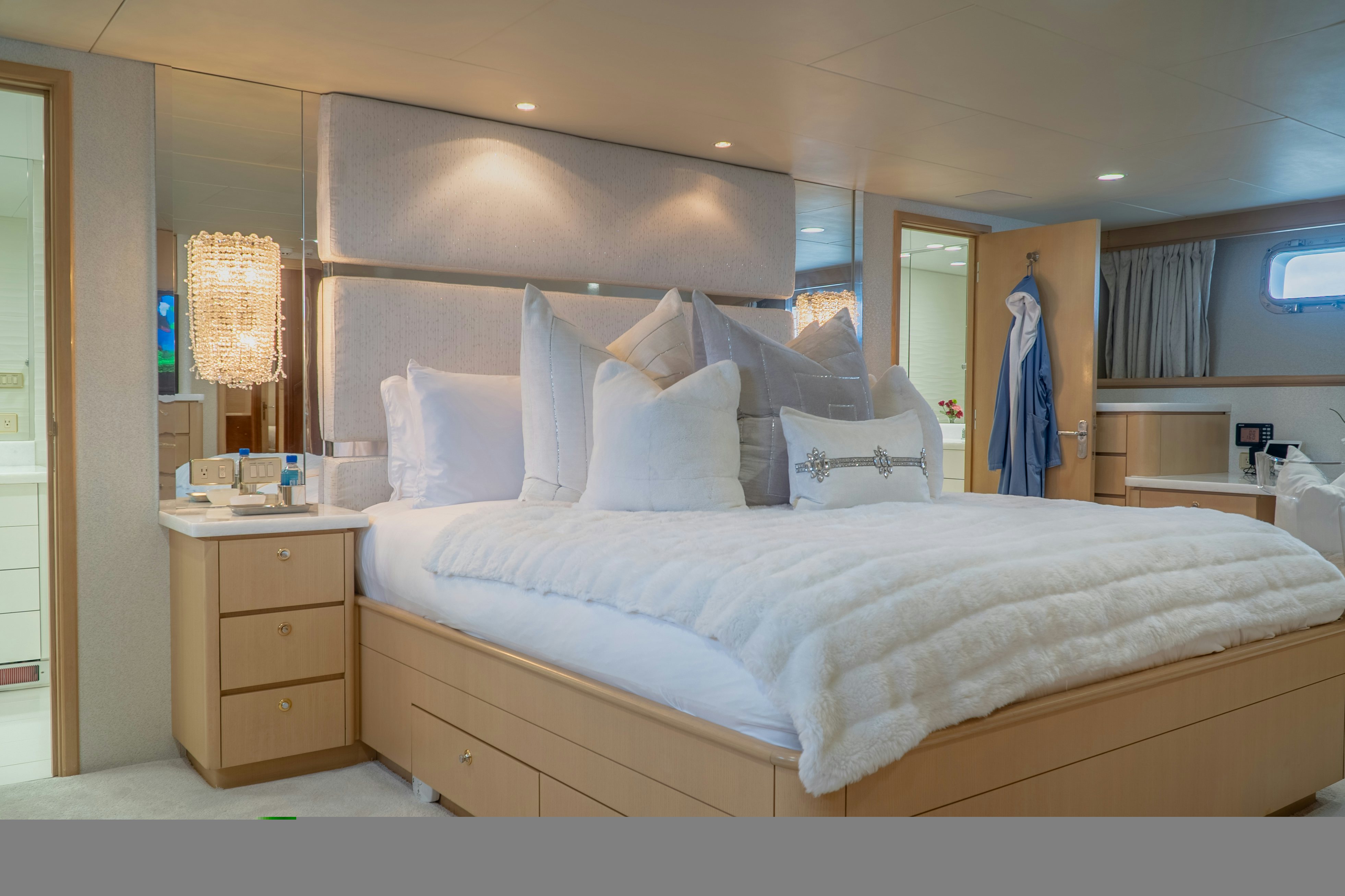 Four beautifully appointed staterooms welcome eight guests onboard. The full-beam owner’s suite is forward on the lower deck with a walkaround king bed, a sofa and a desk. The white marble his-and-her en-suite features separate entrances, connected by a spacious standing shower. GALE WINDS’ additional accommodations include a VIP king cabin on the main deck, a king-size guest cabin and a queen-size guest cabin, all with private en-suites.